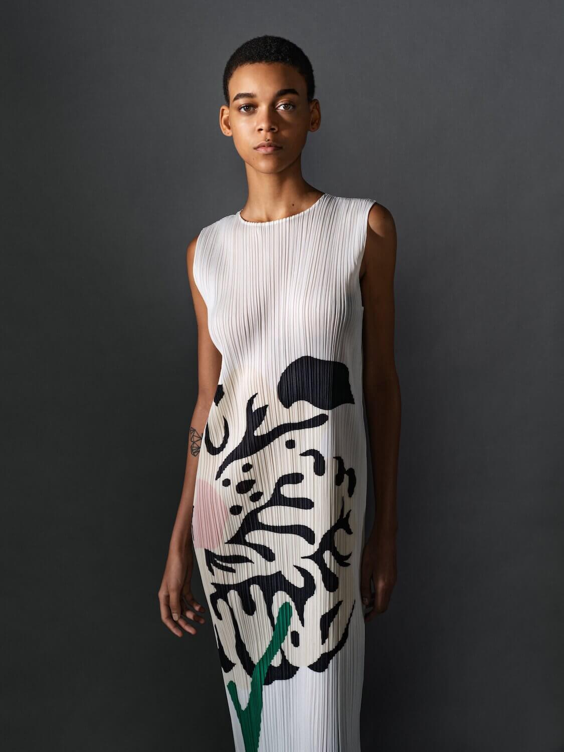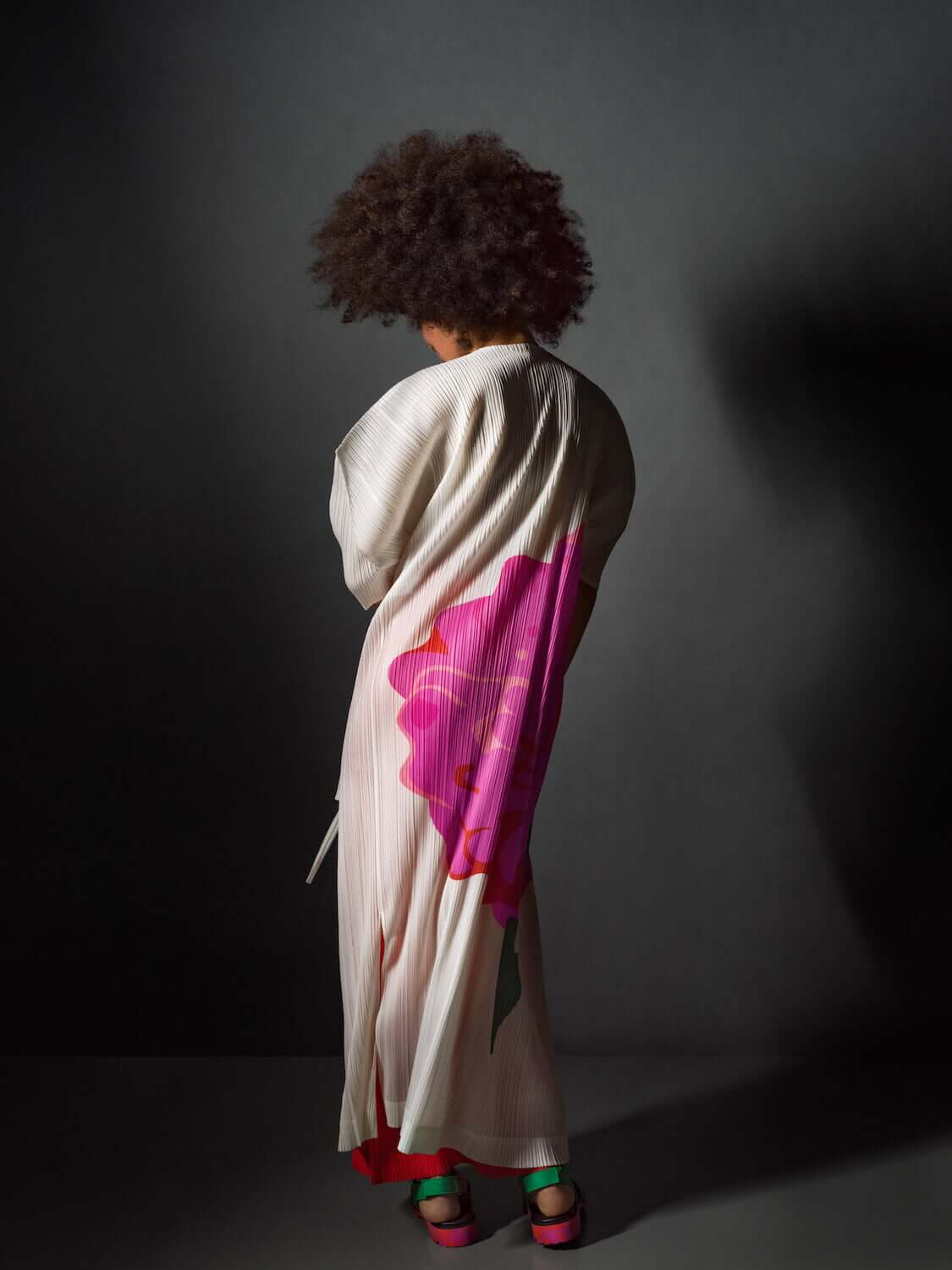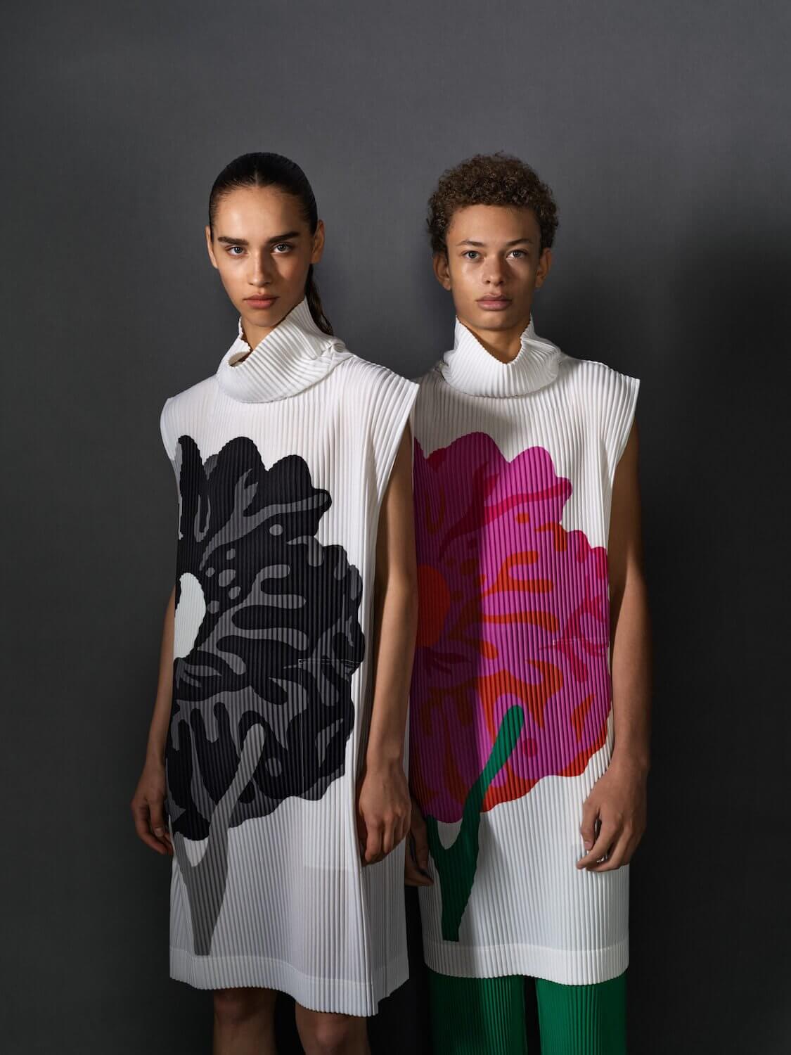 Bold and blooming flowers permeate the signature pleats of Issey Miyake’s latest drop, envisioned by Japanese graphic designer Ikko Tanaka. Since 2016, Miyake has tapped into Tanaka’s peerless and prolific body of interdisciplinary work and now, reaching beyond the effervescent colours and patterns of the artist’s canon, his unique graphic compositions are applied to the construction of the joyful garments. An embodiment of easy, everyday elegance, Tanaka’s sartorial interpretations will be available to buy in-store at Issey Miyake’s London flagship from March 1 and are discoverable online now.