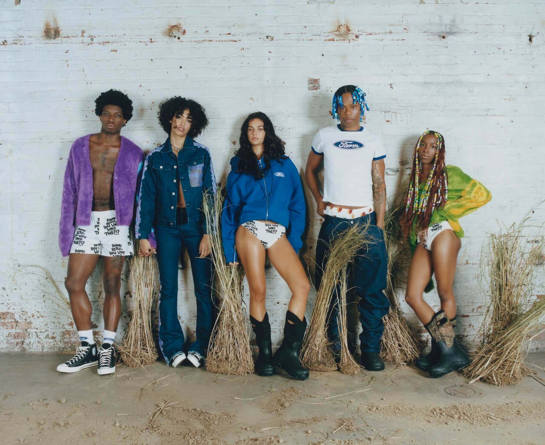 This Wednesday, Sky High Farm Workwear (SHFWW) will reveal its 10-piece collaborative capsule collection with renowned photographer, art director (and 10 Magazine contributor!), Quil Lemons. Entitled Farm Boys Do it Better, a blue and white array of logo shrunken tees, classic zip-ups, a baseball cap and socks pay homage to farming while Lemons’ ultraviolet and lime green designs are inspired by self-portraits from his time spent studying at The International Center of Photography (ICP). The classic silhouettes of Lemons’ own wardrobe inform the collection, too, enriching high waisted denim with unfinished bell bottom flares, jean jackets, and fuzzy, box cut cardigans with graphic swirls and enhanced, tie-dye treatments. Farm Boys Do it Better launches online at SkyHighFarmWorkwear.com, Dover Street Market’s global e-shops and retail locations, and with the brand’s global retail community on February 15.