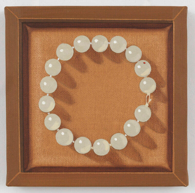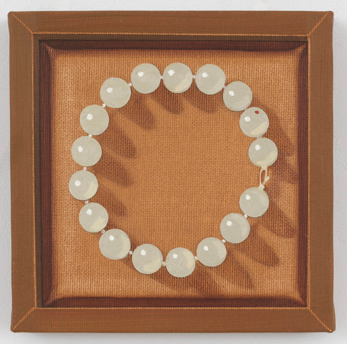 Pearl Bracelet, 2021; oil on canvas, 6 x 6 1/8 x 1 inches (15.2 x 15.6 x 2.5 cm)