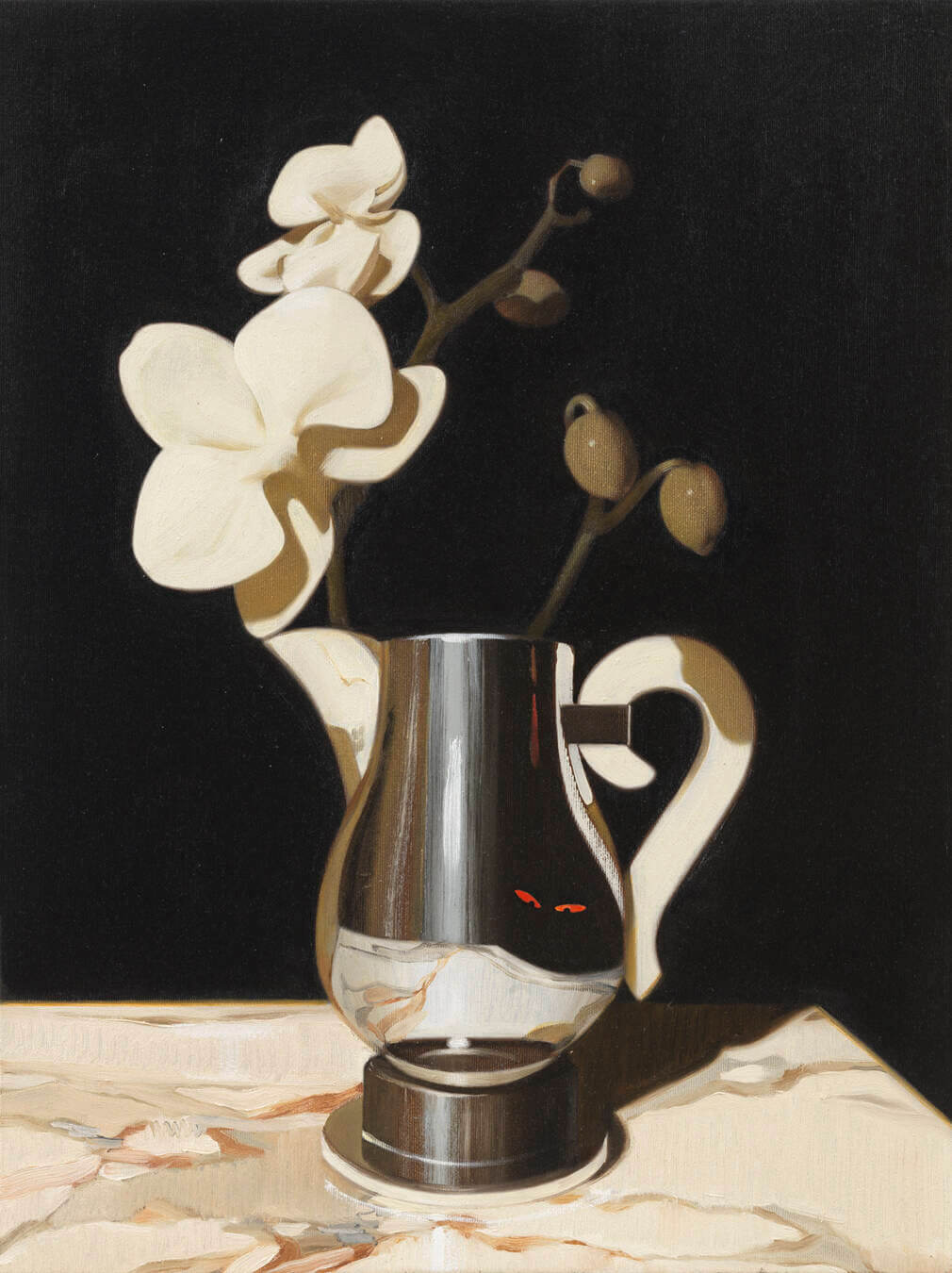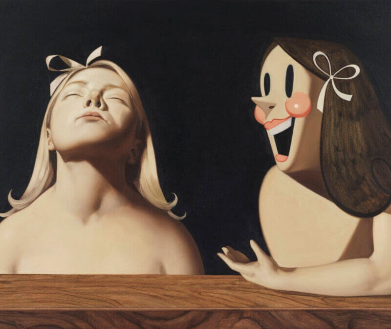 Weyant, who earned a BFA in painting from the Rhode Island School of Design and briefly studied at the China Academy of Art in Hangzhou before heading to New York in 2018, is captivated by the mechanics of light and shadow, specifically how their interplay affects the bodily form. Emotionally, she is thrilled by imperfections, but not literally of course: Her baby-faced heroines – with their soft, silky curves and illustriously porcelain skin – have become her signature. The interest, rather, lurks in the twisted underbelly of human character, where beauty ages into staleness and crass becomes comedy. It’s a quality that is inescapable in even her most fragile still lifes. Weyant started her career painting self-portraits because she felt too uncomfortable asking strangers to join her in this nebulous morbidity, but it was not long before she progressed into intimate painting sessions during which she will spend hours, if not days, sitting beside her muses. Many of these sessions involve provocative gestures or tawdry posing, though Weyant is not so concerned about the sexual gaze as much as the complicated tensions that accompany desire. “I like my figures to be endearing, but also off-putting,” she says. “There’s no straight line and a lot of my work gets messy. [My subjects] are complicated beings.”