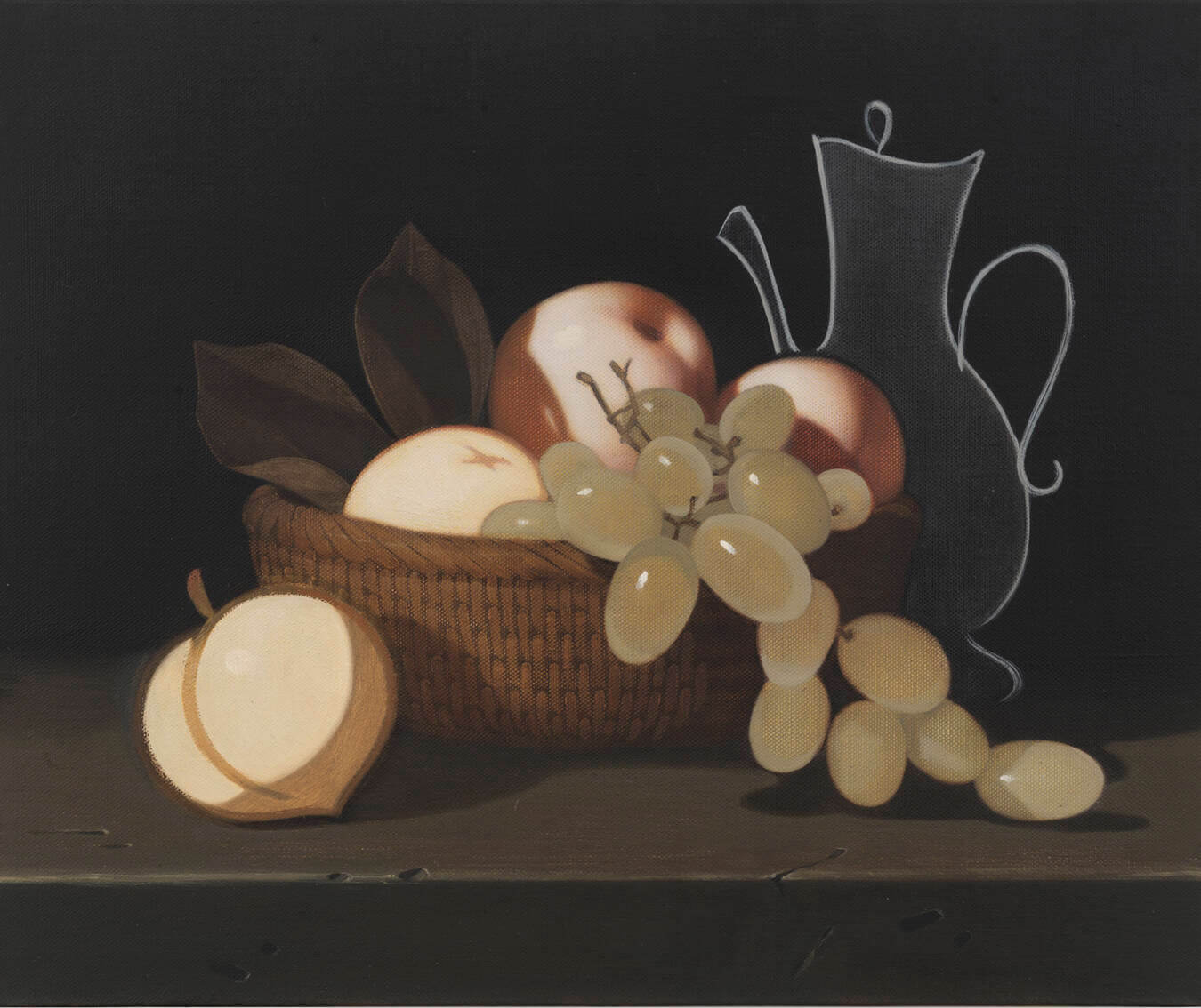 Still Life with Fruit and Vase, 2023; oil on linen, 20 x 24 1/4 x 1 1/8 inches (50.8 x 61.4 x 2.9 cm)