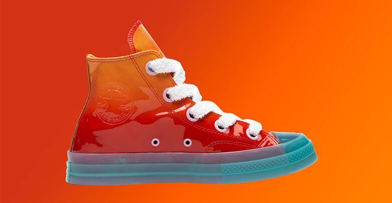 Do you remember your first pair of Converse? Mine was a classic white hi-top All Stars. I wore them every day, on any occasion and despite any weather condition. It’s safe to say they were the first trainers I ever loved. Sadly, that romance – like most others – ended up failing spectacularly. My mum tumble-washed them together with a red sock that went rogue from its pair. The end result? My converse turned a weird, ombré shade of orange, a sunset colourway that I couldn’t bear to see at the time. Fast-forward 10 or so years and I’m kicking myself for not being a forward thinker and throwing those accidentally-DIY one-of-a-kind kicks. Why? Well, just look at the stunning JW Anderson x Converse that just came out. Part of the third capsule collection the two brands have put together, these just-out Tequila Sunrise-shaded vinyl hi-tops are the kind of sunshine everyone needs in their life right now. Add some terry cloth lacing and a semi-transparent blue rubber sole, and you’ve got yourself the kind of footwear that will look perfectly appropriate both at a warehouse rave in Hackney Wick, and then at the Sunday brunch on the Regent’s canal the day after. Am I just projecting? Probably, but I bet I’ll see you at the Toy (named after the collection) pop-up shop dedicated to this fab collab which is running over the weekend at 20 Beak Street in London’s Soho. We can grab some 2-4-1 cocktails after!