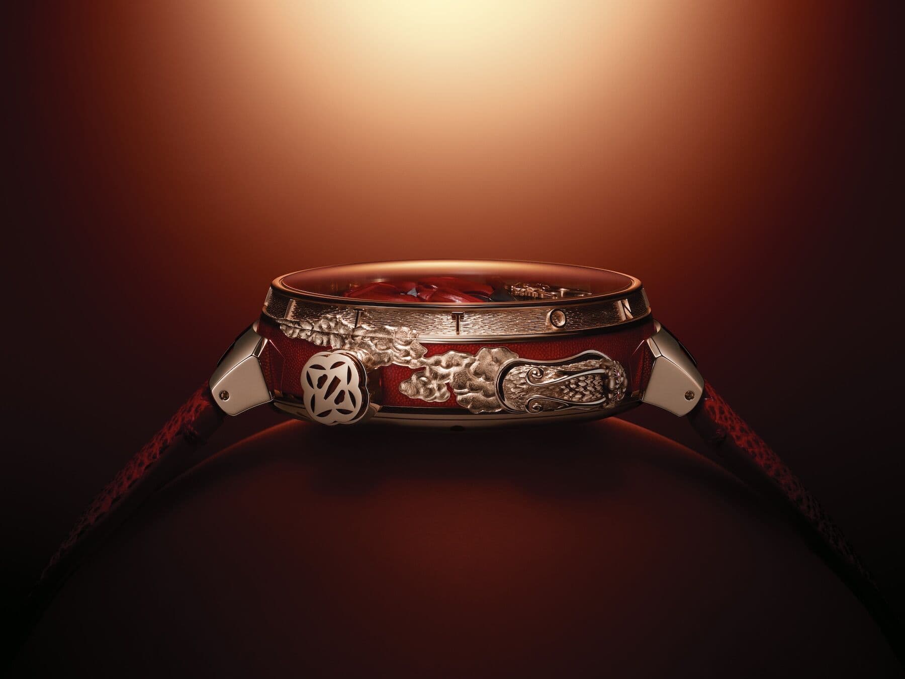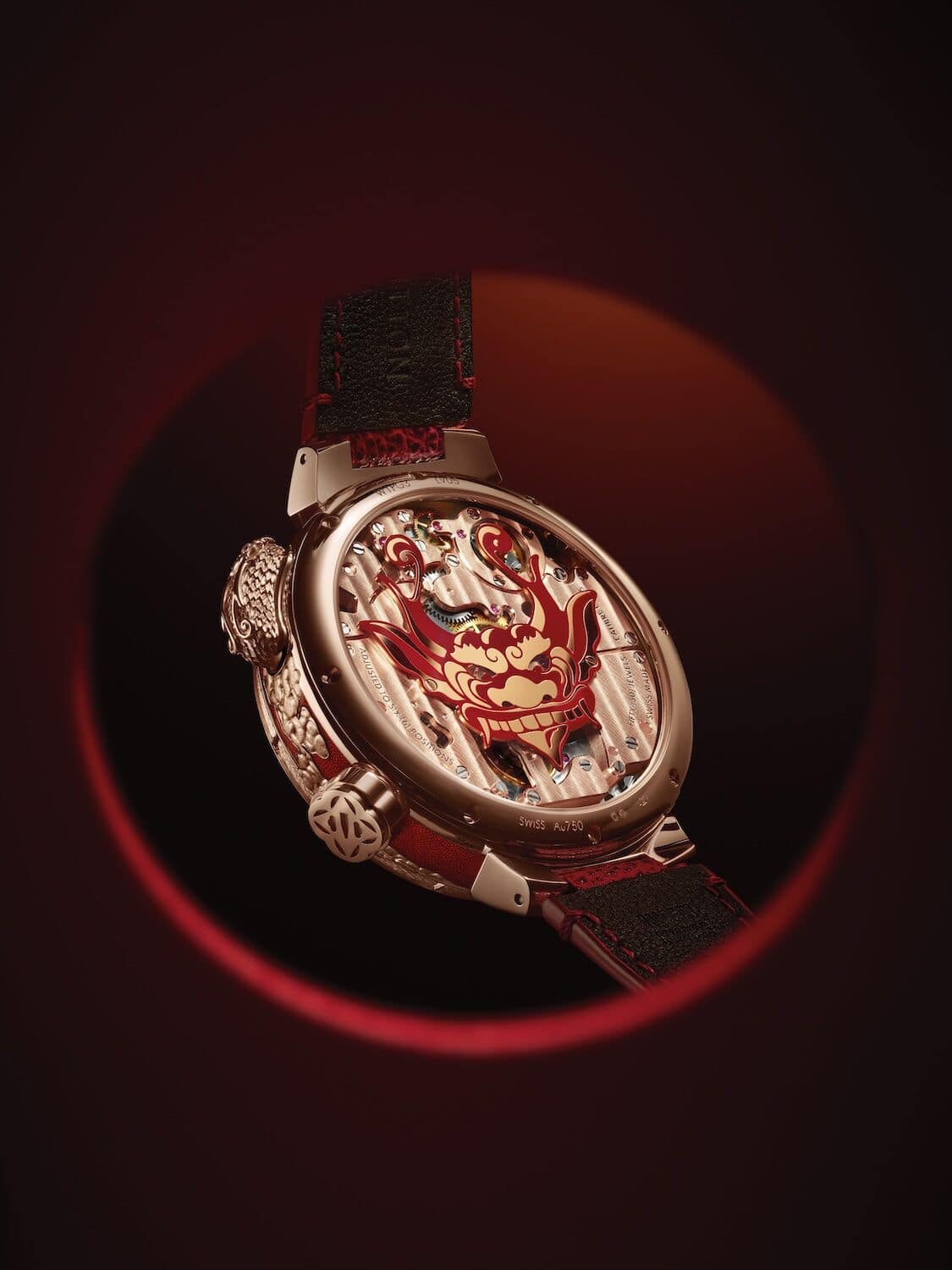Like a 16-second mechanical performance, this watch ticks through a theater of precision and emotion starring a Samurai mask that actually changes its expression – yes, you read that right. At its core: the manual-winding LV 525 caliber, made of 426 components and boasting five animations. Push a button and the dial ignites into life. A yokai – a mythical creature – springs aside to reveal the jumping hour. A katana sword slices through the minutes in a retrograde arc. The Samurai’s mask tenses, the eyes narrow and the jaw cracks open to reveal a single word: ‘Bushido’, glowing in blood-red kanji. It’s a mechanism of pure power.