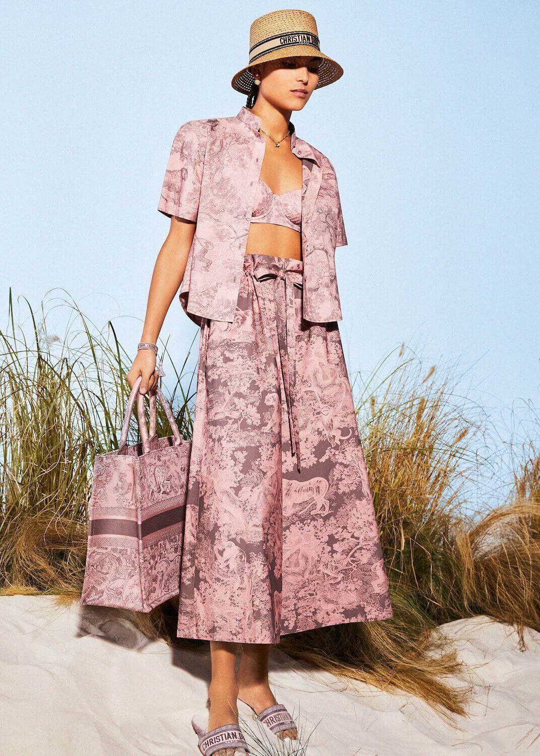 Embracing the core elements of the house, a romantic tapestry of ready-to-wear, leather goods, shoes and accessories unfurl in lovely pastel pinks and muted greys. Skirts, dresses, shorts and swimsuits are indicative of Mediterranean elegance and are underscored by marinières and straw hats for a touch of nautical charm. A newfangled toile de Jouy, entitled Toile de Jouy Sauvage, is revealed in a luxuriant version where tigers, monkeys and reptiles dance across silk scarves, iconic bags – such as the Lady Dior, Dior Book Tote and the lining of the new Lady Dior Wicker – and fabulous footwear like the Dway mules and J’Adior slingback pumps.