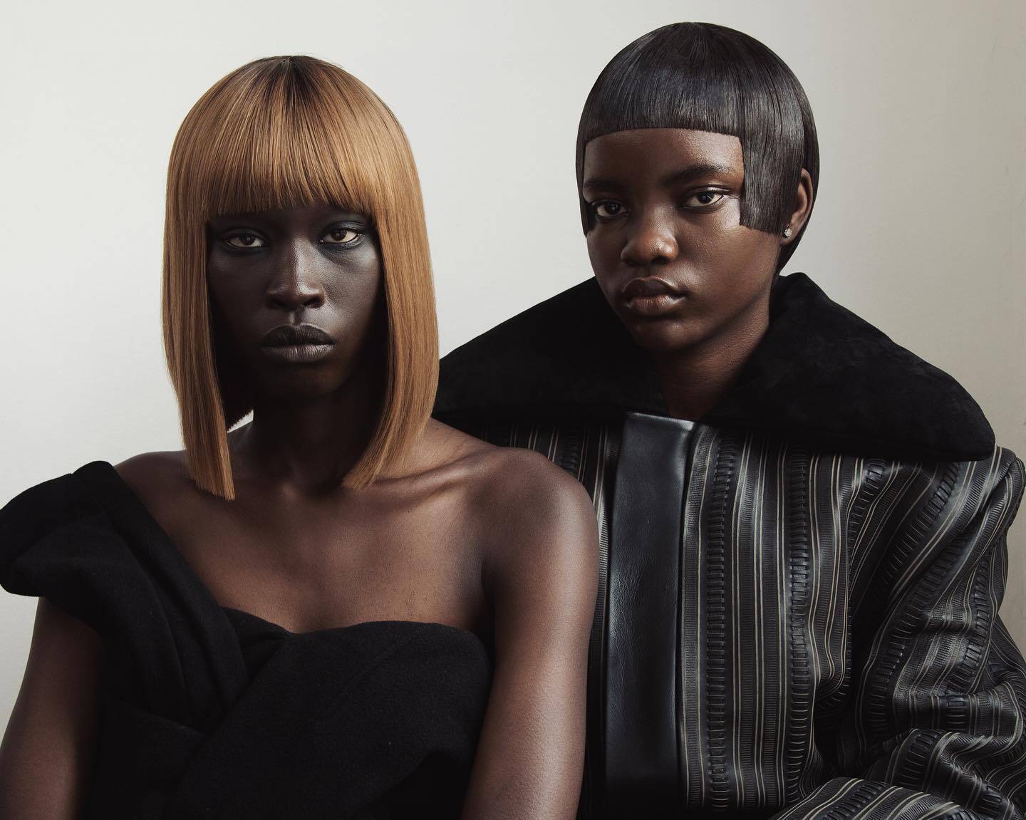 This manifested in an ombre brushed mohair jumper in hot pink and red and artfully draped leather – donated by Chanel – fashioned into oversized outerwear or sliced into strips and transformed into a pinstripe pattern. Elsewhere, laser-cut patterns directly referenced a traditional Nsubura pattern found among his mother’s archive which continued to influence the final collection. “I like to do a technique where I’m referencing traditional wrap-around dressing and drape as if it’s cloth,” Ewusie says. “There’s a black mini dress that was created out of two coats and it’s the idea that there’s a girl coming back from a night out and is trying to hide her party dress.”