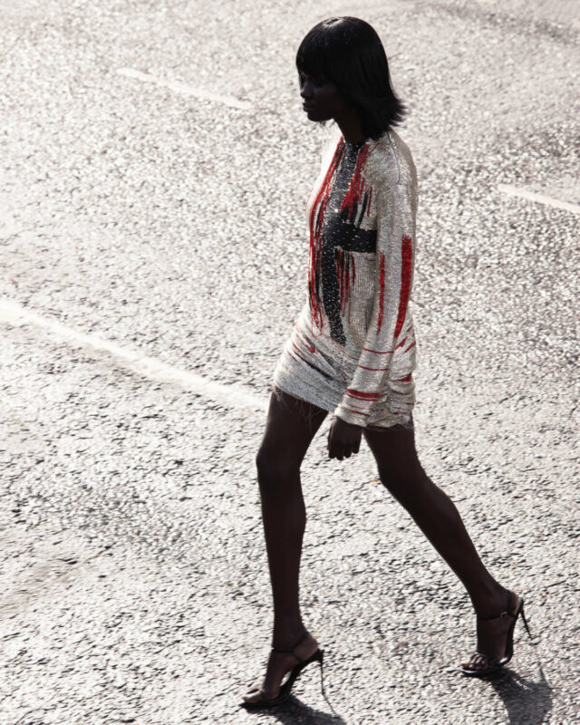 The collection’s final look was the cherry on top, a shimmering silver bugle bead dress, with flashes of black and red that were inspired by a Johny Pitts image the designer saw at Home is Not a Place at the Photographer’s Gallery. Rescued from a vintage shop, where it had been gathering dust for the past 20 years, the look was created in collaboration with friend and embroidery expert Angelica Ellis. “It was a case of destroying some bits and then mending others and it was fun because it became our dress in a way. It was the idea of taking ownership of an existing piece and giving it new life,” he says.