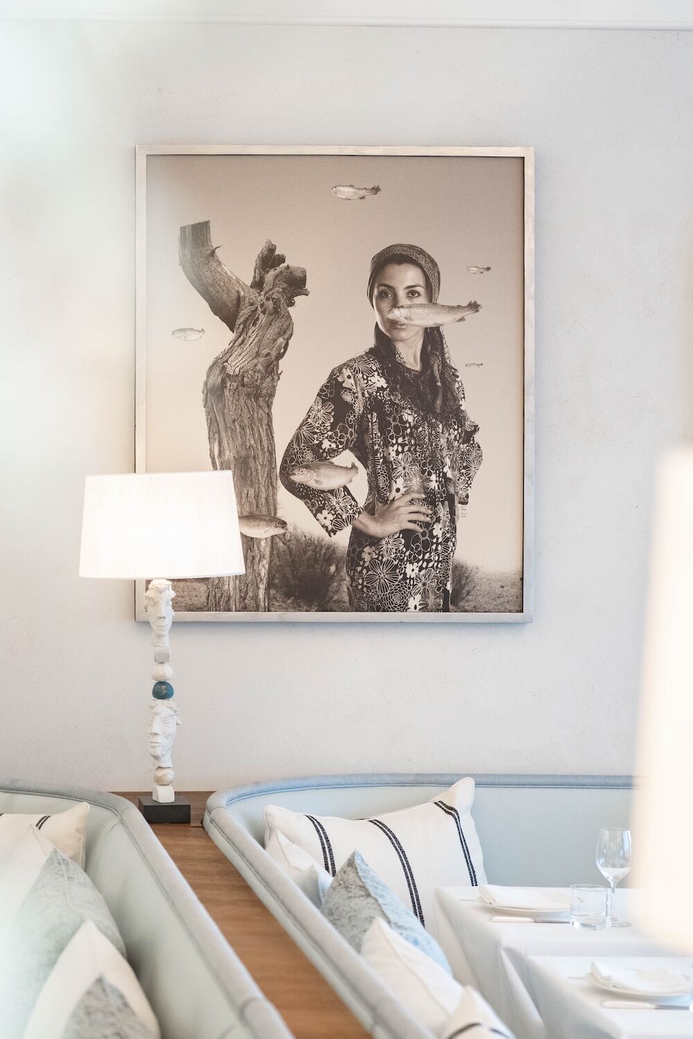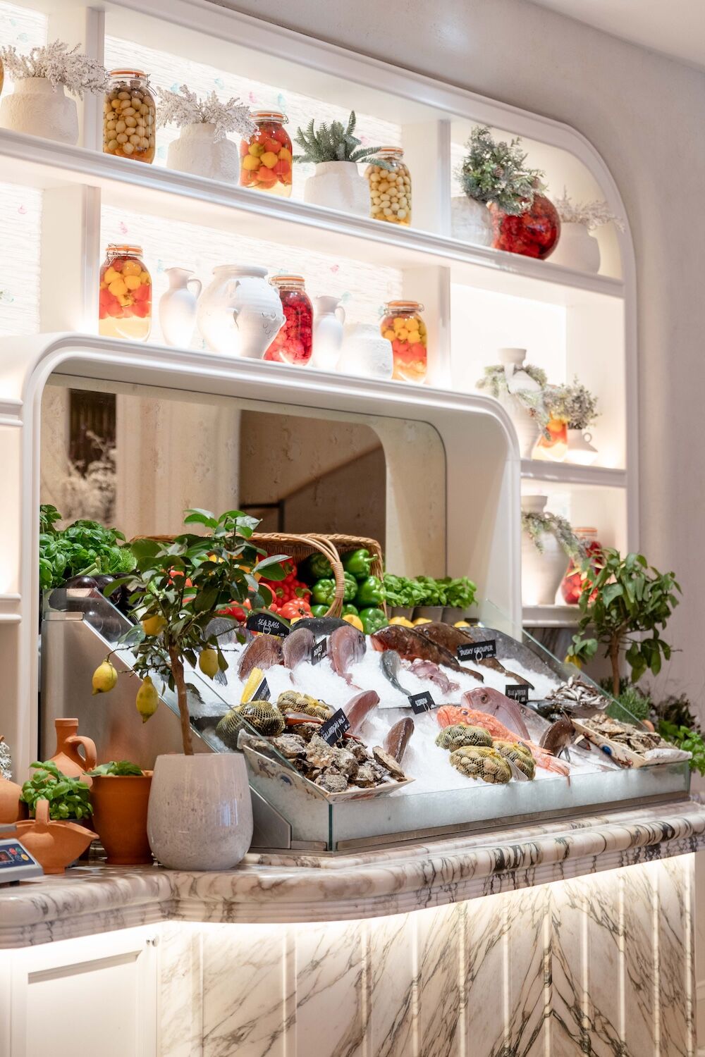 Upon entry, a wall of ice adorned with fresh seafood appeared in front of us. It was surrounded by opulent marble architecture and buntings of fresh vegetables that then lead to an open-plan kitchen. The ethereal beauty of the interior as we entered transported us away from the streets of Mayfair. Highlights included bold, dramatic and heavenly bubbles (lighting fixtures) hanging from the ceiling that gave off a smooth, romantic hue. The ambience was effortlessly elegant, just as it should be – this is Gaia after all, a refined taverna beaming with character. The whole place is even shrouded in olive, tomato and lemon trees. The aromas of herby and zesty flavours surround you like a subtly intoxicating taste of what’s to come – and we couldn’t wait. Pass the tzatziki please!