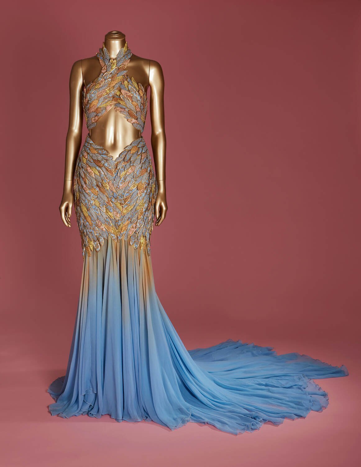 Moschino’s presence in the Crown to Couture exhibition is further amplified by the display of its fabulous, feathered gown worn by Gen-Z It-girl Iris Law at the 2022 Met Gala. The sensual cut of the halter neck wrap dress with cut-out bodice is accompanied by feathery gold and silver embellishments and finished with the train of a sky-blue gradient skirt.