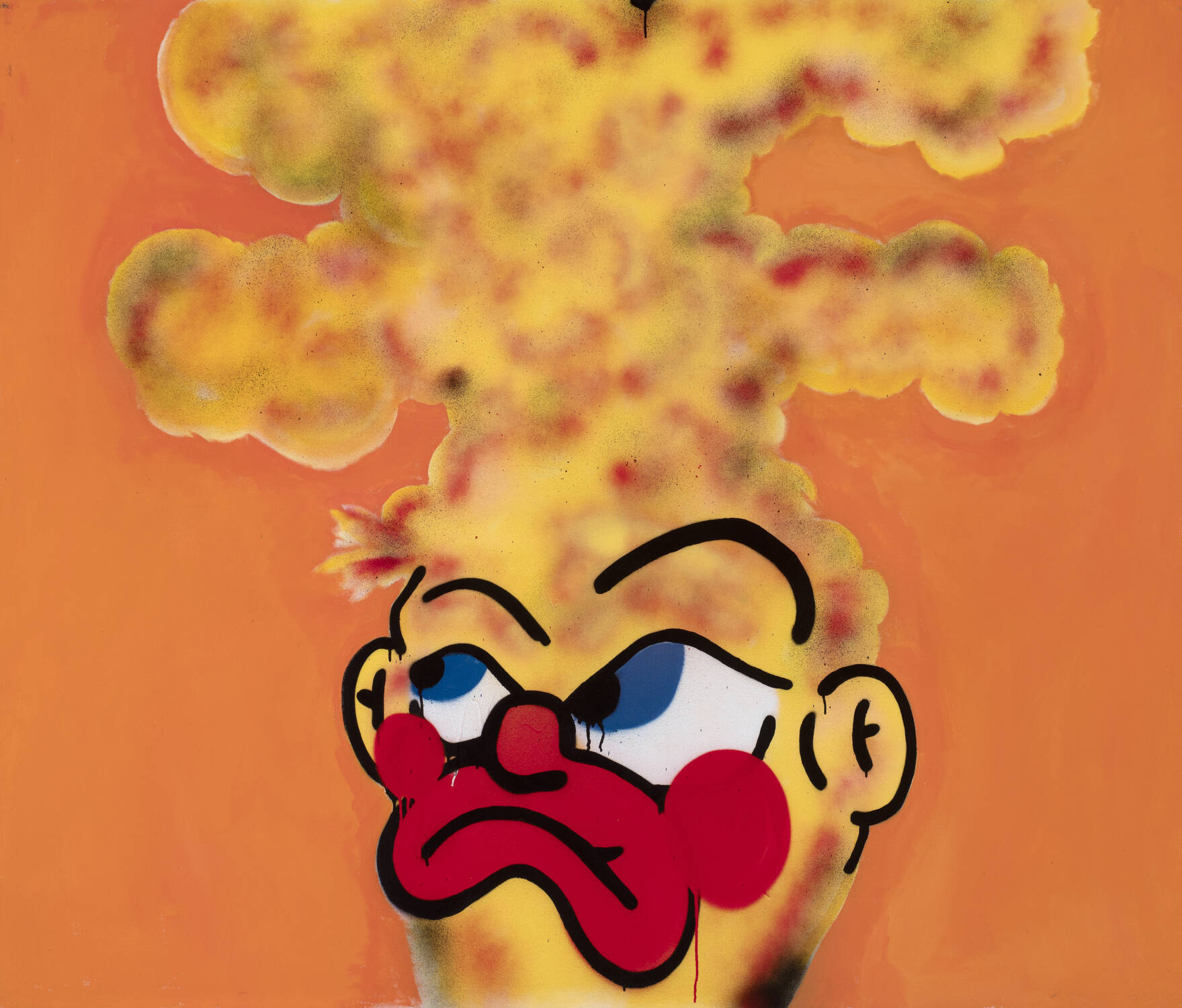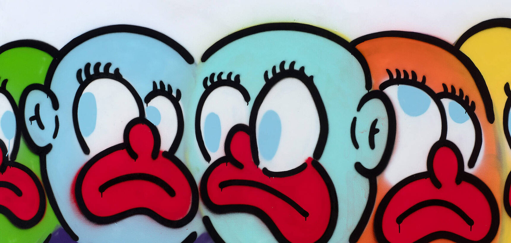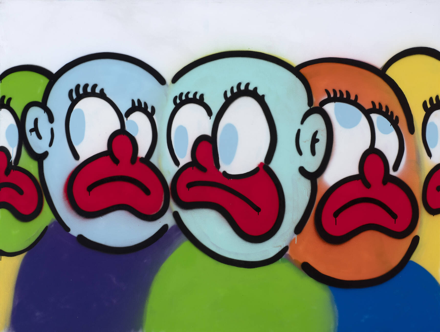 ‘1000 canvases’ is a composite of his spontaneous acrylic and spray-painted signature faces in primary colours bleeding into each other, repeated the length of an entire wall, comprising 1000 individual 29.7 x 21cm sections, available to purchase at £1000 each from 6pm via the gallery’s new online shop.