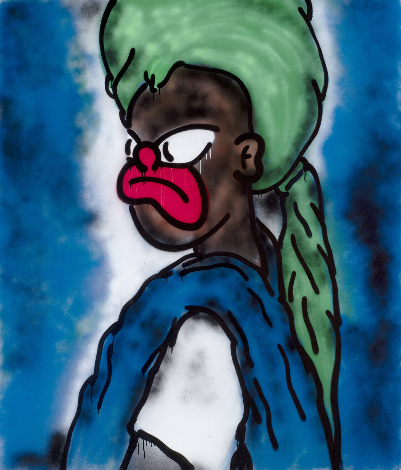 I tell him my favourite new work is baseball-capped ‘Little Slawn.’ “It’s inspired by me. When I was younger I had really terrible asthma, so it was very restricting for me to do things. I wanted to play football. I feel that the main thing for me is that I had to wear two T-shirts every time. My mum would get me loads of white T-shirts that I would wear under my top, which was very frustrating for me, it was to sort of secure your chest. It was annoying that I had to wear these T-shirts all the time; that’s why he’s sad in the painting because he can see the white coming out [at his neckline].”