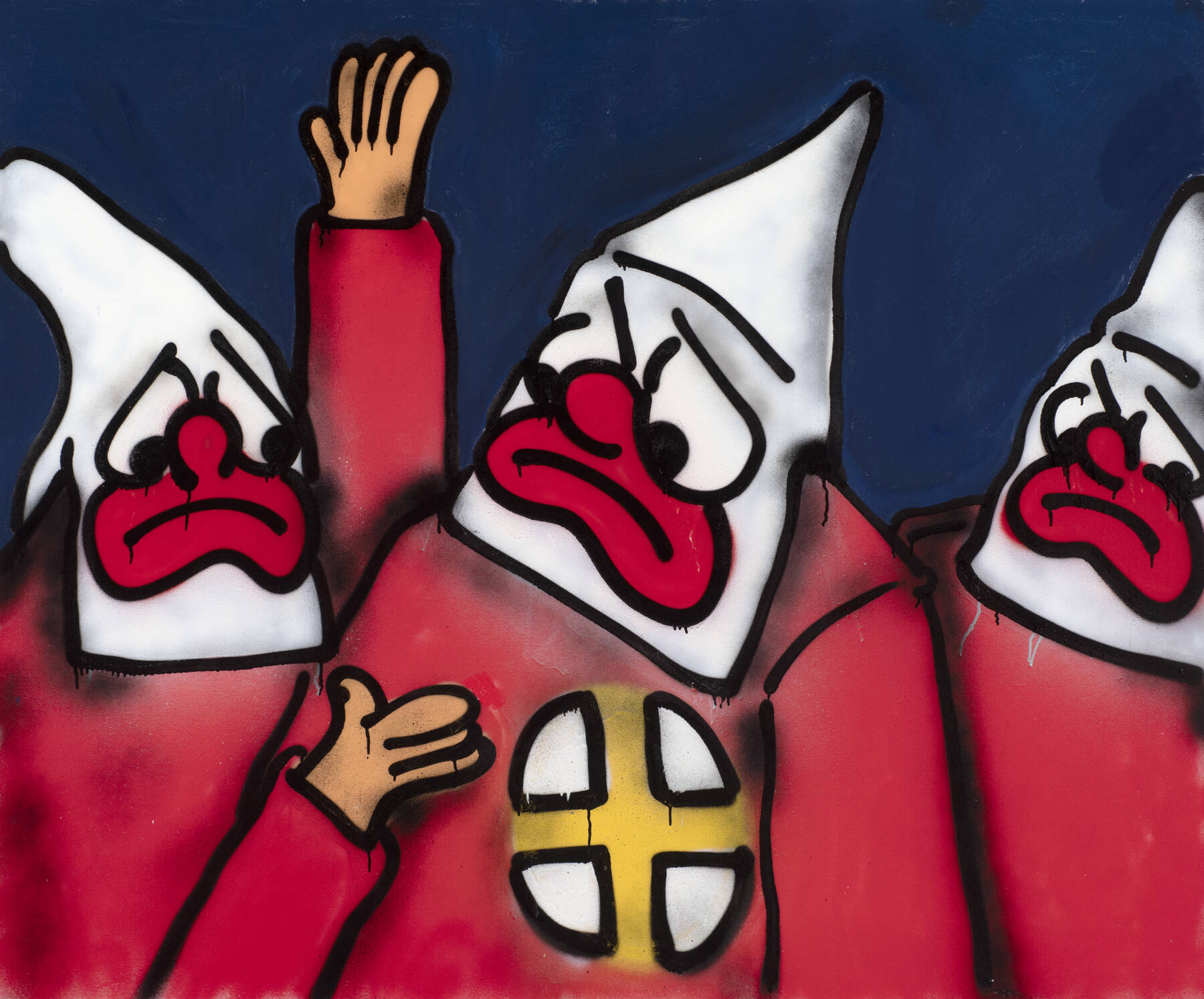 ‘OKKK’ features his abstract take on the Ku Klux Klan. “It’s a conversation. When you explain something to someone, and they go, ‘OK.’ The conversation’s not about the hooded members, it’s more about how it’s not very pleasant imagery for the conversation it’s meant to be. I want my paintings to be very straightforward, simple, easy to interpret, but the conversation that could be had from it, is… I just feel I want to be an icebreaker for a lot of people. You walk into someone’s house, you see that and you ‘hmmm,’ but now you can have a lengthy conversation about something new.”