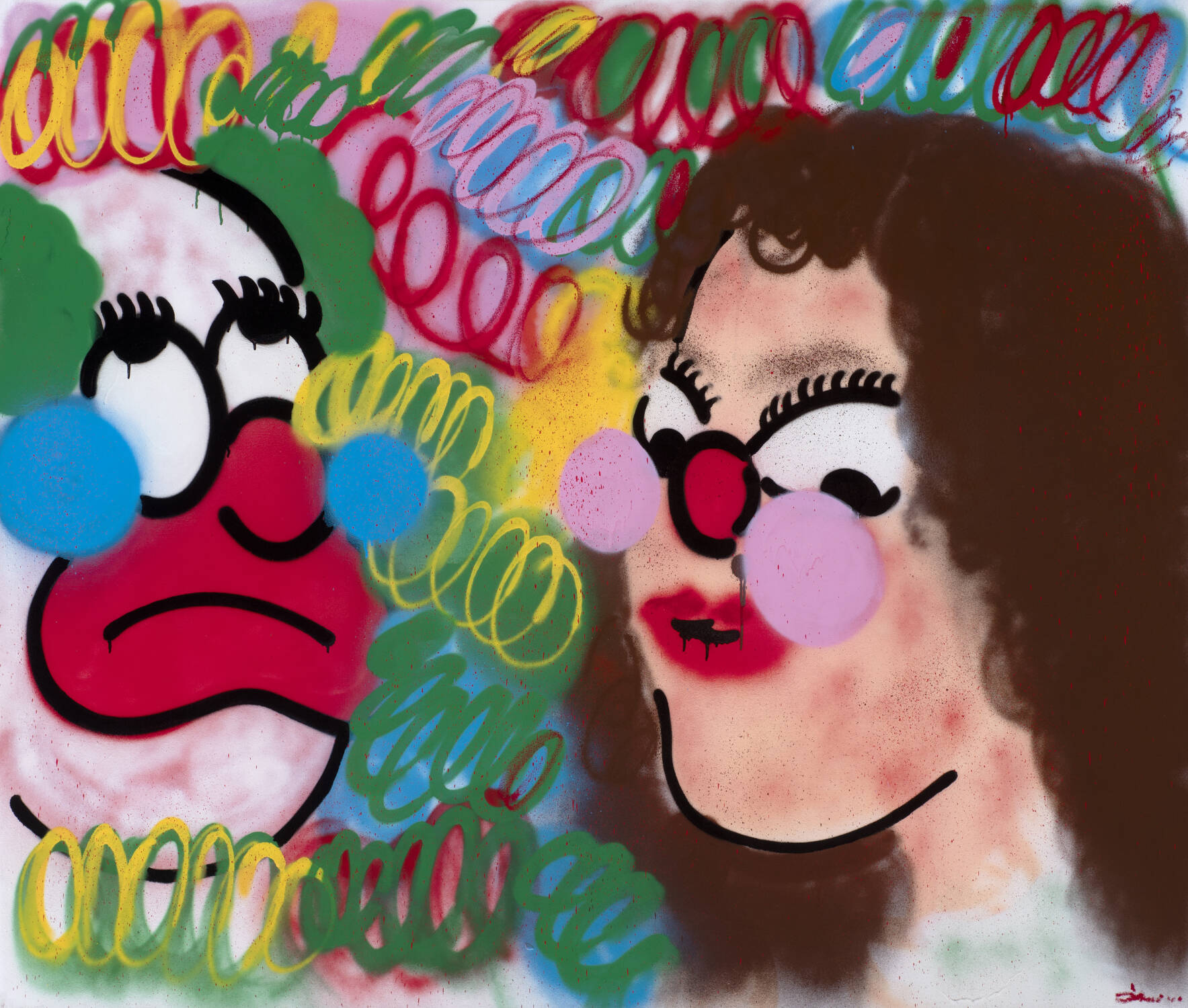 With most of his figures displaying downturned mouths, I ask him why the female figure in ‘First Kiss’ is smiling. “The thing that comes from a kiss is love, so it’s a happy feeling. The thing with most of my paintings is that they’re not very happy, they’re more direct and very much inspired by clowns. I see myself as a jester. I’ve got jester tattoos all over me and I just feel like the jester is very important to any situation,” the artist explains. Cutting the tension? “Yes, I feel like even if I was a King of a country, I’d still be a jester, so if anyone came to see who reigned on my land, they wouldn’t be looking for a jester, they’d be looking for a king. People can think I’m stupid, they can think I’m smart. I like being seen as non-threatening, but even if I was a threat, I don’t want you to know what is going to hit you when it’s going to hit you. I’m here to stay.”