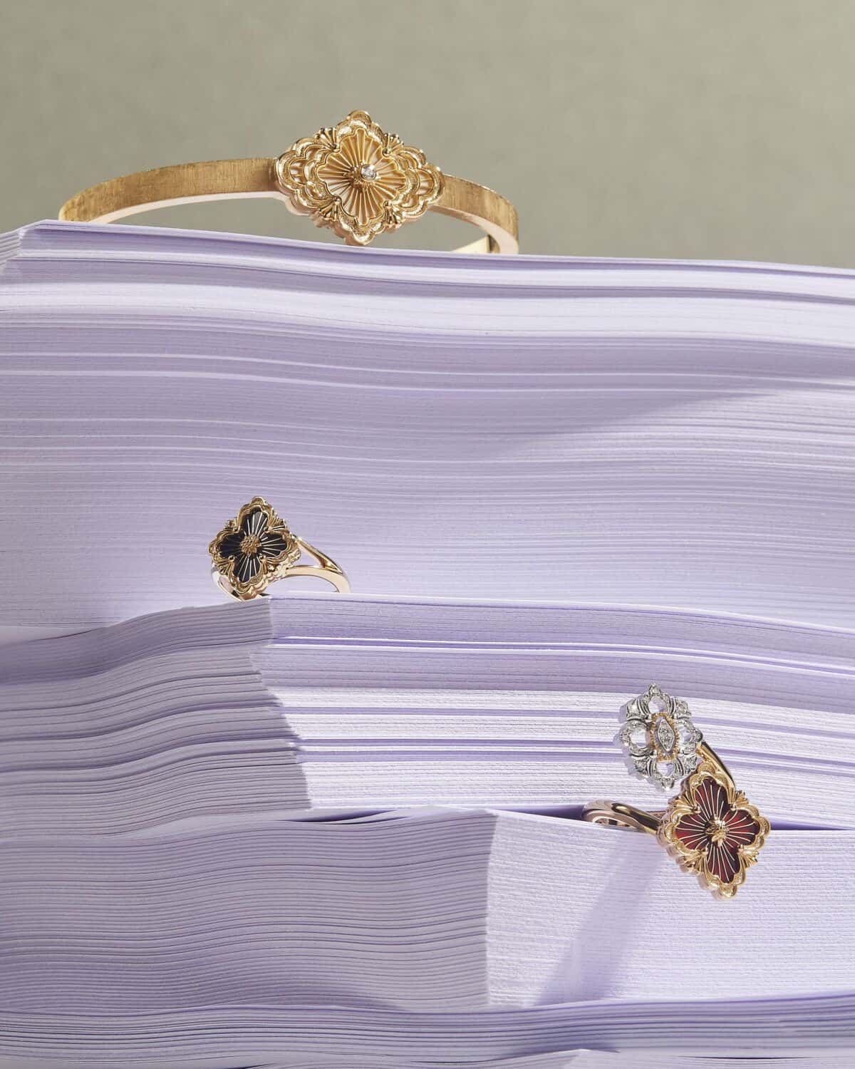 Enamelling, a practice that originated in ancient Greece and Byzantium and flourished through the 18th and 19th centuries, finds new resonance here. Buccellati revives this decorative art with prowess, applying layers of enamel to gold with meticulous care and then firing it to create a rich, luminous, almost lacquered finish. The result is a captivating harmony between colour and form, texture and transparency.