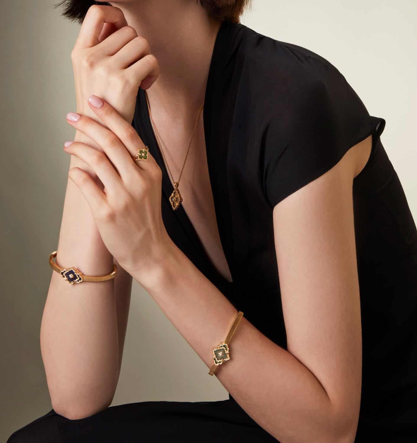 At the heart of Opera Tulle lies Buccellati’s iconic logo, which becomes both motif and muse. The emblem is reimagined across a vast range of rings, sautoirs, bangles, flexible bracelets and earrings, all unified by the brand’s hallmark radial tulle pattern. The delicate, lace-like design captures the essence of Italian refinement, evoking a sense of airy elegance whether set with semi-precious stones like onyx and mother-of-pearl, coloured enamels or left unadorned to highlight its intricate craftsmanship. Each piece is also available with or without diamonds, allowing wearers to personalise their expression of luxury.