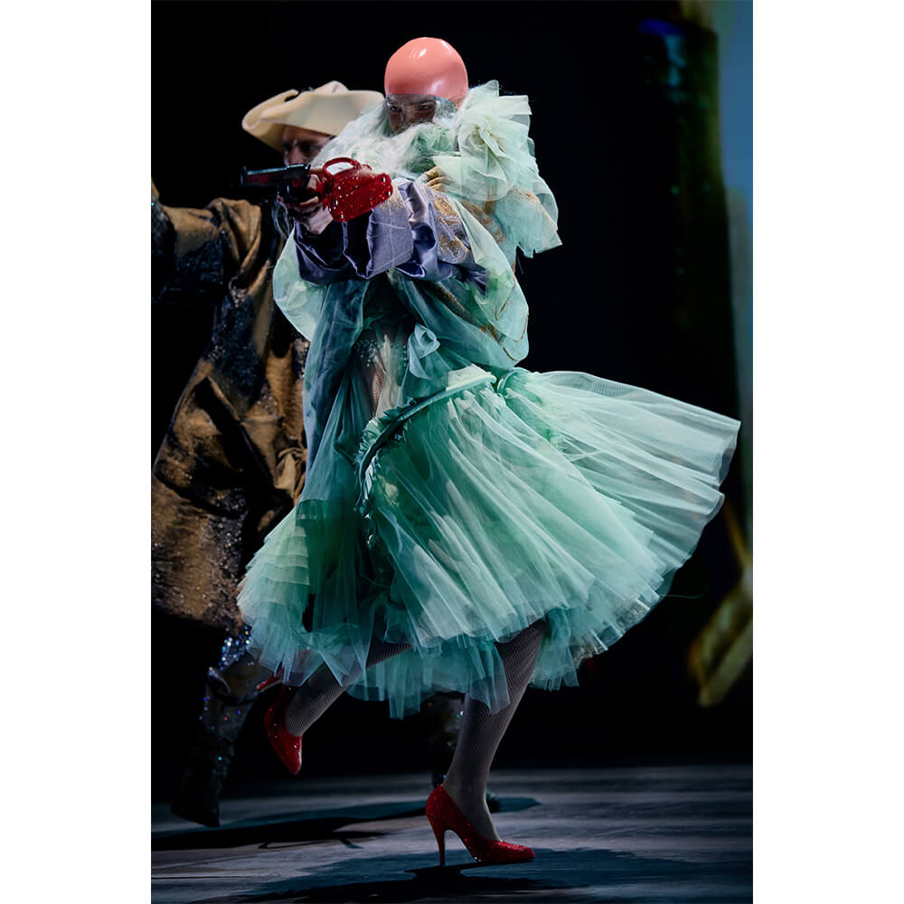 In fact, for its return to the runway, Maison Margiela showed another fashion film, except this one was performed and recorded in front of a live audience, at the Théâtre National de Chaillot in Paris. It was an ambitious performance that mixed theatre and rudimentary special effects where models lip-synched to a pre-recorded soundtrack in real time for more than half-an-hour. Dubbed Cinema Inferno, the Artisanal 2022 show was a love story that resembled the tragic narratives of Natural Born Killers and True Romance, taking inspiration from Badlands, Bonnie and Clyde, Kill Bill and The Wizard of Oz, as well as a whole host of B-movies ranging from Westerns to horror flicks. The rather chaotic showcas jarred guests out of their reverie, using storytelling to elevate the staging from a commercial endeavour to an artistic statement.