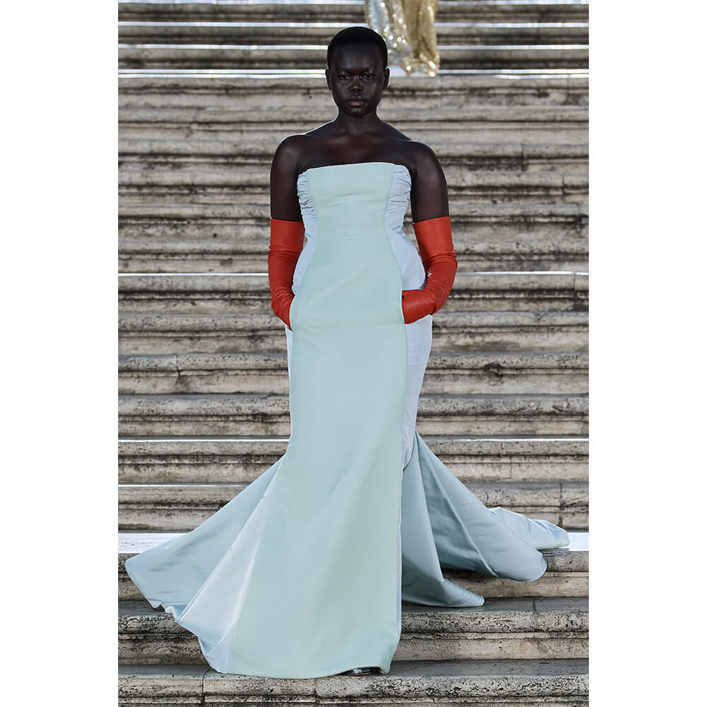 To square that circle, Valentino boasted an extravagant democratised spectacle, expanding its couture market dramatically. Models were diverse in size, age, race, and gender while about a quarter of the collection was realised in upcycled materials. Pierpaolo Piccioli also invited 120 students to experience the grandeur and even led his atelier team down Rome’s Spanish Steps, bestowing them with well deserved recognition. Iris Van Herpen and Olivier Rousteing for Jean Paul Gaultier offered the same accolade this season.