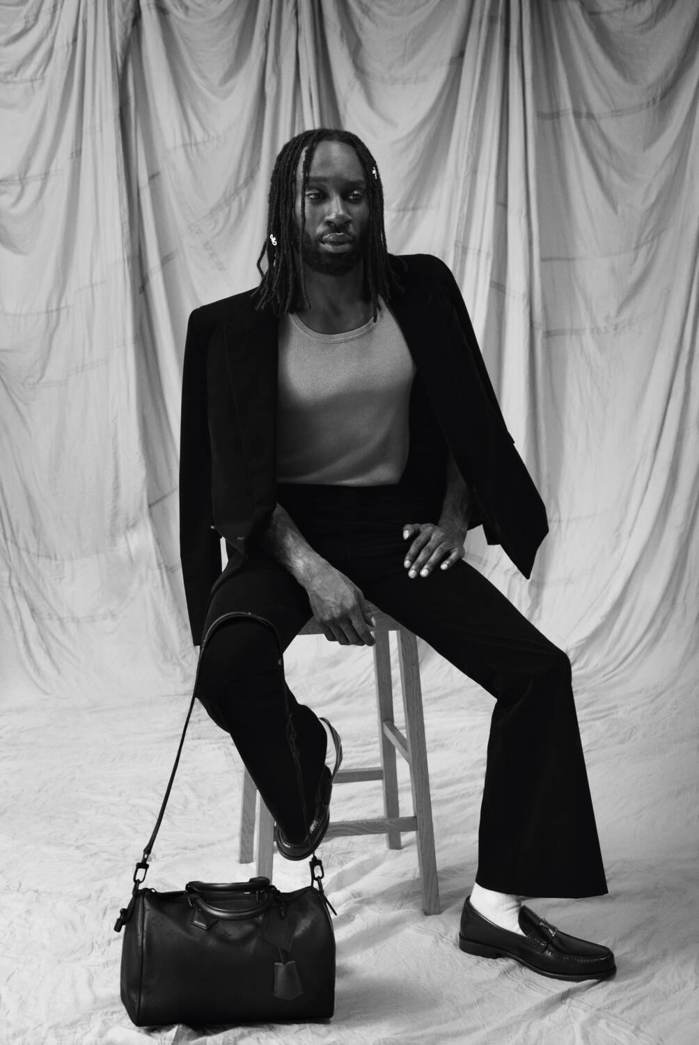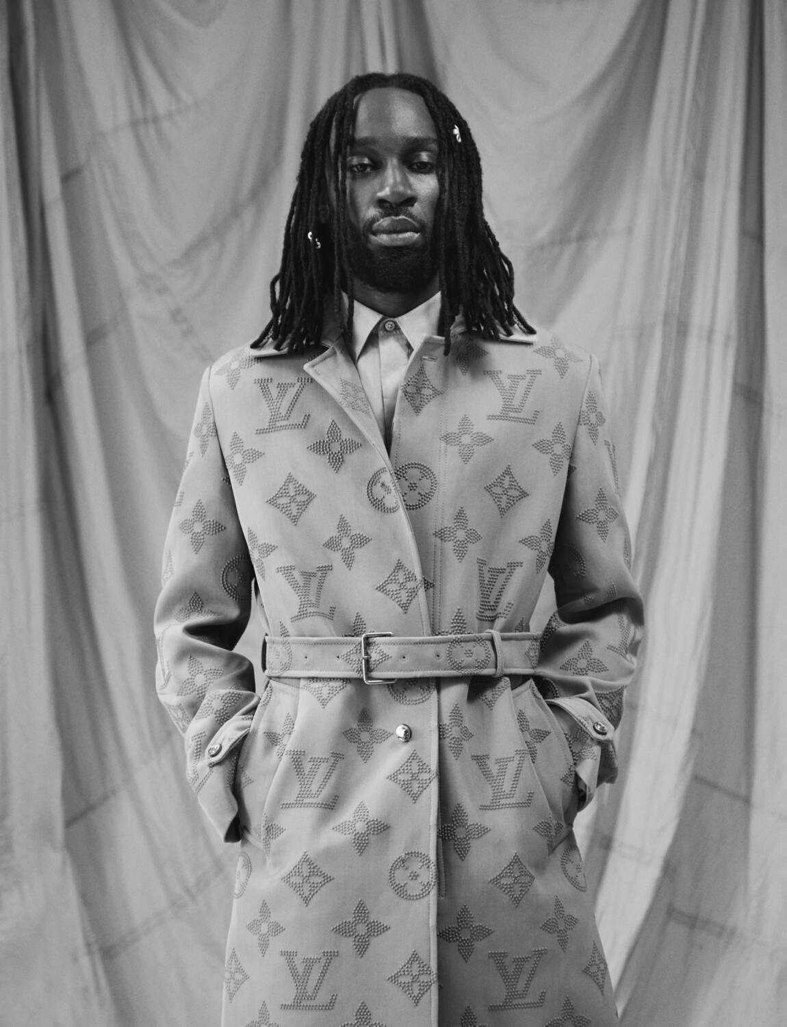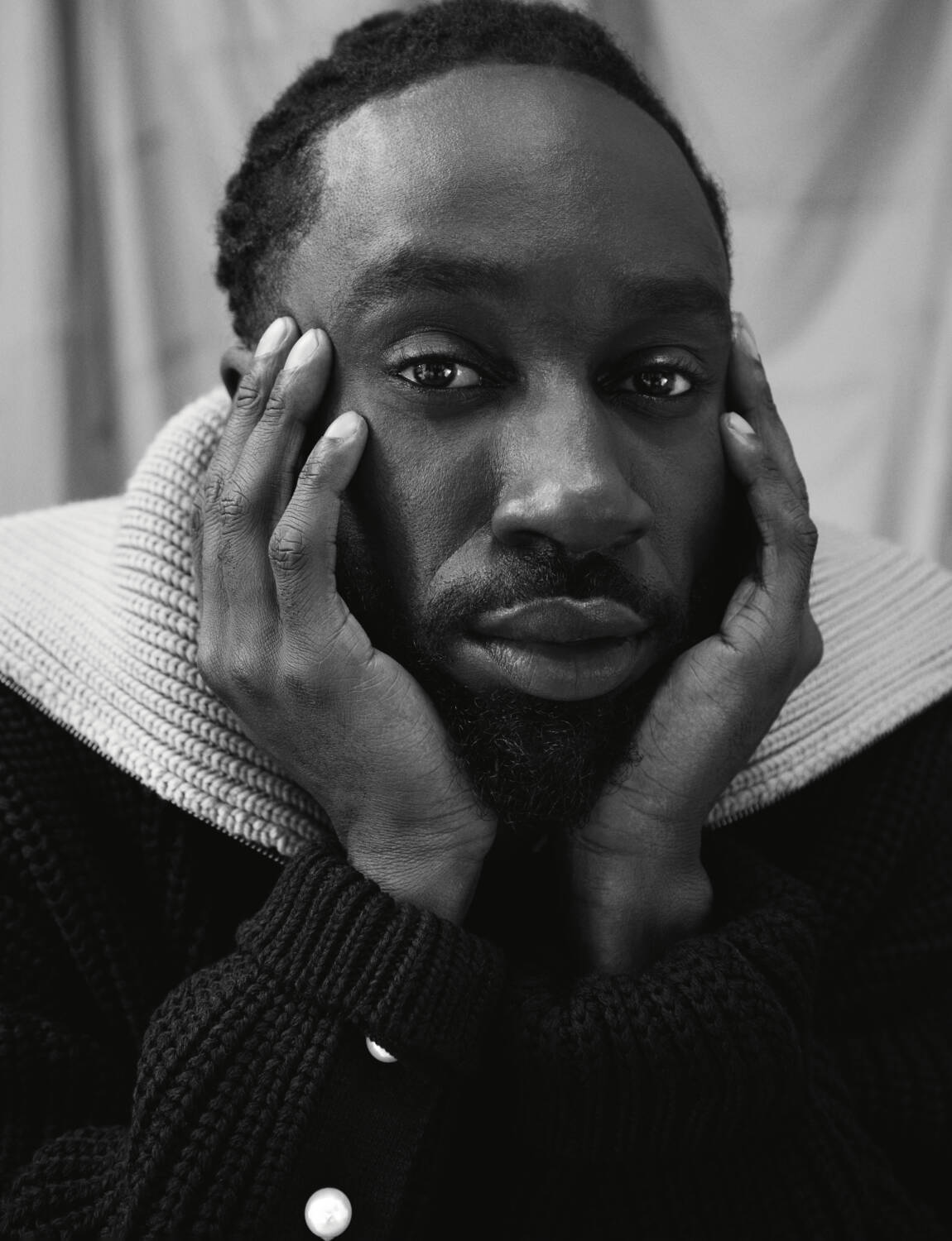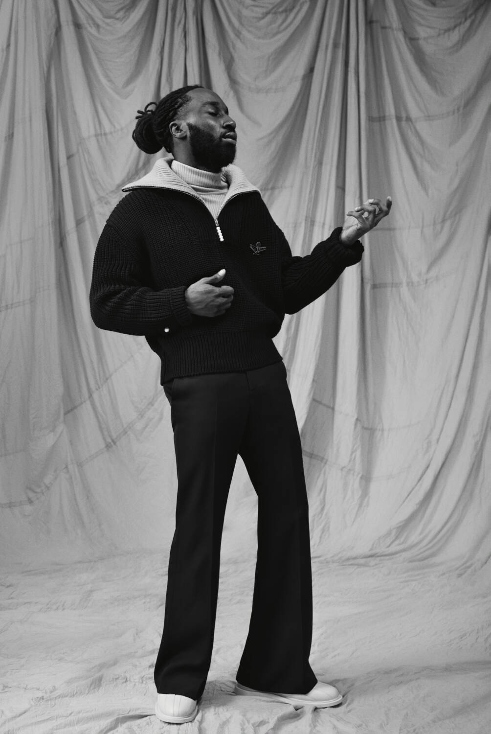 Raised in Hoxton to Ghanaian immigrant parents, Kojey keeps his oldest friends close to him. “I’ll be on Discord all day with my friends from my primary school, secondary school, college, just talking,” he says. “They work regular jobs: one’s a doctor, one works in a school, one works for Sony PlayStation, one’s a manager of a restaurant. Regular jobs. I like tapping into that, hearing what’s going on with the world. I’m very grateful for the fact that I get to express myself for a living, but at the same time there does have to be some disparity between doing that and then living your life,” he says. “Because of what you do, people put you on a pedestal and there’s an idolisation that comes with that which means that you’re constantly being fed things that indulge your ego – and over time, that’s probably the most toxic way to live.”