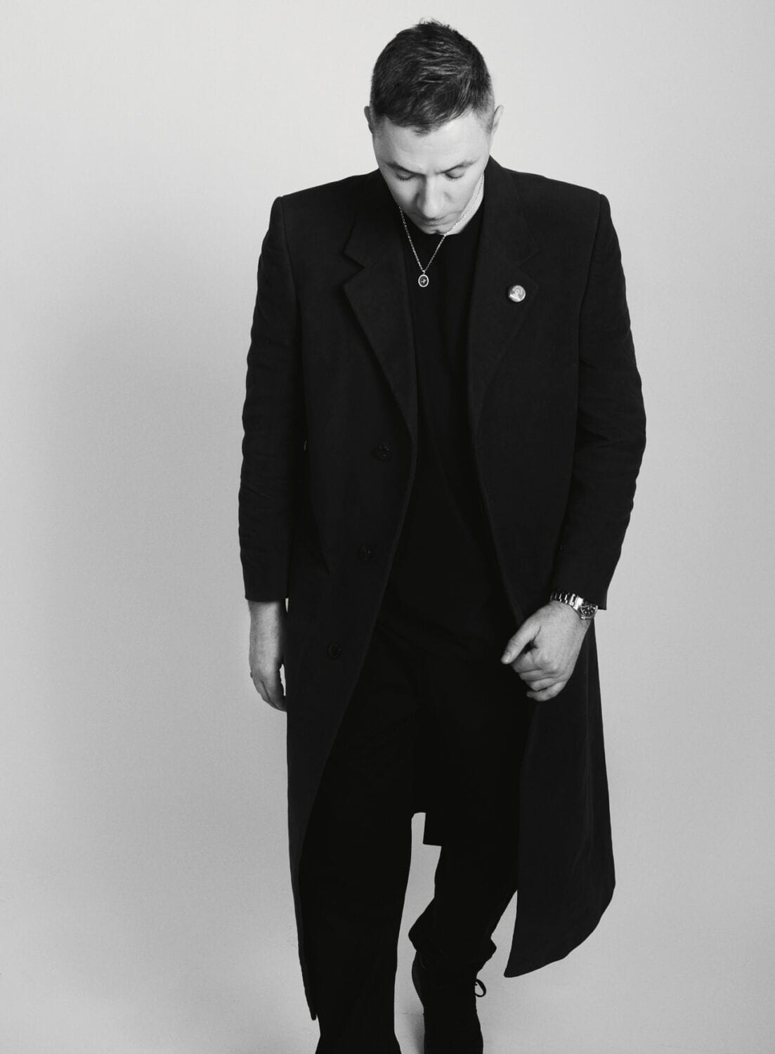 Benji wears coat by MARTINE ROSE, jumper by LOUIS VUITTON
