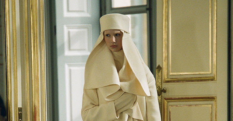 A move to fashion’s capital seemed to encourage the twosome to push the envelope. Their beautifully-cut trousers and jackets, still in muted hues, came worn with cashmere jumpers that had elongated sleeves which trailed across the floor. There were also shirts with clownish, seventies collars, overcoats worn back-to-front as dresses and a giant woolly blanket fashioned into an evening gown. Those, and pillbox hats, trainers and fuzzy muffs, made a pretty impressive new shopping list for the brand’s loyal clientele.