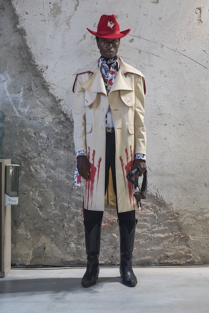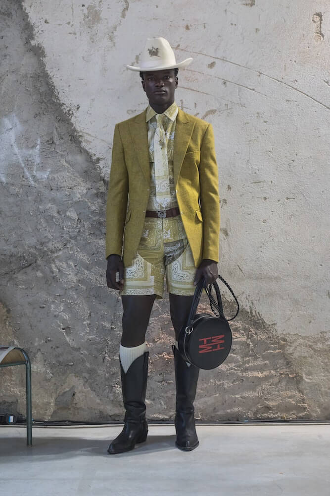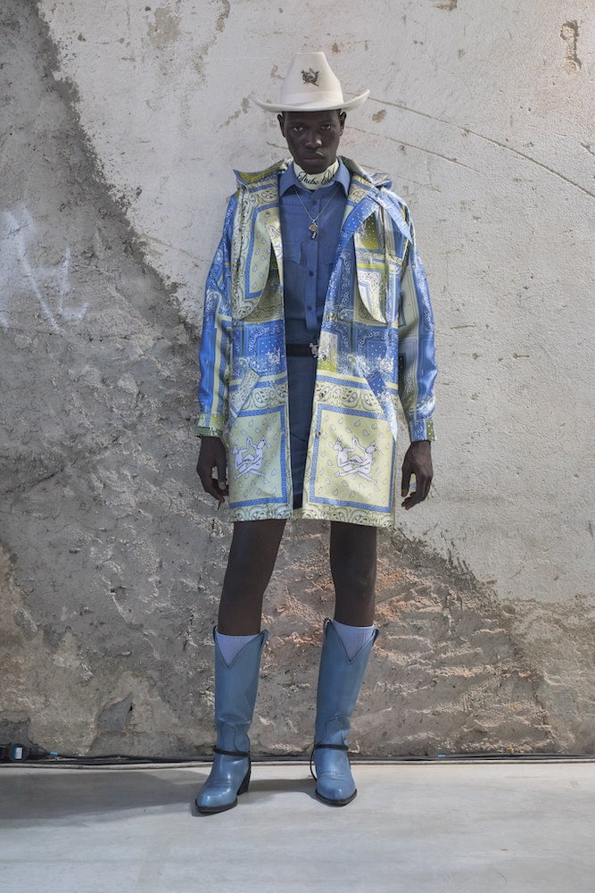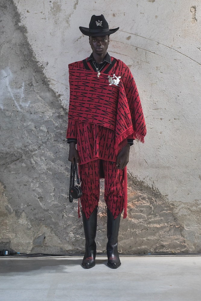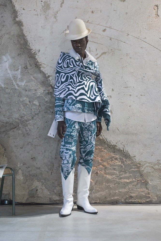 A strong western influence punctuates throughout, with Magugu particularly focused on this idea of Black Hat Bandits and White Hat Heroes. Models wear Masai check checked suits, print-laden ponchos and the brand’s first men’s shoe; a knee-high equestrian boot stamped with Magugu’s logo on the calf and on stainless steel spurs. South African political cartoonist, Jonathan Zapiro, leant a series of artworks from his archive for Magugu to use at his disposal – resulting in a series of political crooks making their way across laddish playsuits and “blood” strained trenches.