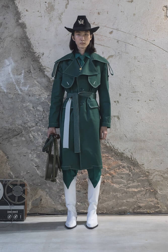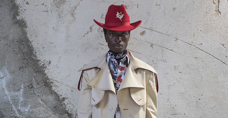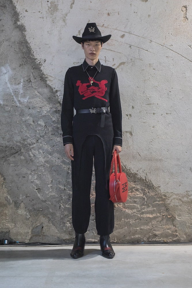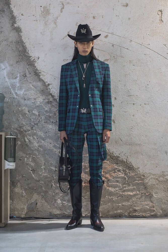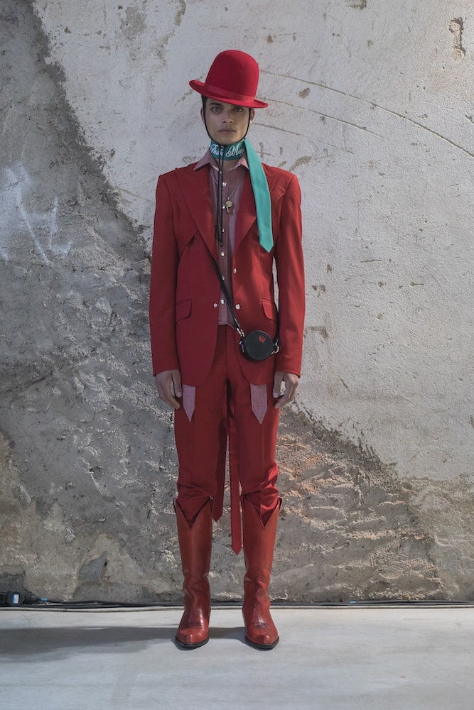A strong western influence punctuates throughout, with Magugu particularly focused on this idea of Black Hat Bandits and White Hat Heroes. Models wear Masai check checked suits, print-laden ponchos and the brand’s first men’s shoe; a knee-high equestrian boot stamped with Magugu’s logo on the calf and on stainless steel spurs. South African political cartoonist, Jonathan Zapiro, leant a series of artworks from his archive for Magugu to use at his disposal – resulting in a series of political crooks making their way across laddish playsuits and “blood” strained trenches.