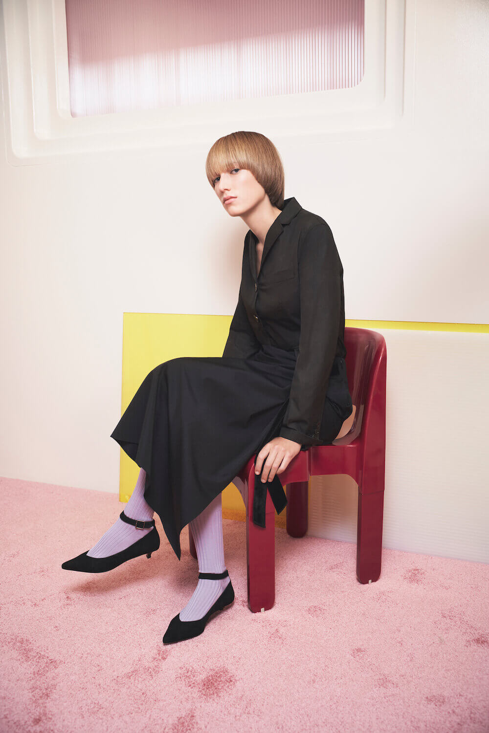 Designed directly on the models, rather than on paper, the capsule offers impeccable, classic silhouettes – without the stodgy stiffness – throughout outerwear, smart suiting and relaxed dresses. “I hardly ever draw clothes. I have to see them on a body, and in movement,” Ossendrijver explains. All the clothes come in sprightly spring tones from lilac to cognac, and muted grey to earthy green with pops of blue, violet, bubbly amber and ruby red manoeuvred into the mix. One of Ossendrijver’s favourite items is the double-hemmed men’s t-shirt. “It has the ease of a t-shirt but it looks a bit more elevated because of the shirt hem,” he says. “I think it’s a nice twist.” Another standout is the women’s shirt with short bell-shaped sleeves. Cut in one piece with the body, it comes in a men’s shirting stripe and takes on a sharp and precise silhouette.