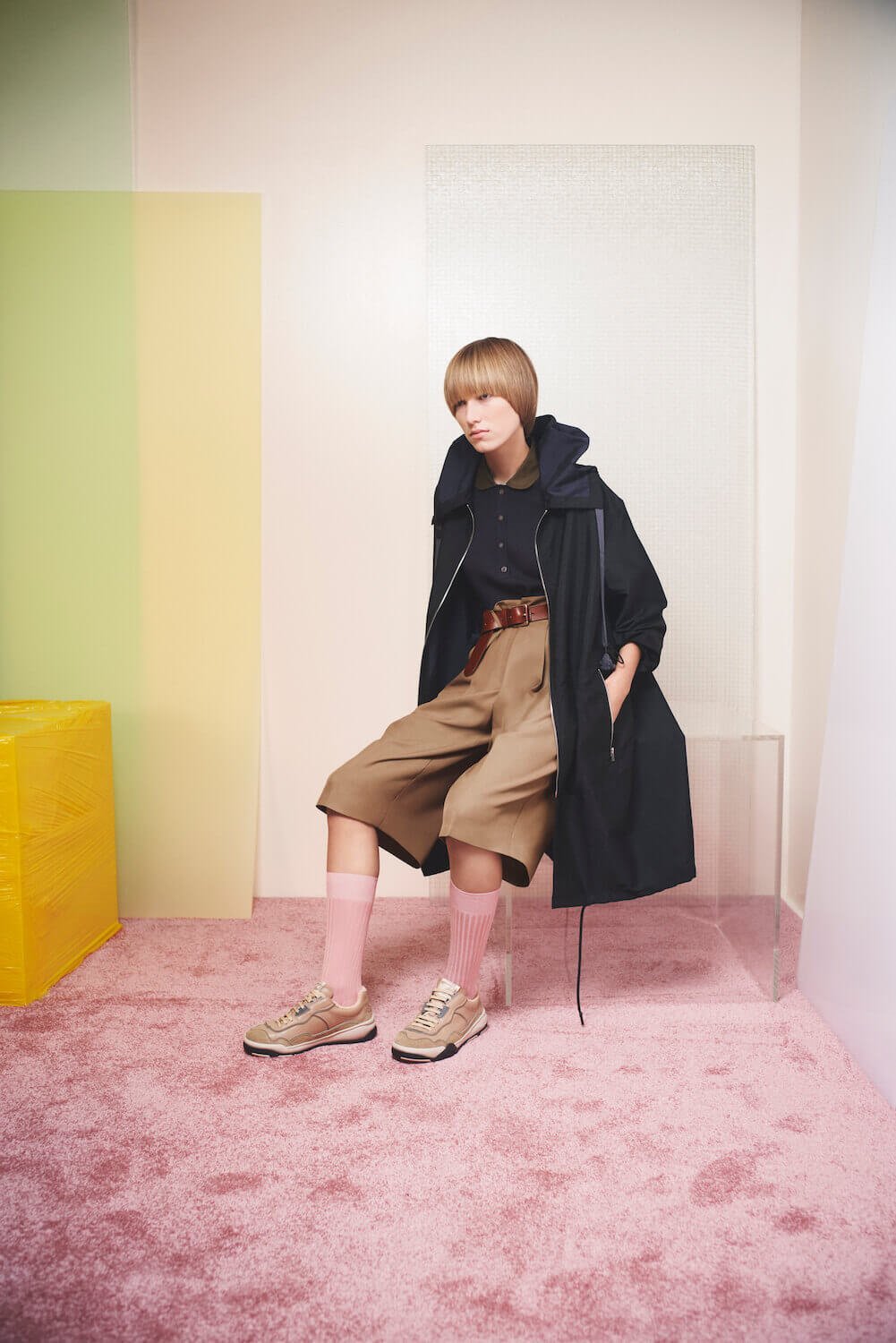 For the very first time, Theory introduces a leisurely low top sneaker. Honing in on the tension between functional and noble materials, it further reinforces Ossendrijver’s juxtaposition of feminine and masculine, coming in a sinuous leather and suede construction. Finished with bespoke rubberized soles geared towards urban exploration and tipped with reflective materials, these sneaks will have you stepping into the city in style. “This season we introduce the first Theory Project sneaker, and I’m very proud of it. It’s a sporty, unisex style that’s… beautifully done and very comfortable,” he explains. “It really stands on its own and has a distinct style, but is still easy to wear and combine.” Paired with slim mens trousers or tailored, over-the-knee bermuda shorts with an extra pleat, it “makes the looks feel more grounded and real.”
