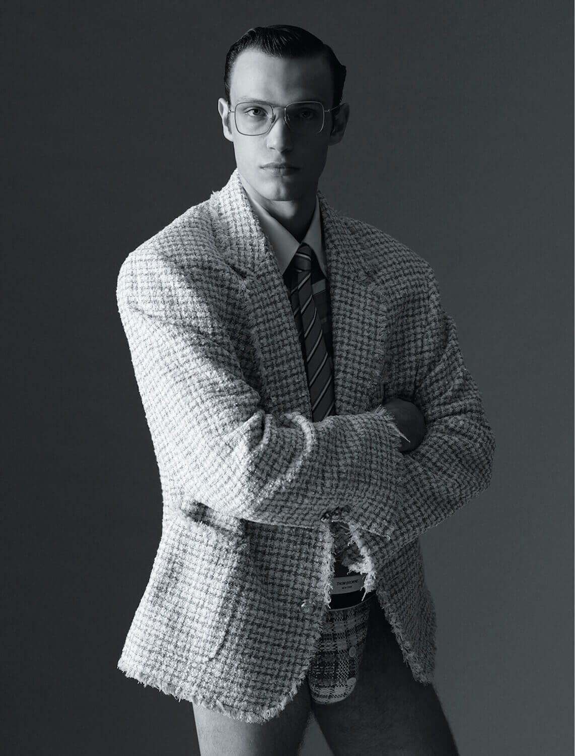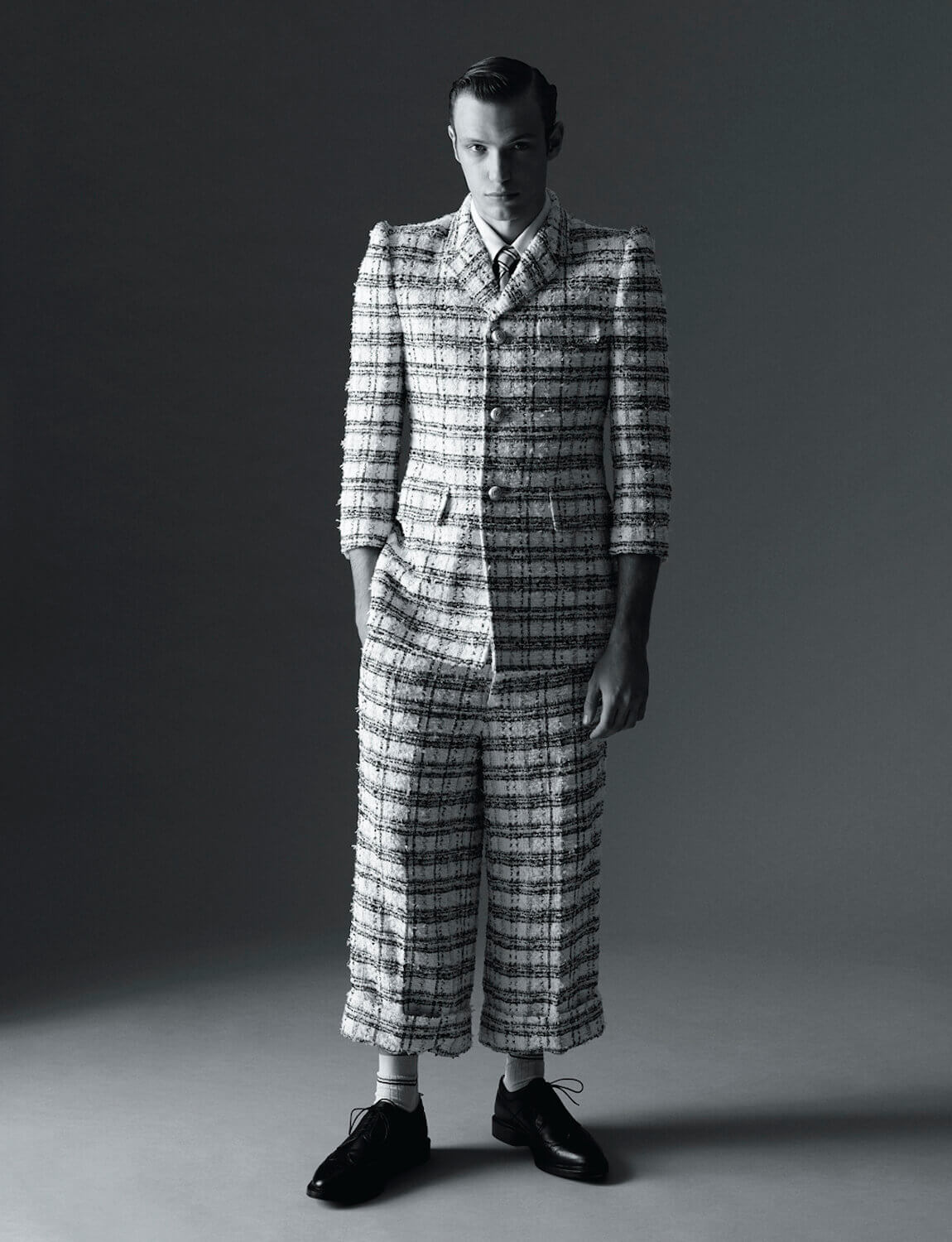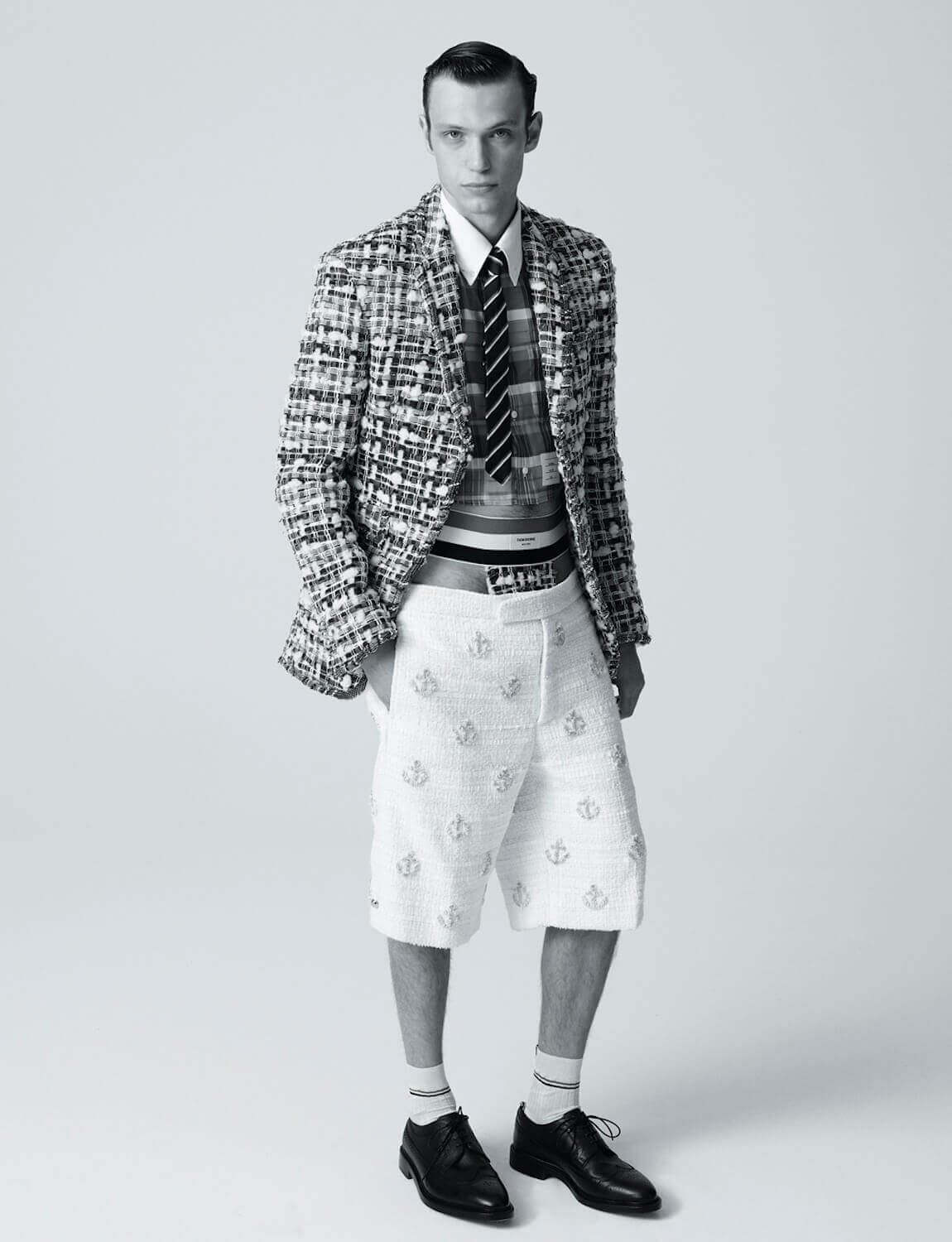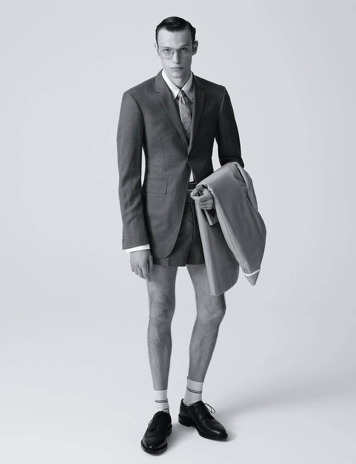 There’s a certain rigour that defines no brand quite like Thom Browne. Each day, the designer, who lives and works from New York, wears a pleasantly shrunken suit. It’s made up of a snug blazer, cardigan and boyish shorts – all a slate grey. He wears a matching tie, a crisp white shirt and a pair of black leather brogues.