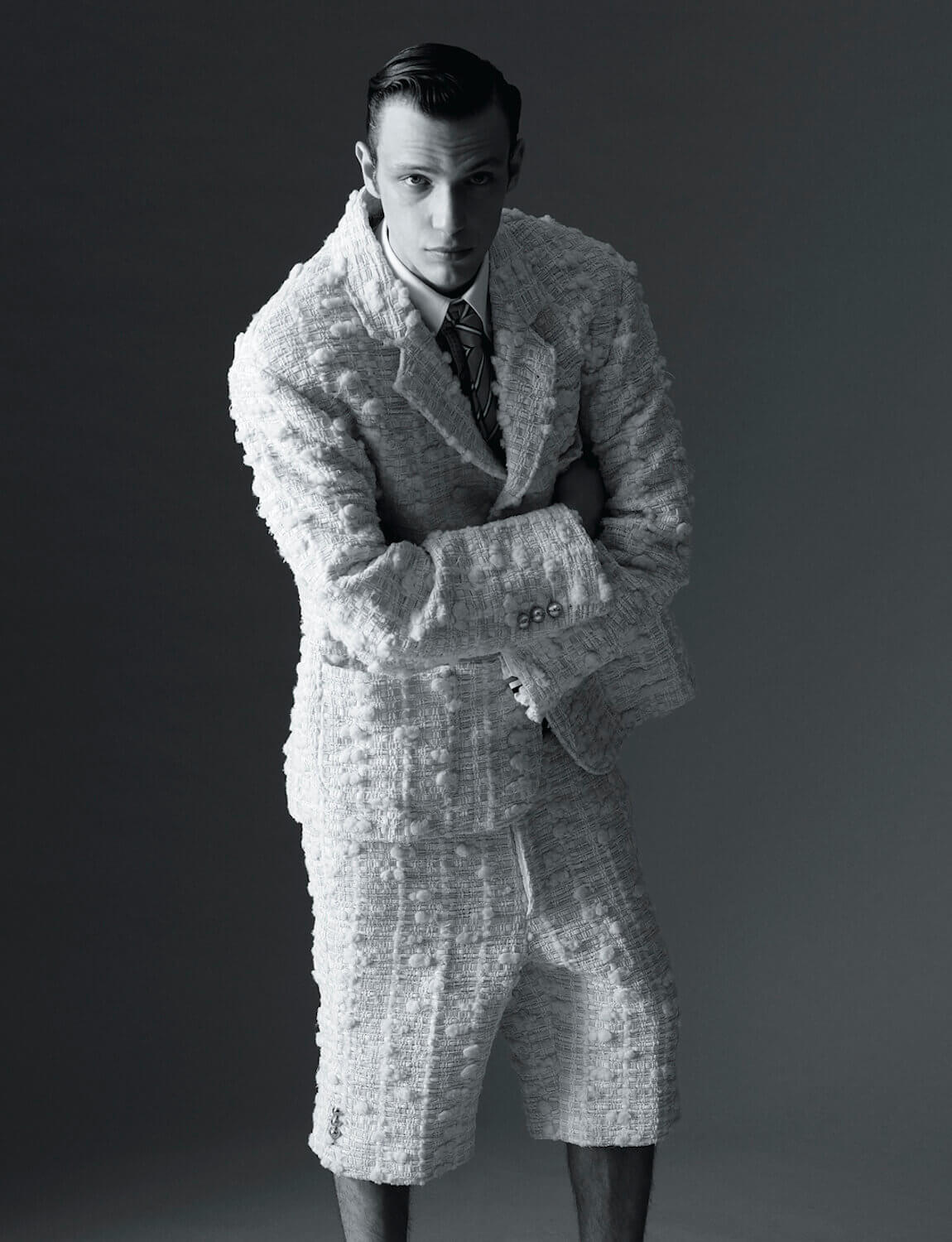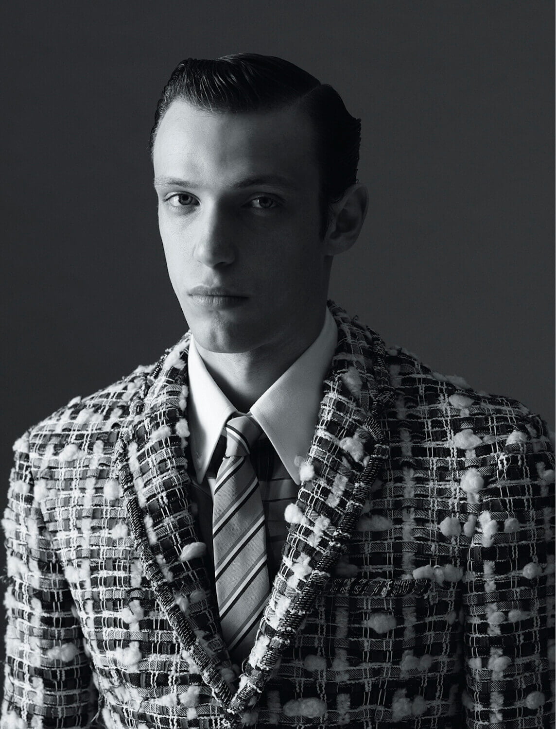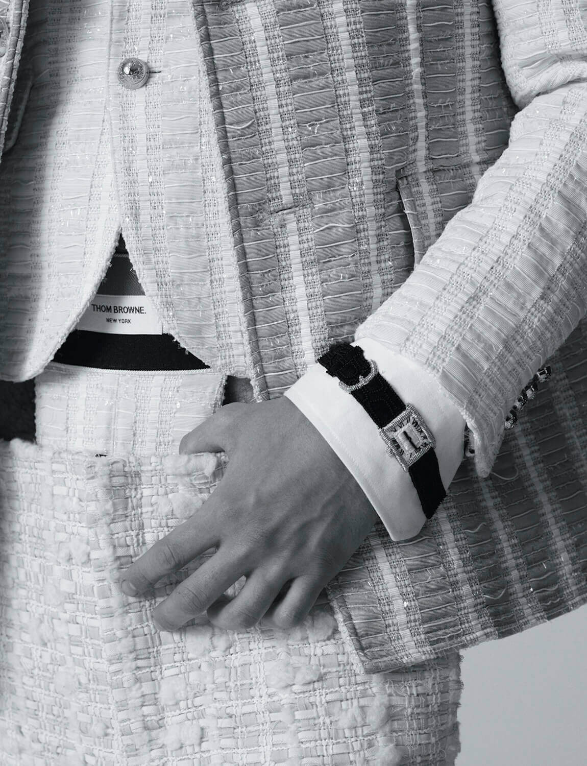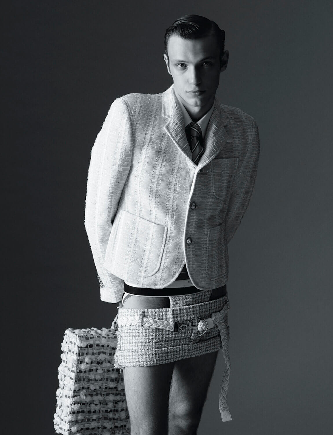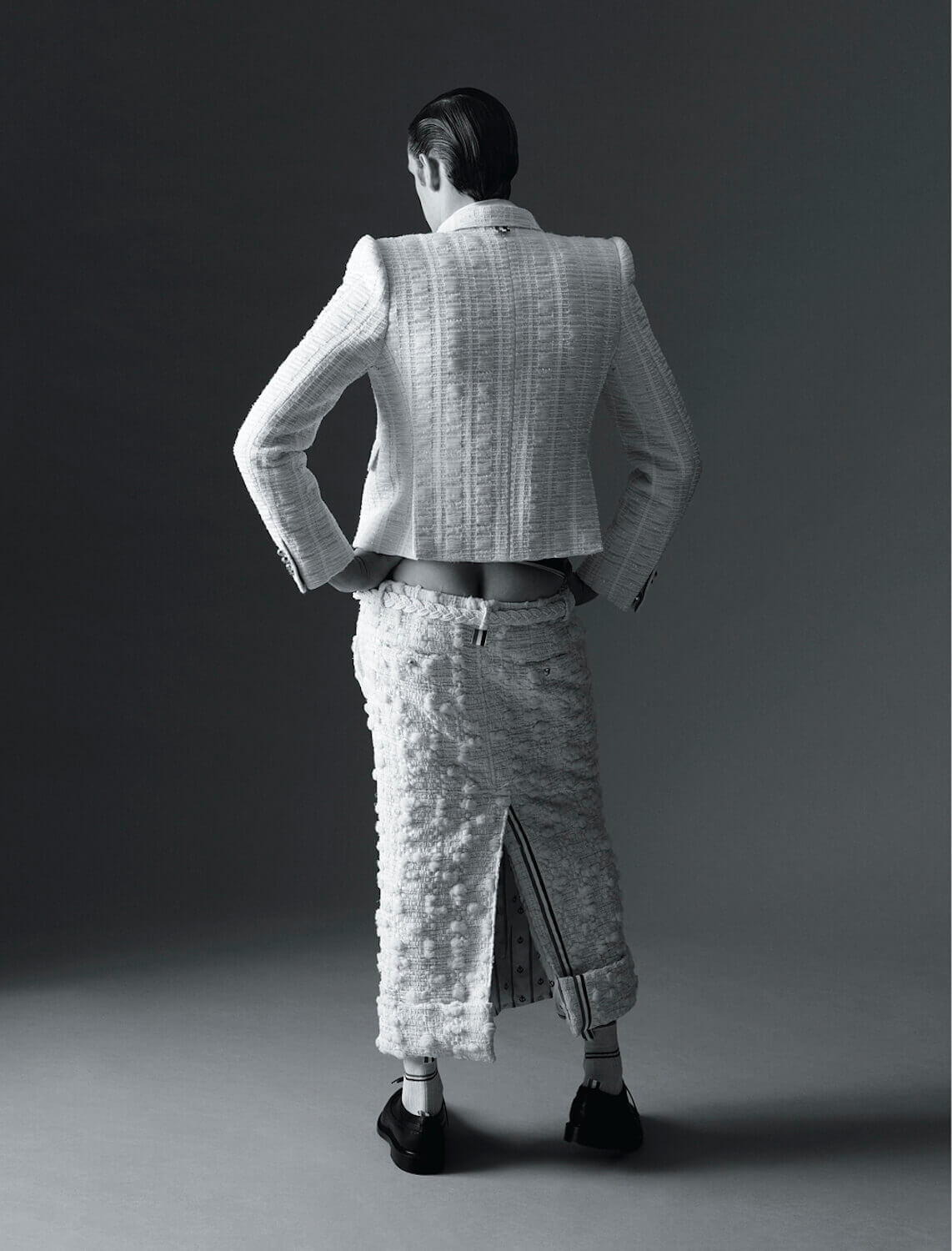 He ventured to the South of France to develop the collection’s tweeds, which were perforated with denim, seersucker tulle, leather, lace and multi-coloured ribbon. “I take the idea and quality of couture, with fabrics that feel very French, and then make them my own by playing with proportions in interesting ways. It was a good mix of Thom Browne and Paris.”