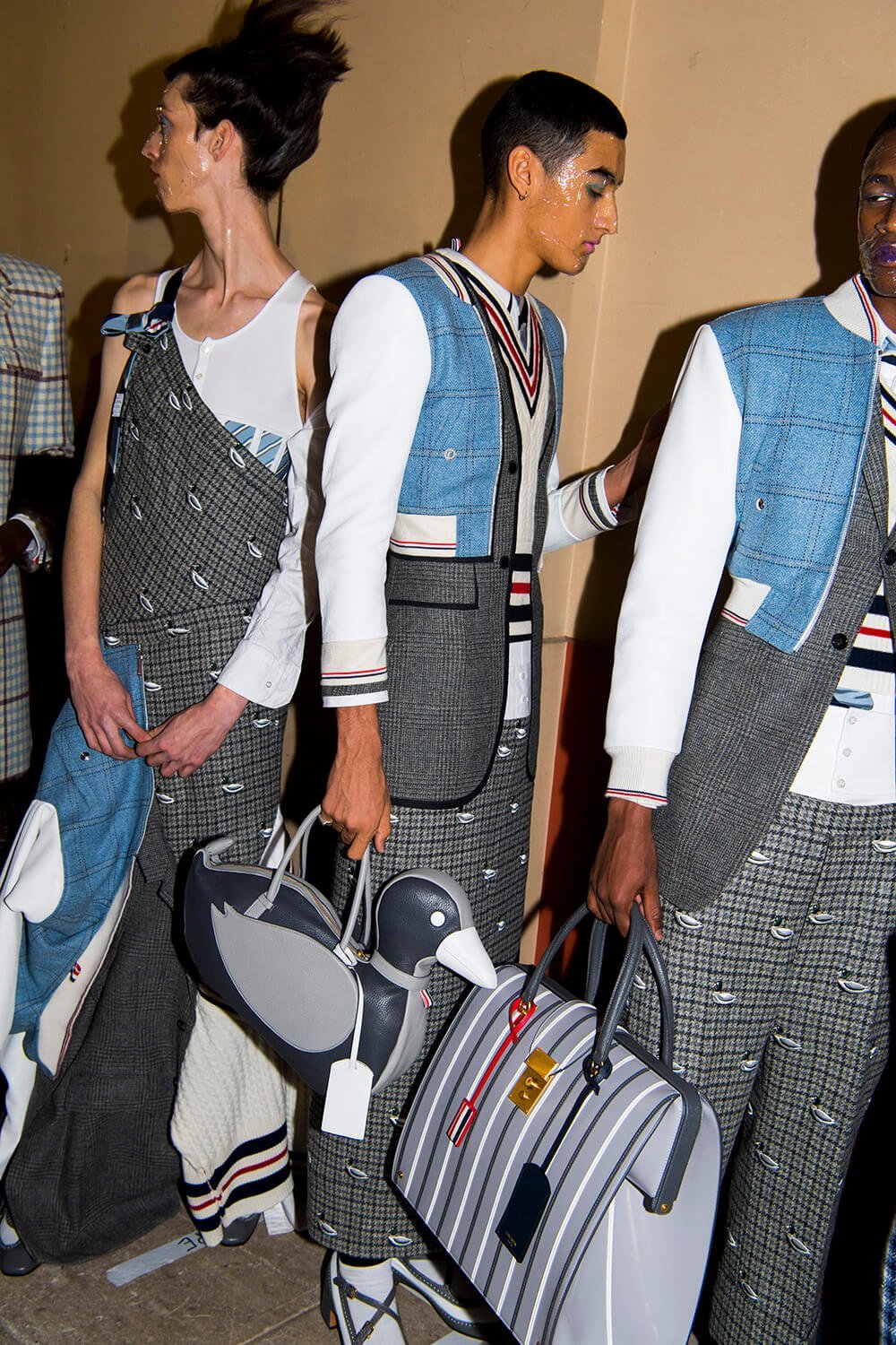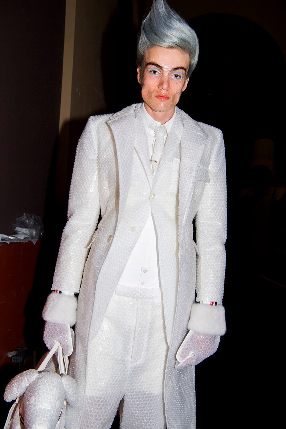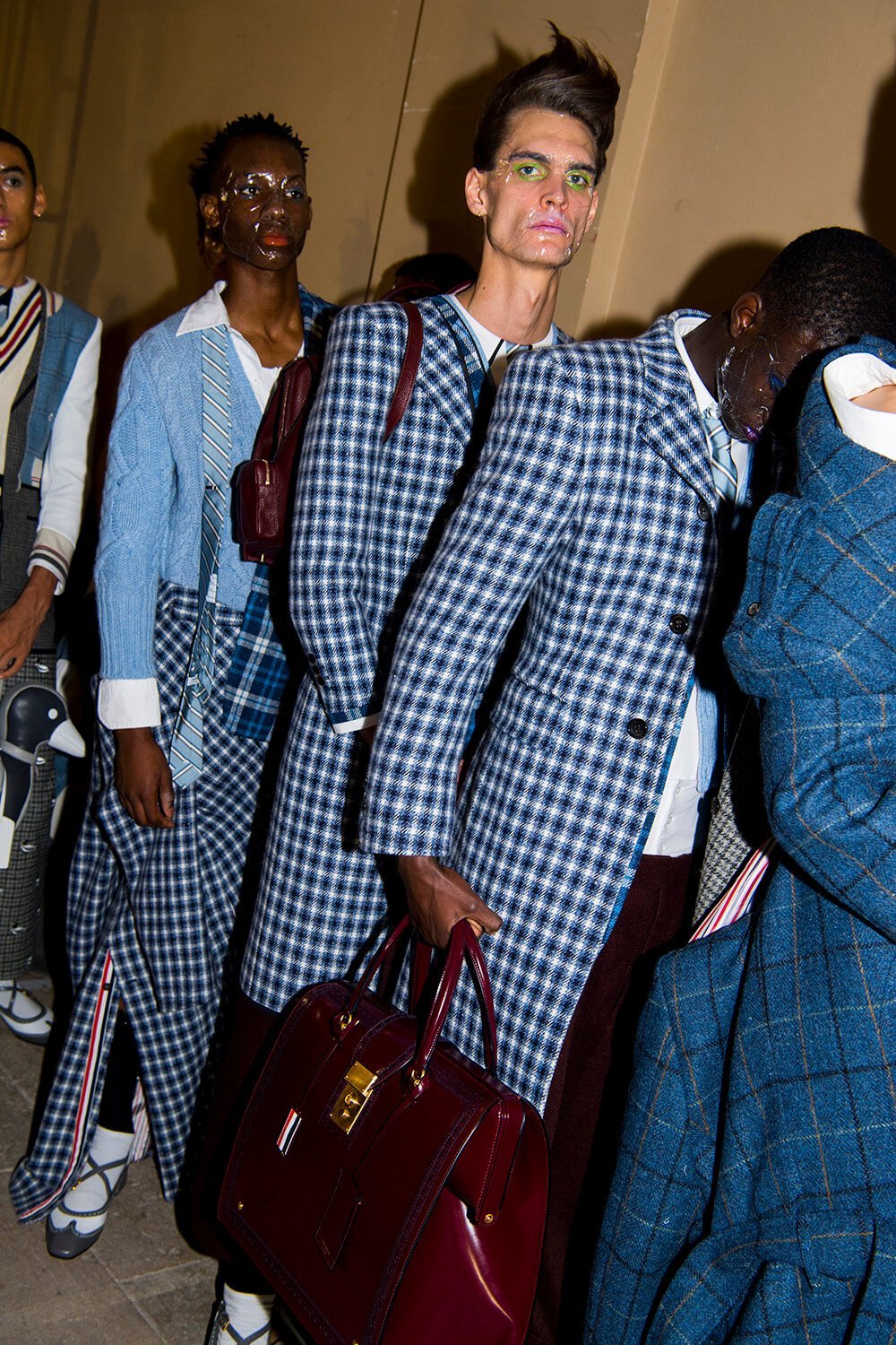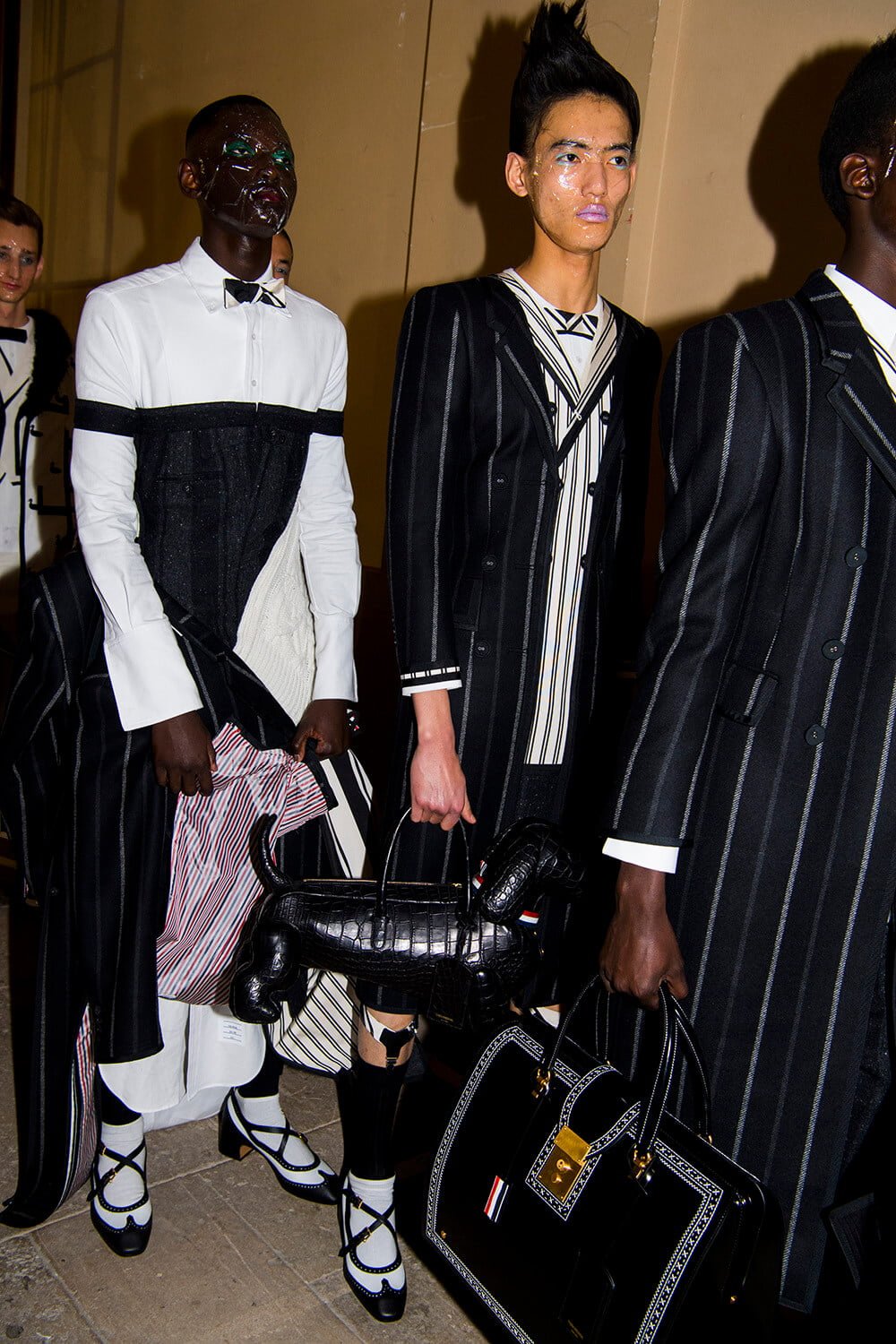 Fusing garments that really belong in a different drawer with something that should have been hung properly in that wardrobe in the spare bedroom; Thom Browne created a series of closet chimeras: coats conjoined with cardis and a jumper. These many-armed monsters hung from models with Sellotape pulled across their faces like a mad Insta-filter. It spoke of flat-packed fast-fashion where your Amazon order fuses to the next, or packing far too much for a weekend away. To give the illusion of volume: padding gave a coat new proportions. Browne’s not just been thinking “flat and fused” but in bulk as well. Unfused and separate, these garments were a Thom Browne lesson in tailoring and technique: congratulations on both counts to the pattern room. There were some sensational slim-fit coats and blazers. And those trompe-l’oeil doctor’s bags!