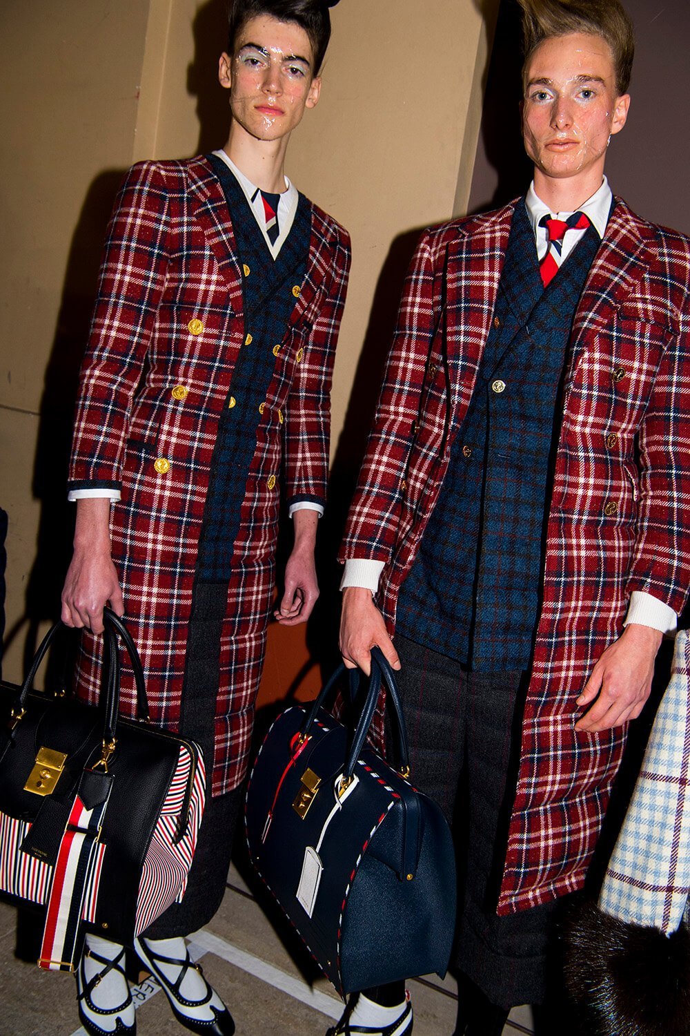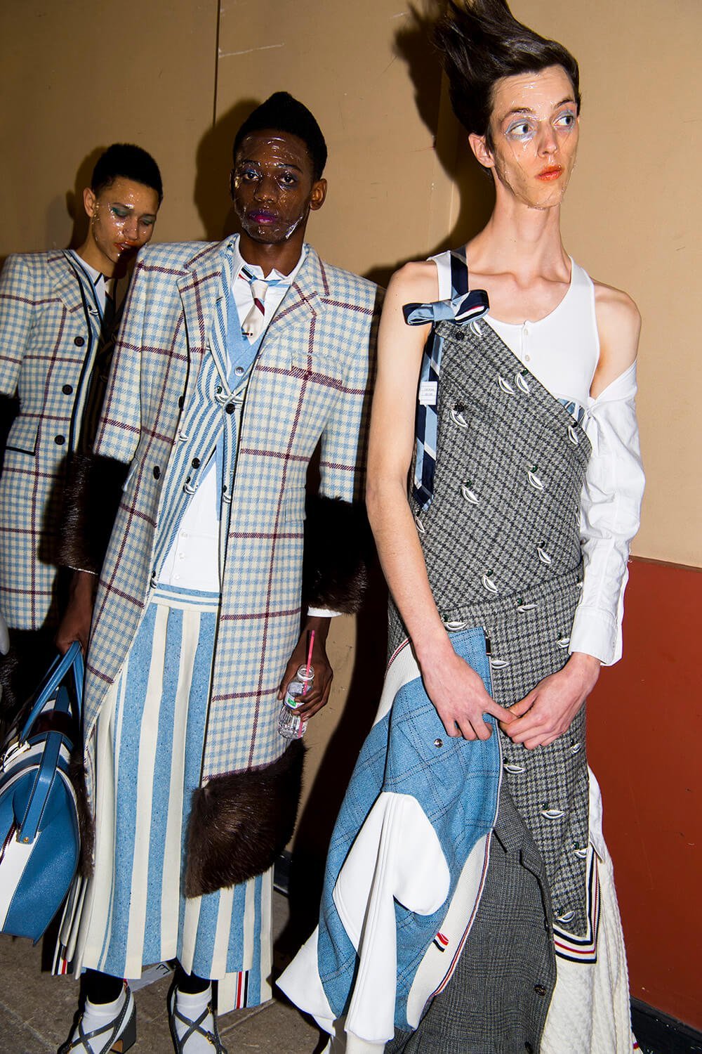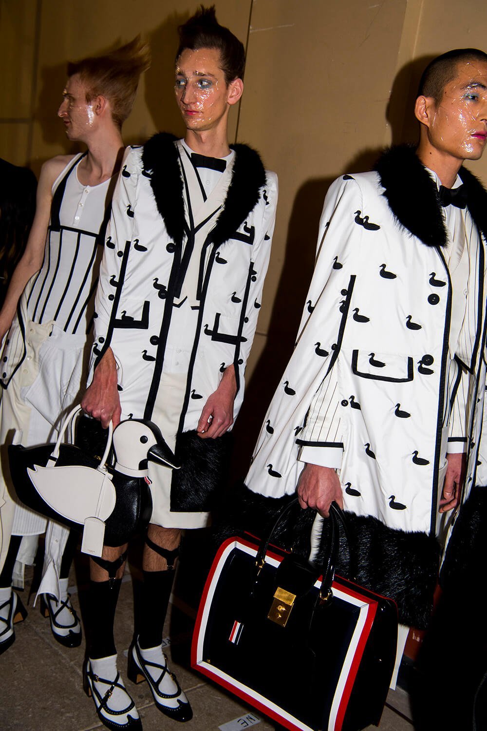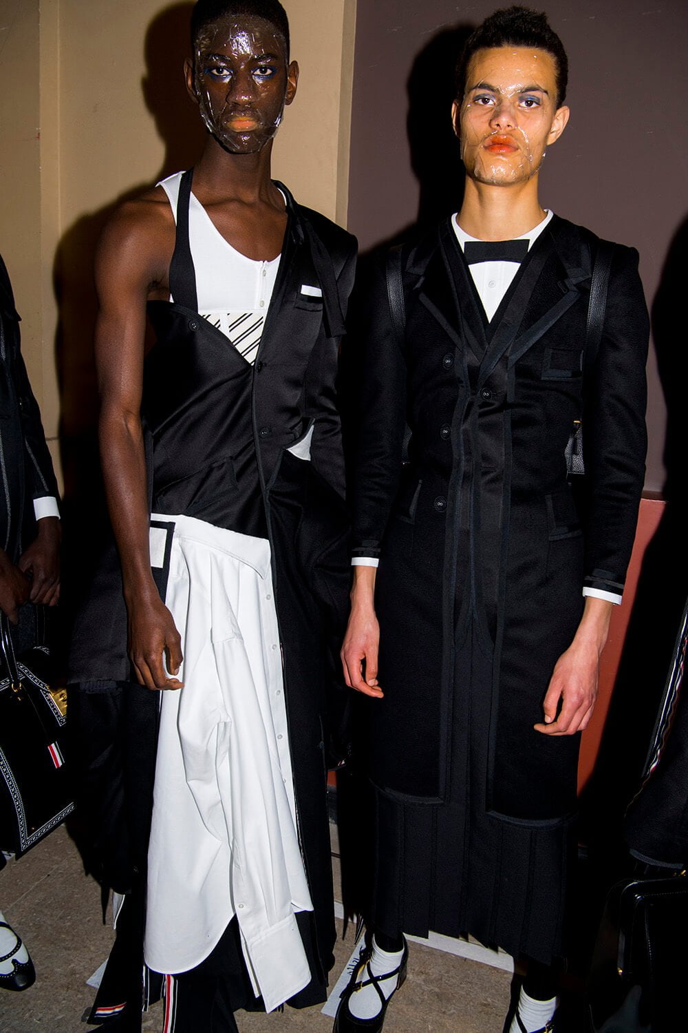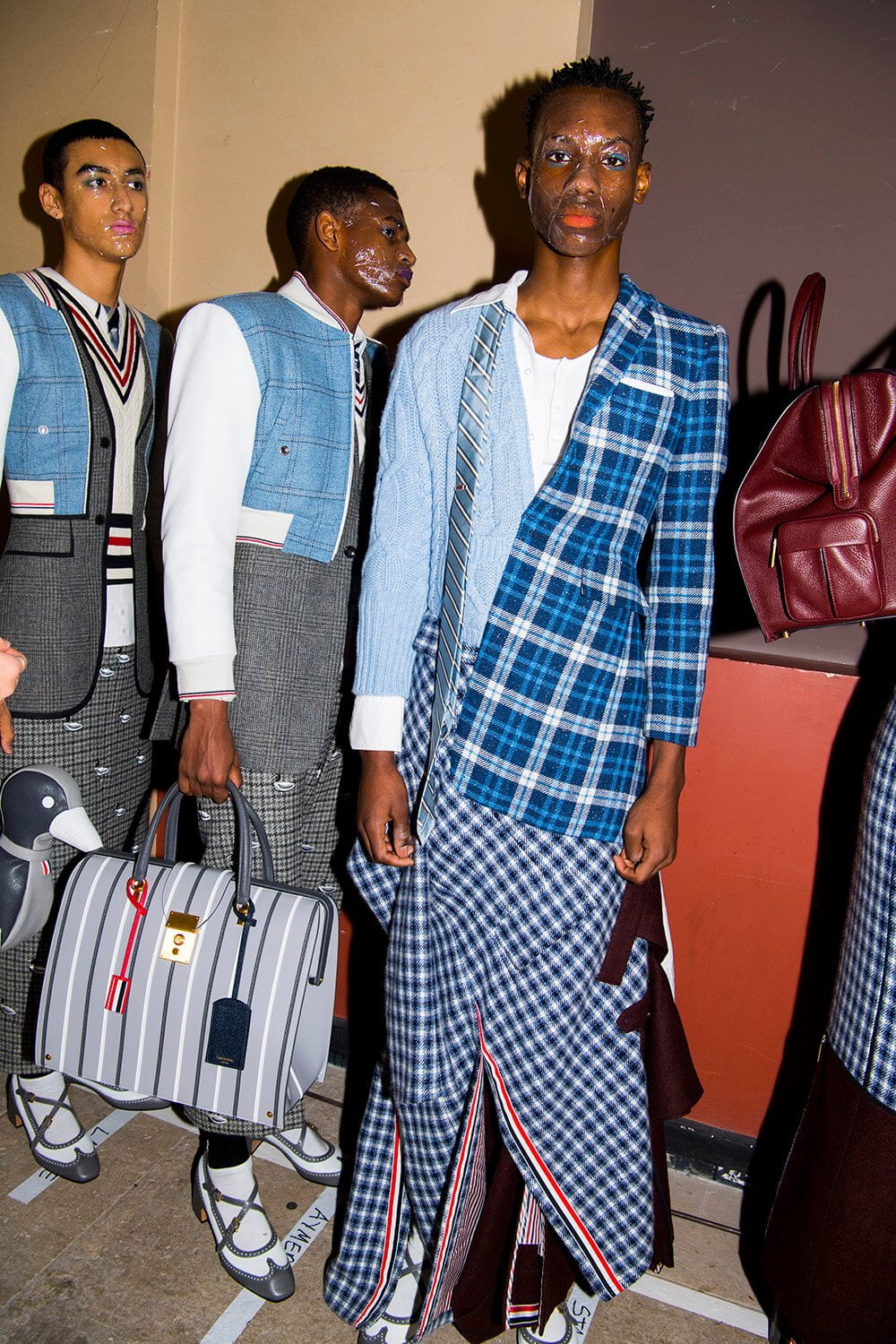 Fusing garments that really belong in a different drawer with something that should have been hung properly in that wardrobe in the spare bedroom; Thom Browne created a series of closet chimeras: coats conjoined with cardis and a jumper. These many-armed monsters hung from models with Sellotape pulled across their faces like a mad Insta-filter. It spoke of flat-packed fast-fashion where your Amazon order fuses to the next, or packing far too much for a weekend away. To give the illusion of volume: padding gave a coat new proportions. Browne’s not just been thinking “flat and fused” but in bulk as well. Unfused and separate, these garments were a Thom Browne lesson in tailoring and technique: congratulations on both counts to the pattern room. There were some sensational slim-fit coats and blazers. And those trompe-l’oeil doctor’s bags!