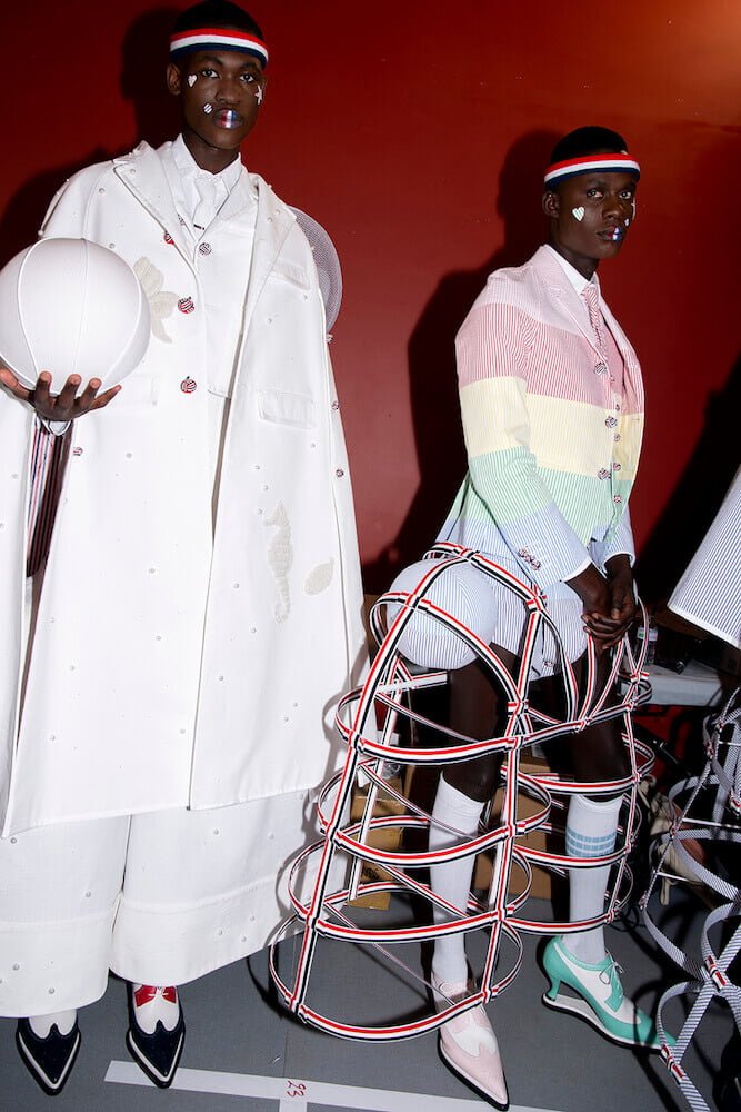 The collegiate worlds of various sports collided with the exquisite world of ballet at the Thom Browne SS20 show. Set in the École nationale supérieure des Beaux-Arts: the home of fine arts teaching in Paris; it was a beautiful backdrop for Thom Browne’s clever blend of sportswear-flexed line-out. This included the shoulder pads of American footballers (in jackets and coats), their masks, too, broken down and abstracted; even the lace-up football became a bum bag. The ovoid shape became padding on elbows and elsewhere on one beautifully crafted coat, too.