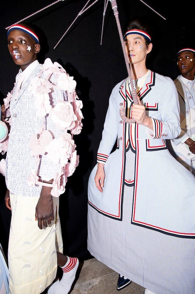 At the beginning of the show: fun! When a tutu-wearing ballet dancer James Whiteside (of American Ballet Theatre) unzipped models (who were stood on plinths) and wearing fancy zip-bags (the kind you keep in your wardrobe) to reveal exquisite cotton Seersucker shorts suits in pastels and a delicious lemon. It was bizarre and beautiful. In the centre of the runway a Manekken Pis – the 61 cm bronze sculpture and tourist must-see in the centre of Brussels. Brown rendered his version in a material tape. Tennis balls in tape surrounded the statue. It was a cheeky allegory for the “sportswear codes meets high art and culture” inspiration behind this master-tailor’s mood next spring. Such brilliant fun.