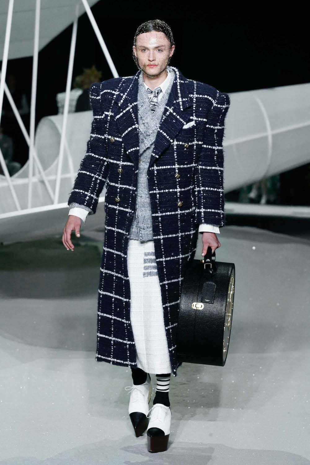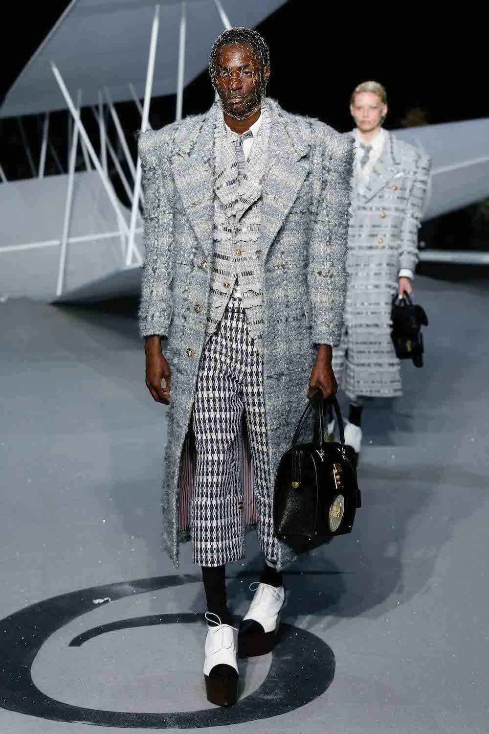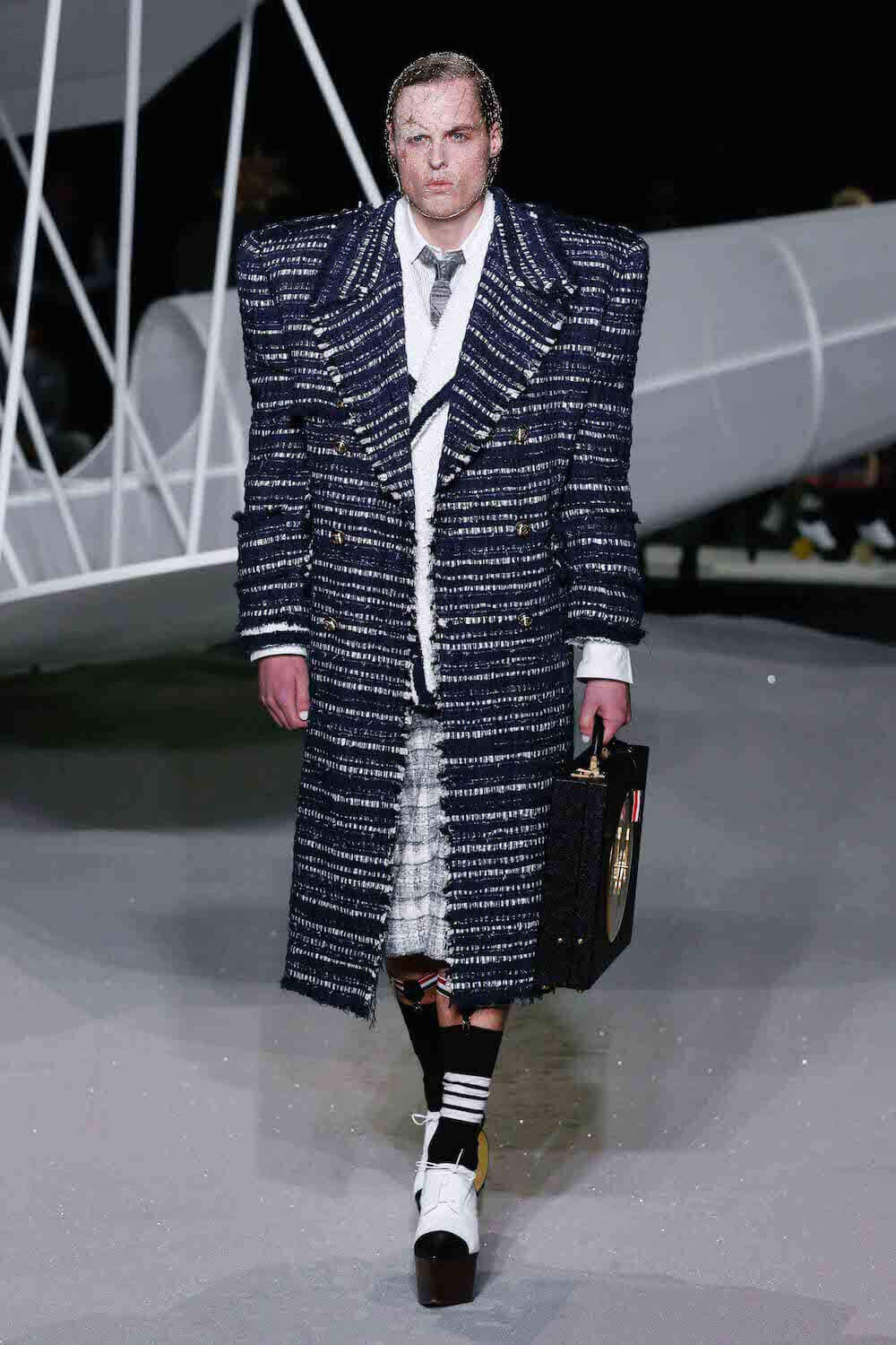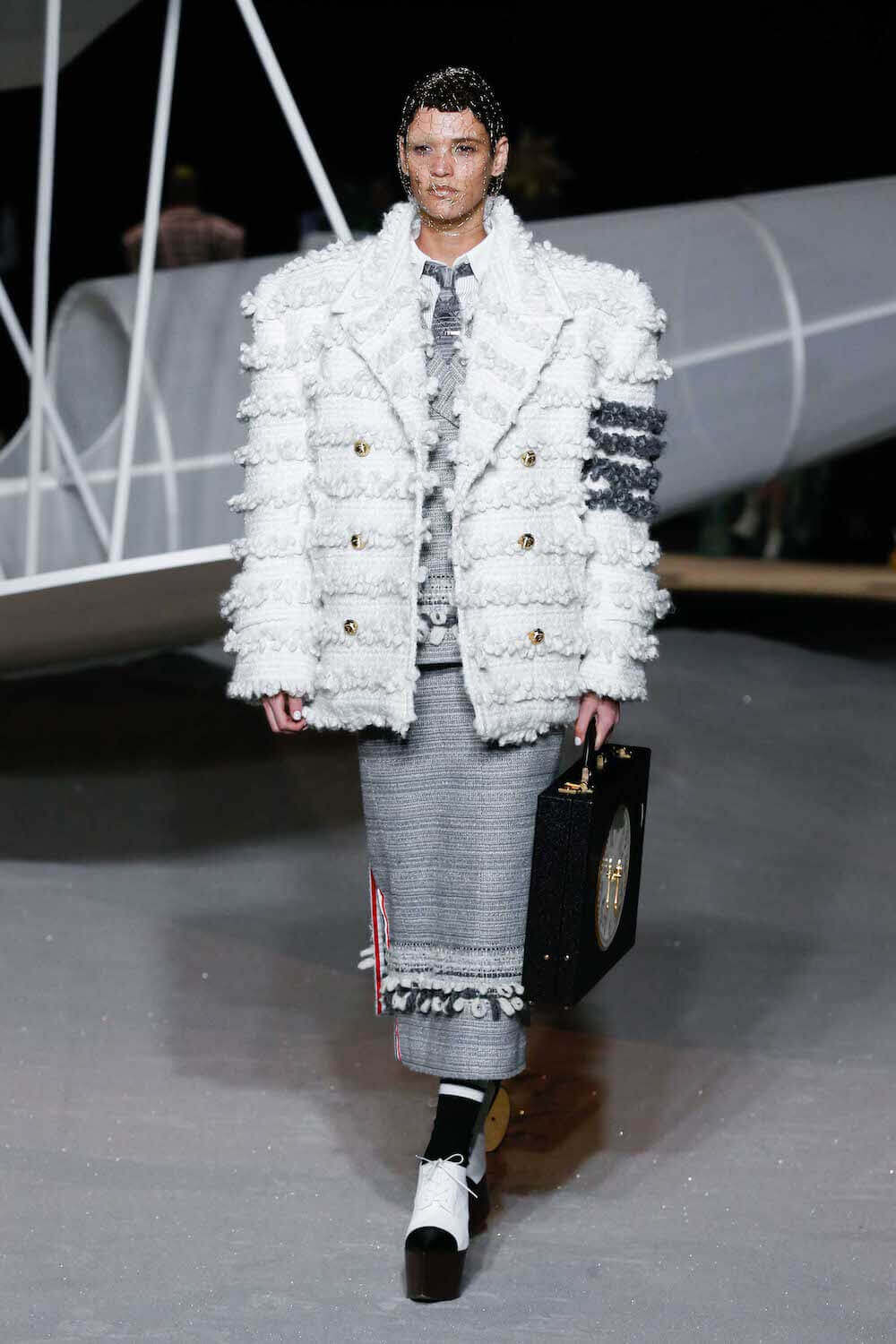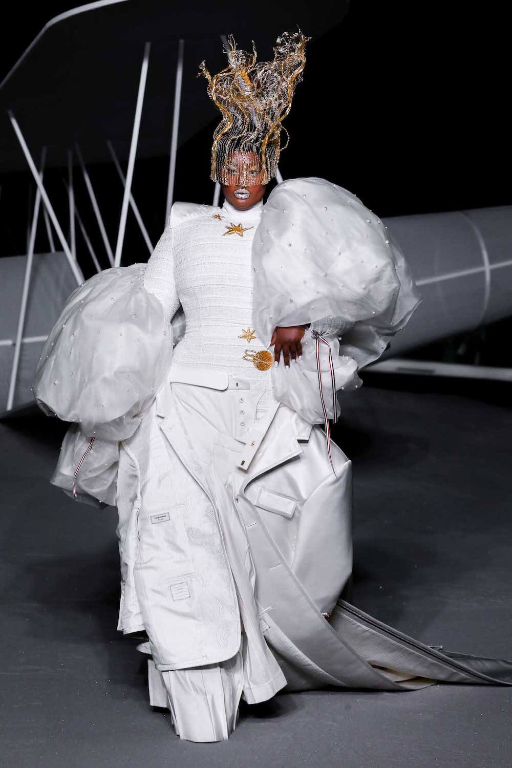 Earlier this year, Thom Browne began his role as chairman of the CFDA, returning to New York Fashion Week last night with a collection largely based on The Little Prince by Antoine de Saint-Exupéry. The story – which follows a boy living on an asteroid who stumbles upon a lost pilot who has crashed in a desert – inspired Browne to envision quite the set, as a cluster of planets (ironically, looking a bit like spy balloons) hung high above a giant plane plonked in a lake of sand.