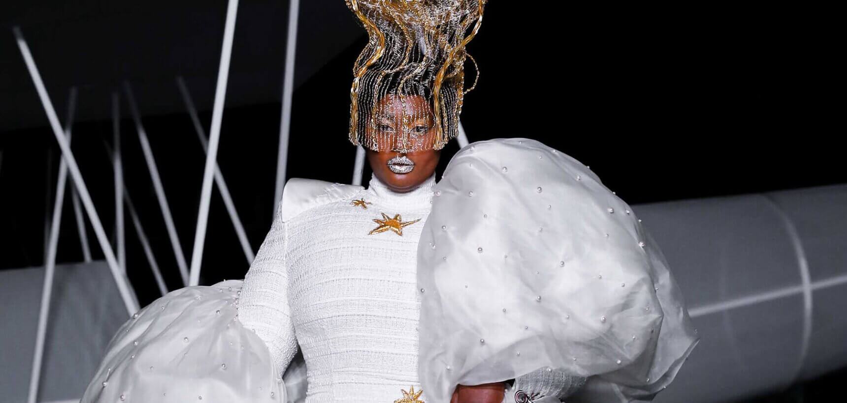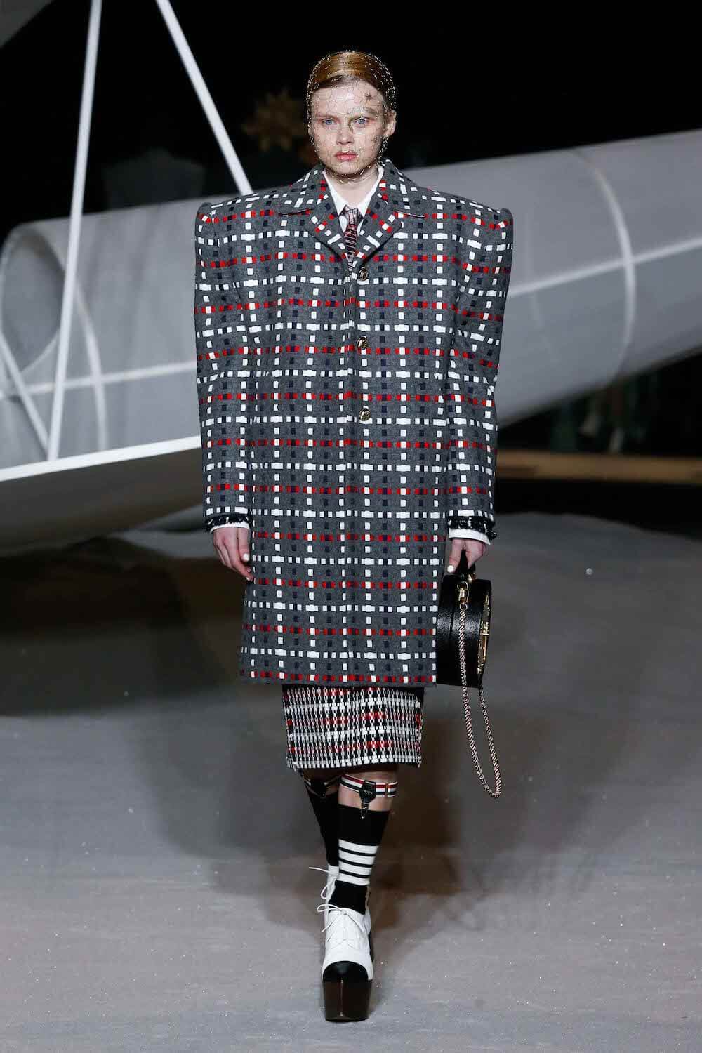 The clothes were equally as grand. Browne, whose brand is built on strict, shrunken tailoring, lets fantasy flourish when it comes to his catwalk spectacles. Here, brocade tweed overcoats, in Browne’s signature red, white and blue colourway, came with hulking shoulders. Some models looked like the Nutcracker, if only he was descended from outer space, sporting sculpted plaid pencil skirts and crop tops, with paisley jacquard bodycon frocks worn beneath.