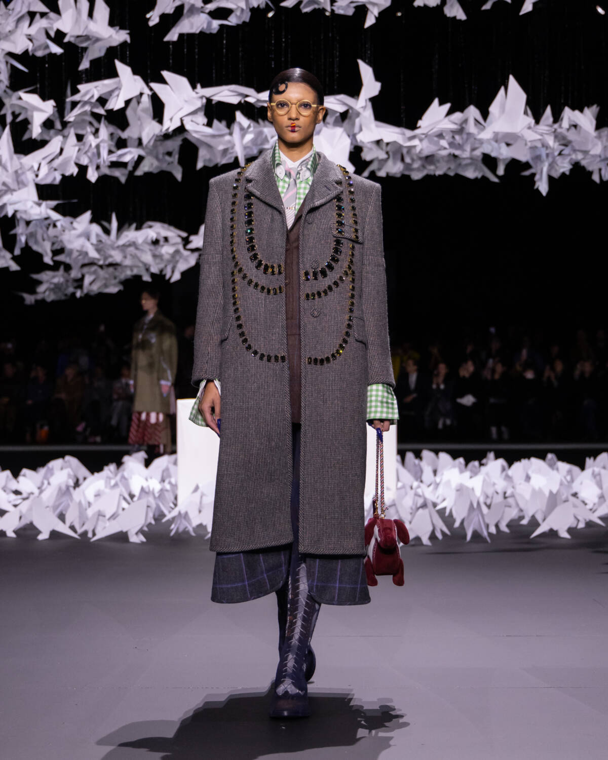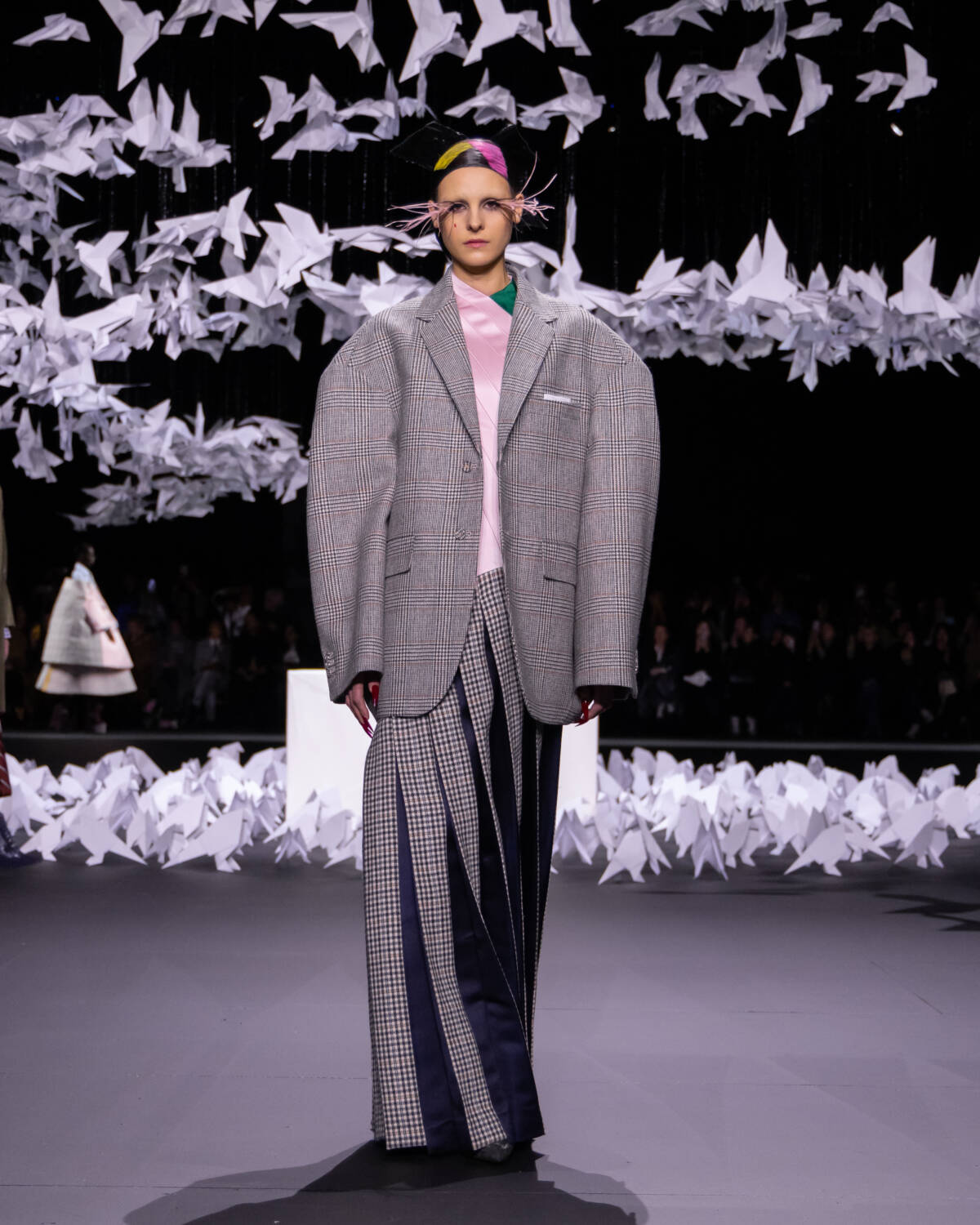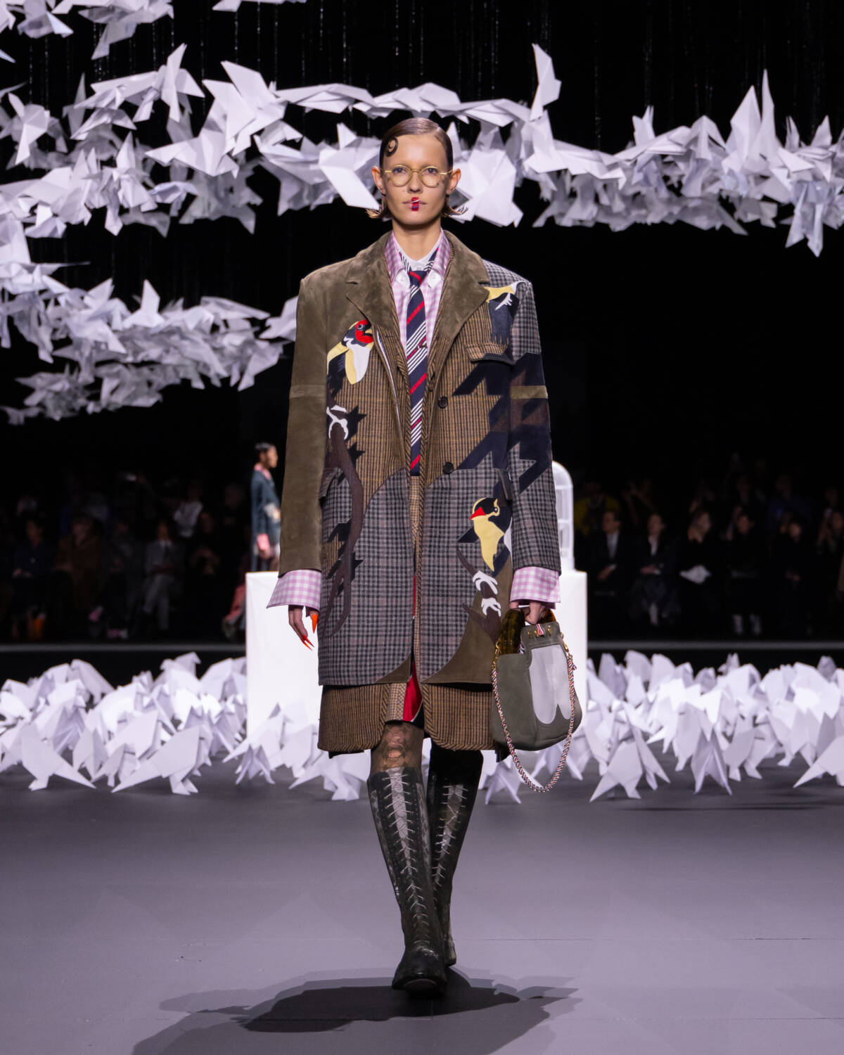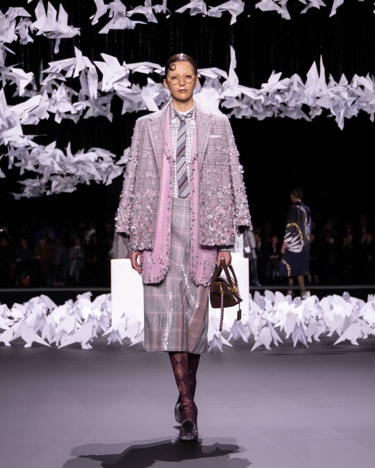 Leave it to Thom Browne to provide a necessary jolt of fashion escapism to close out New York Fashion Week. The designer has taken to presenting his runway show every February as the last spot on the schedule, with each year being more fantastical than the last. As usual, he transformed a dark space inside Hudson Yards’ art space, The Shed, leading us into a room with 2000 origami paper cranes dotting the centre of the floor. The inspiration? Birds as a symbol of hope and freedom, as the show notes included a quote that read “How marvellous would it be, to be exactly who we wish to be?” With a soundtrack that included a selection of songs from the 2023 coming of age film White Bird and other avian-themed tracks, it seemed Browne was looking to give us the escape that we so craved.