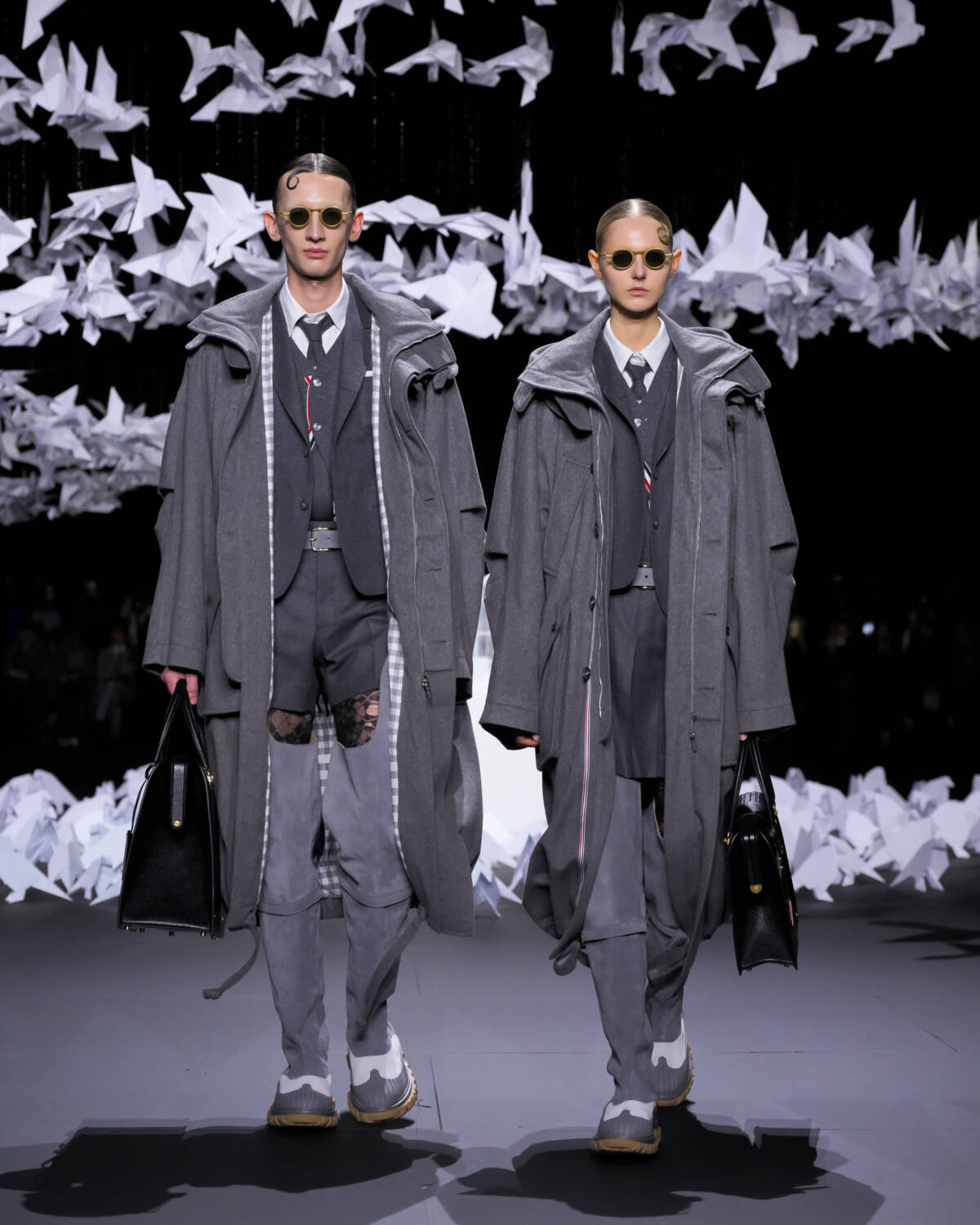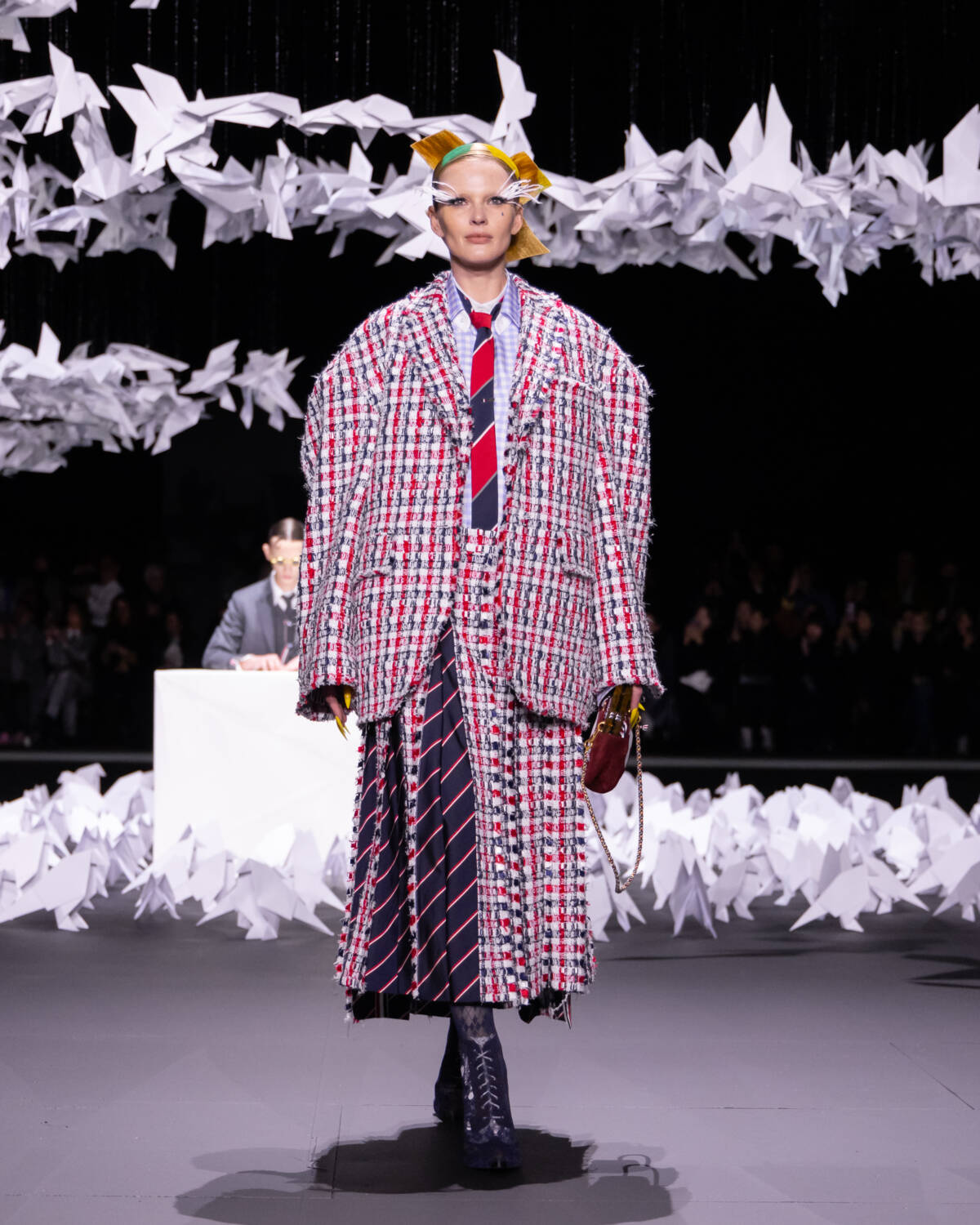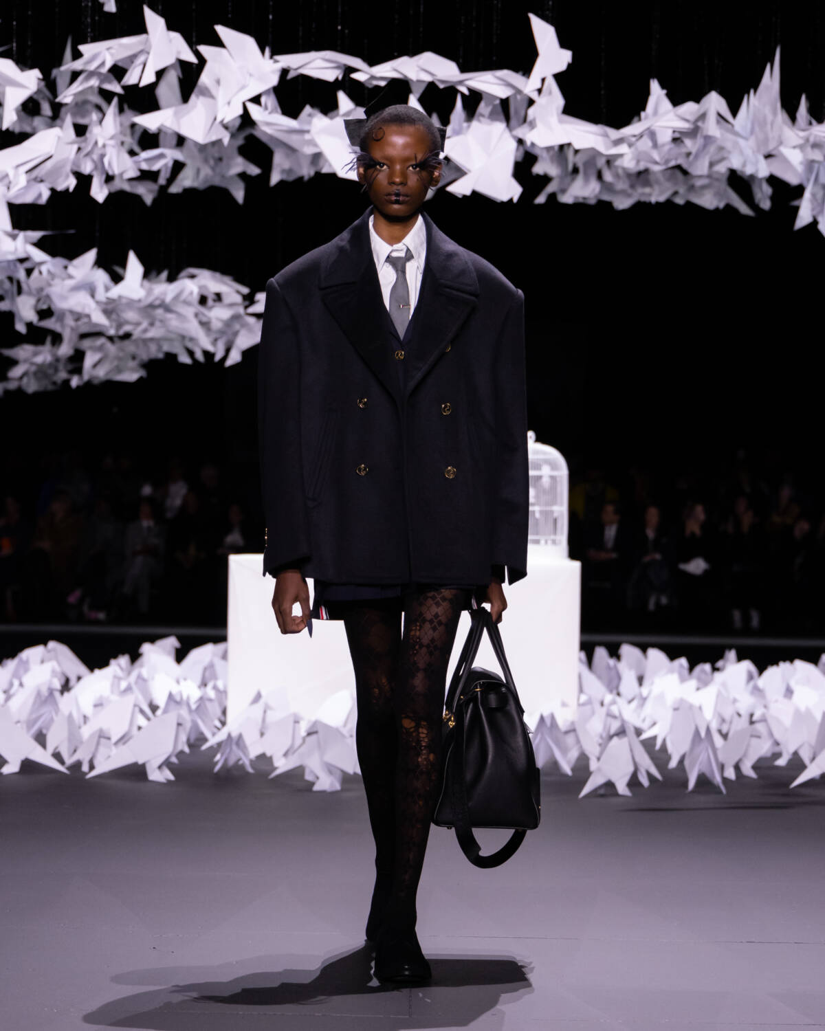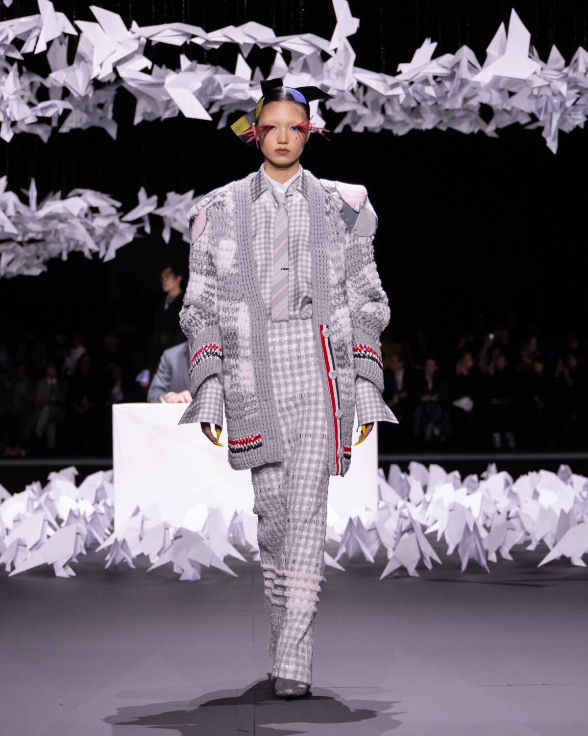 Leave it to Thom Browne to provide a necessary jolt of fashion escapism to close out New York Fashion Week. The designer has taken to presenting his runway show every February as the last spot on the schedule, with each year being more fantastical than the last. As usual, he transformed a dark space inside Hudson Yards’ art space, The Shed, leading us into a room with 2000 origami paper cranes dotting the centre of the floor. The inspiration? Birds as a symbol of hope and freedom, as the show notes included a quote that read “How marvellous would it be, to be exactly who we wish to be?” With a soundtrack that included a selection of songs from the 2023 coming of age film White Bird and other avian-themed tracks, it seemed Browne was looking to give us the escape that we so craved.
