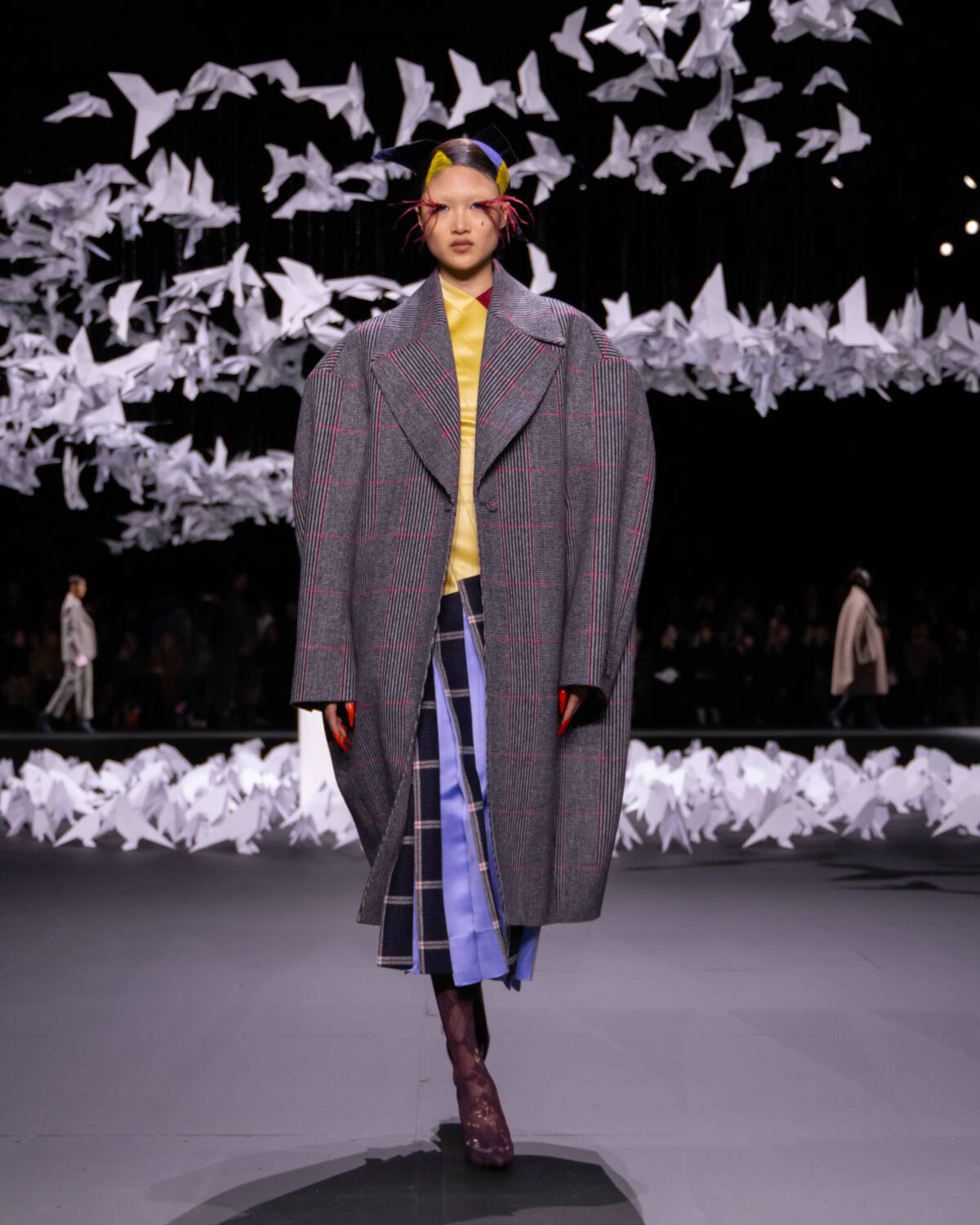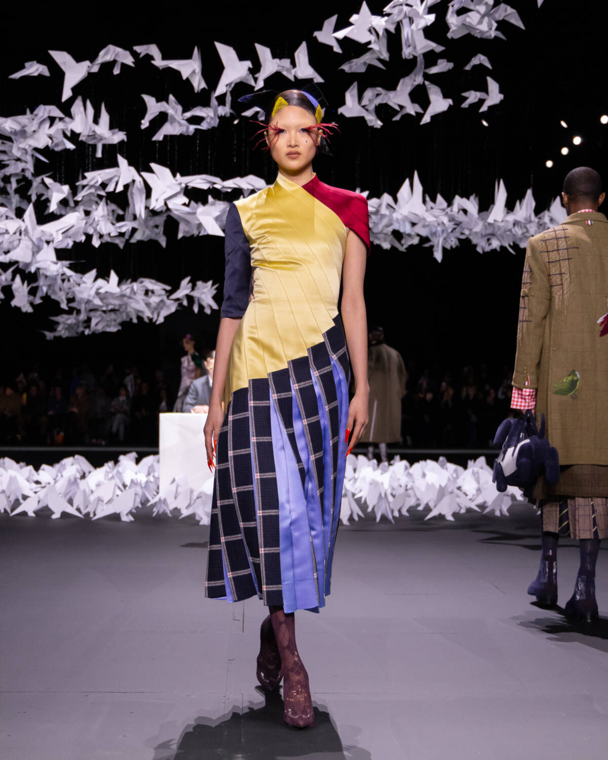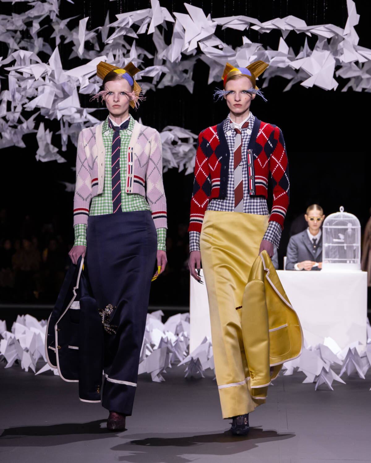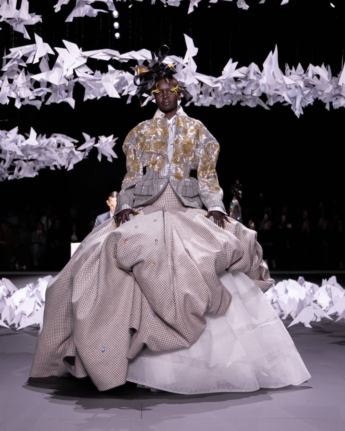 Leave it to Thom Browne to provide a necessary jolt of fashion escapism to close out New York Fashion Week. The designer has taken to presenting his runway show every February as the last spot on the schedule, with each year being more fantastical than the last. As usual, he transformed a dark space inside Hudson Yards’ art space, The Shed, leading us into a room with 2000 origami paper cranes dotting the centre of the floor. The inspiration? Birds as a symbol of hope and freedom, as the show notes included a quote that read “How marvellous would it be, to be exactly who we wish to be?” With a soundtrack that included a selection of songs from the 2023 coming of age film White Bird and other avian-themed tracks, it seemed Browne was looking to give us the escape that we so craved.