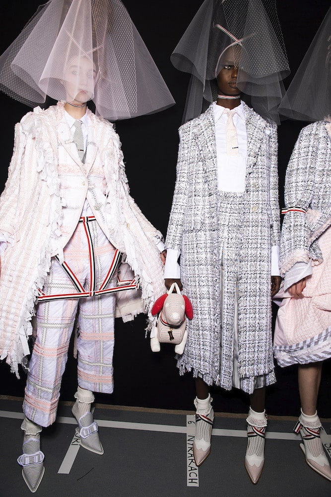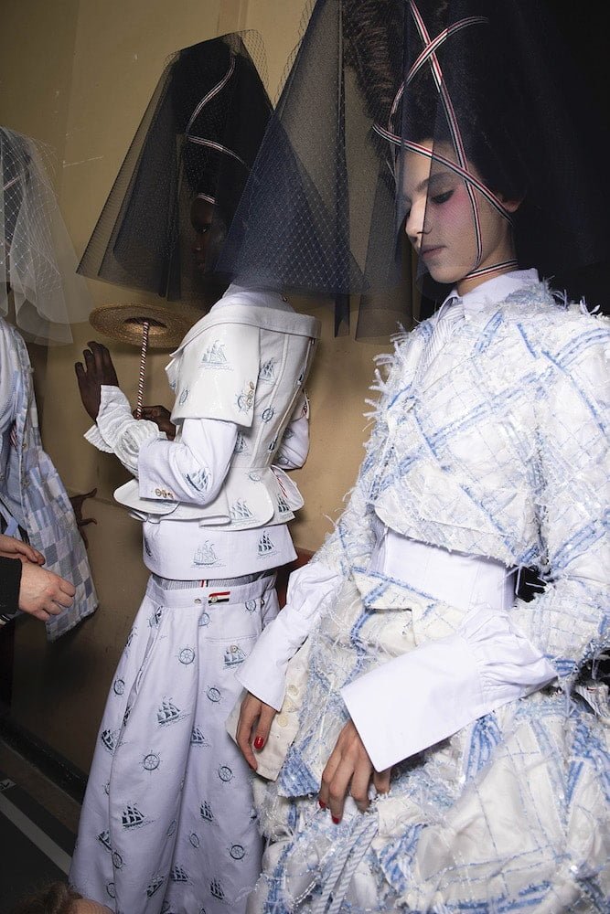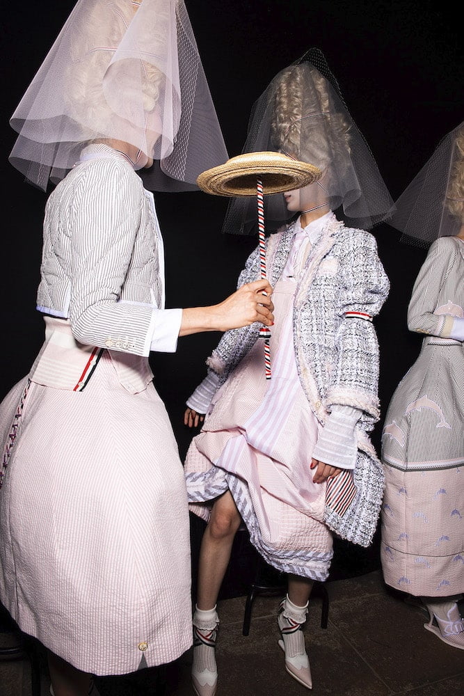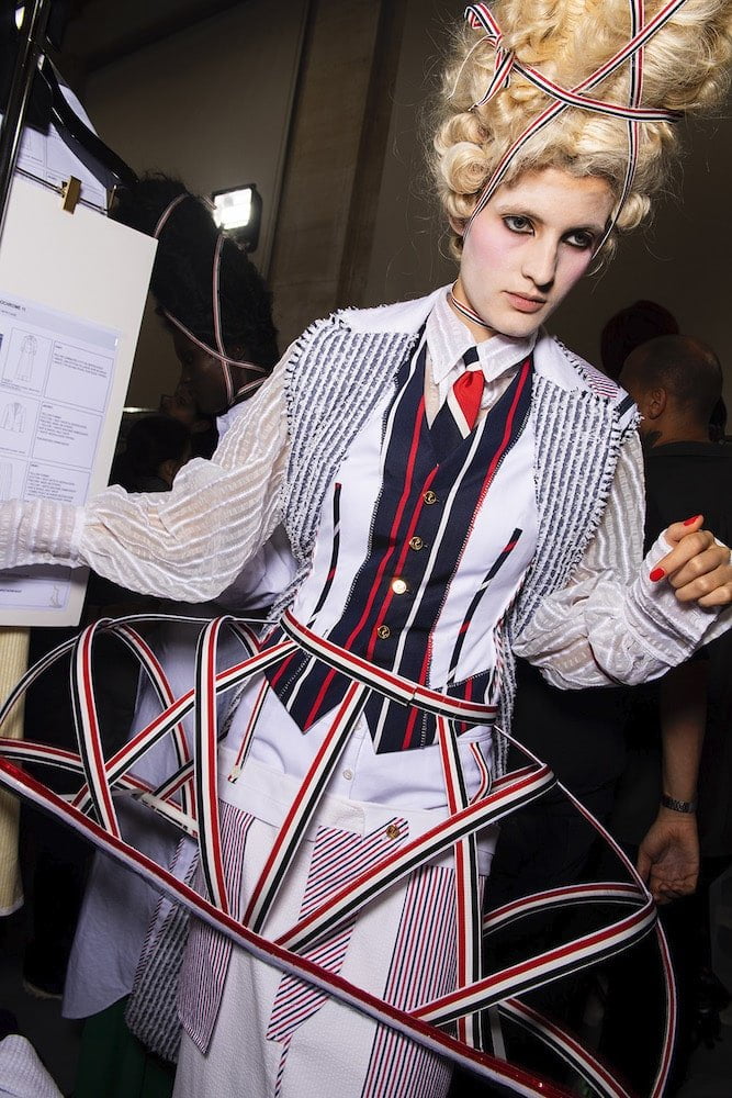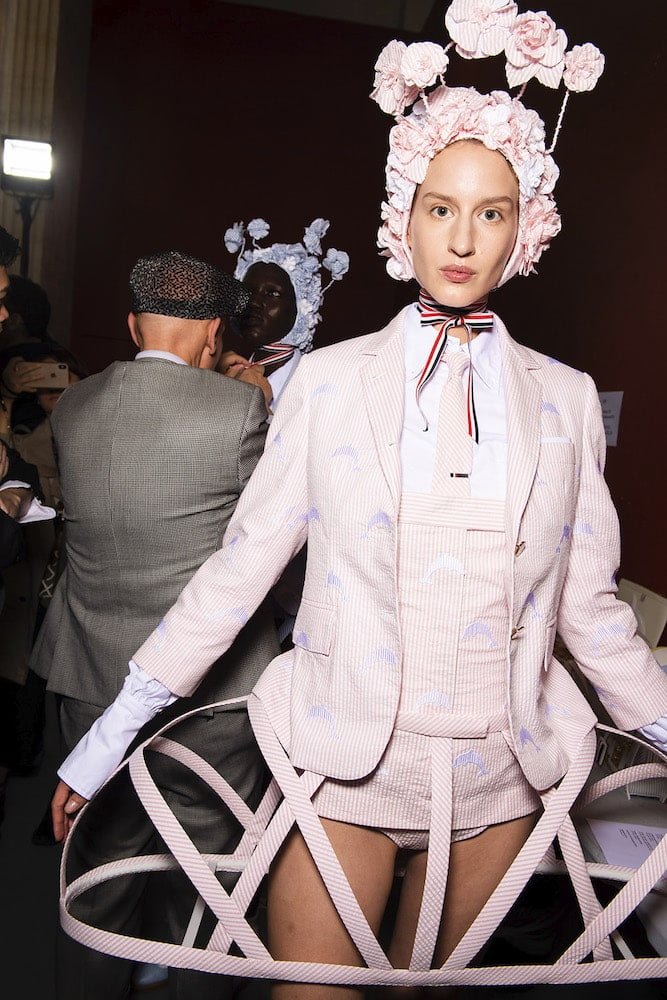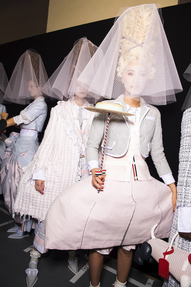 Billy Porter might have won the London Fashion Week street style game, but Marie Antoinette seems to be the accidental icon of the SS20 season. At Westwood and Bovan, bustles and panniers have part of the conversations for seasons. But now even Rei Kawakubo and Demna Gvasalia seem to be looking at the 18th century garments for construction inspiration. Sexy minimalism aside, the rich volumes and abundance of textiles seem to be the direction fashion is heading. And Thom Browne is right at the forefront of this rococo revival.