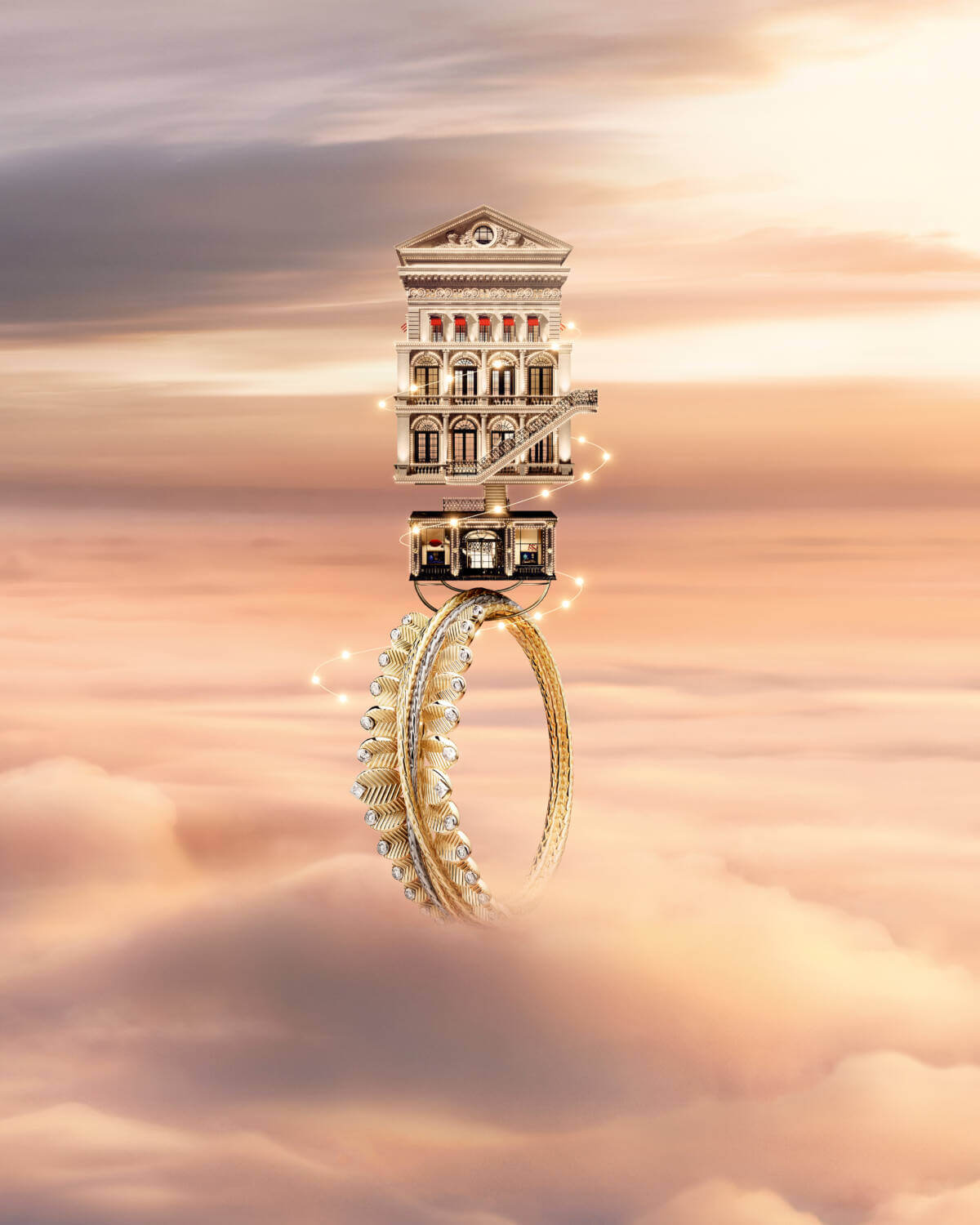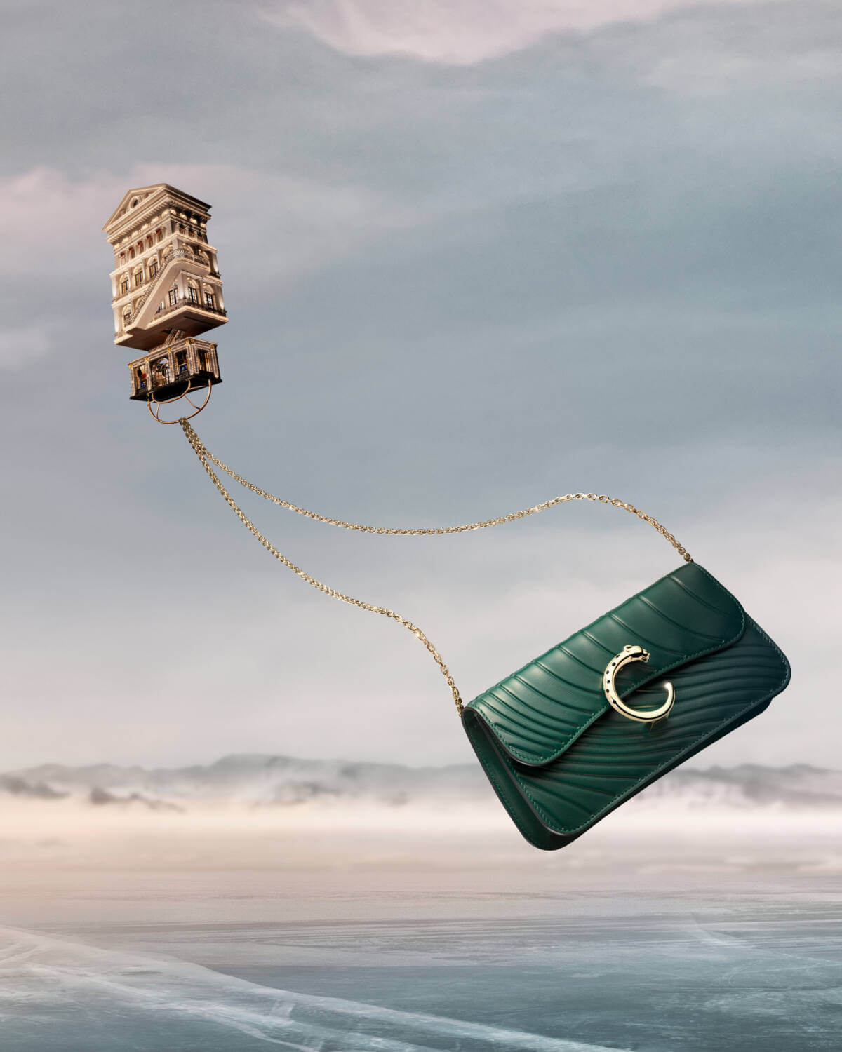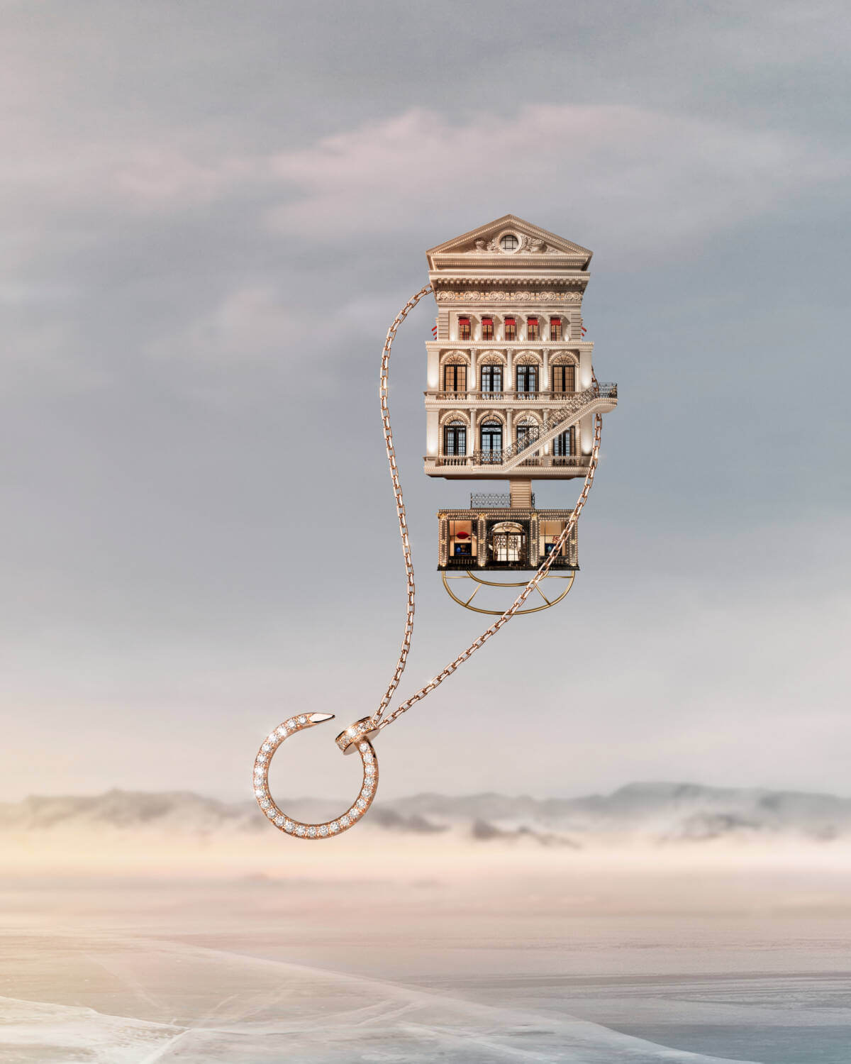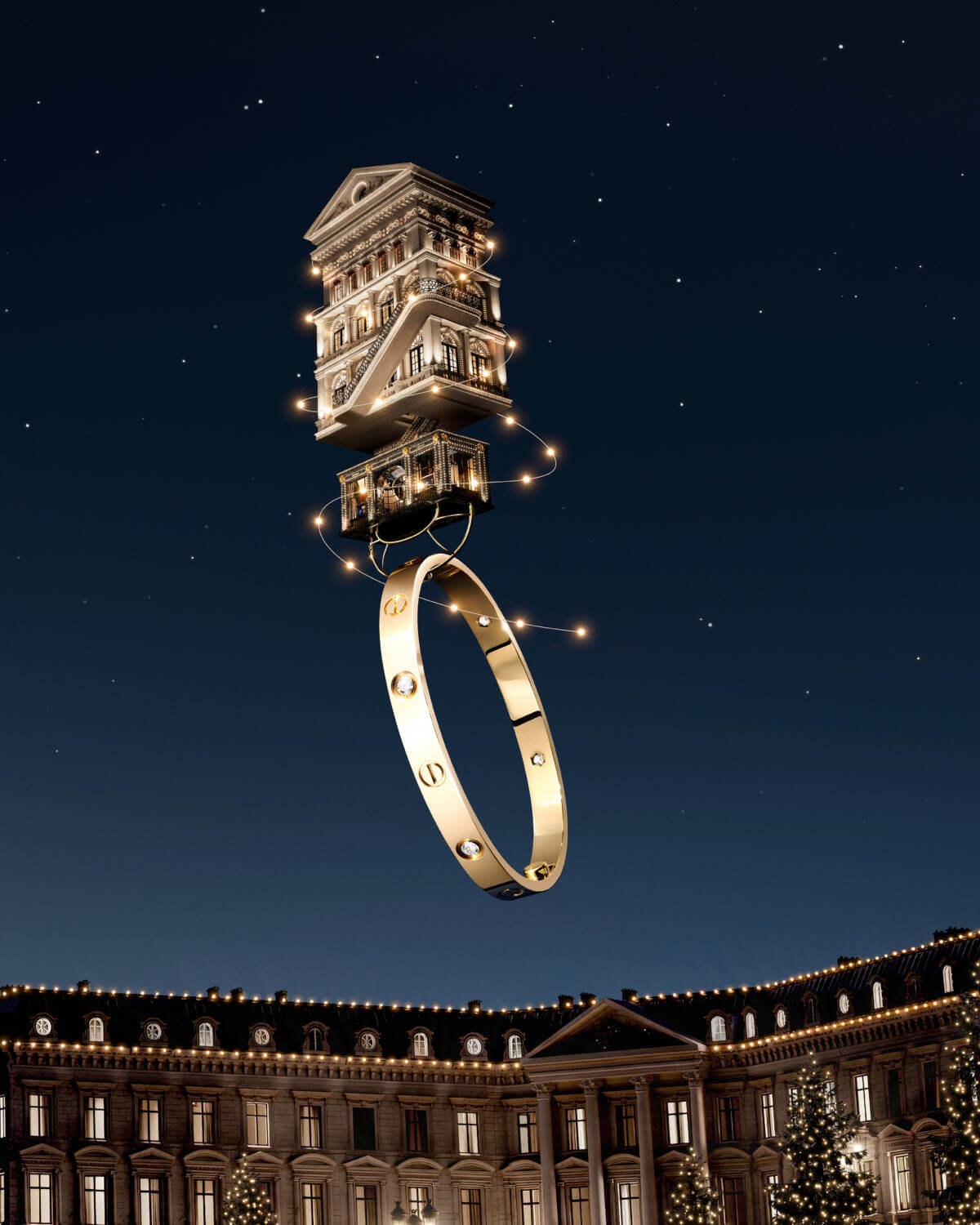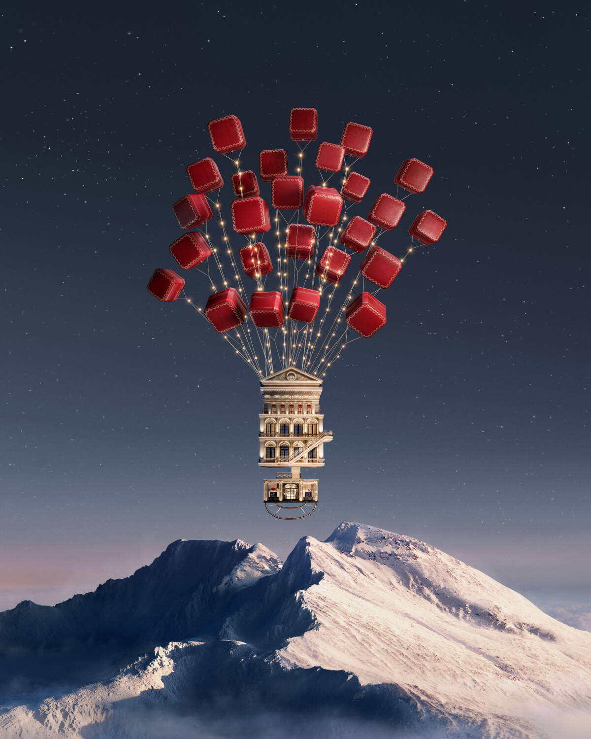 As the festive season approaches, Cartier, the epitome of timeless elegance and luxury, has once again unwrapped a dazzling Christmas campaign that promises to captivate hearts and rekindle the spirit of the holidays. Inspired by architectural elements from its very own boutiques, the Fabulous House is an imaginary Cartier boutique that lifts off the ground and journeys across the night sky leaving a trail of precious gifts in its wake. As the iconic stores of the Maison float gracefully over majestic mountains, they’re anchored by none other than the brand’s iconic red jewellery boxes that, instead of mere containers, now act as whimsical balloons, carrying its legacy to new heights.