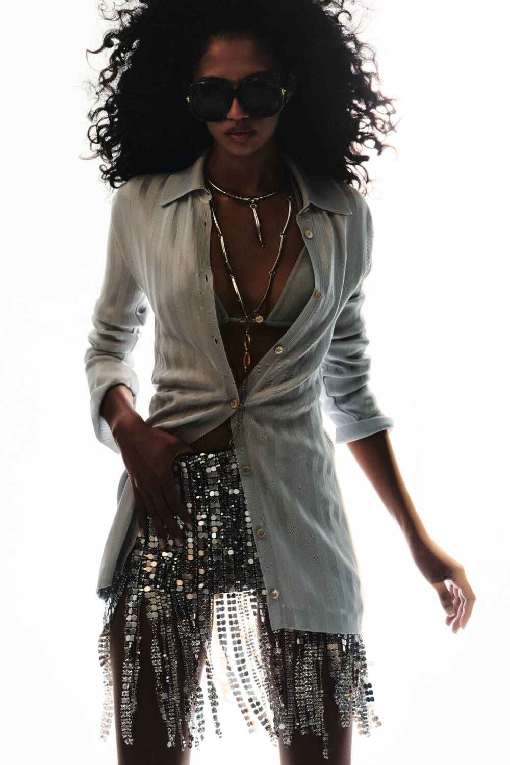 The high-octane collection, displayed in an exhibition style showcase with mannequins donning unapologetically sexy silhouettes and plenty of glitz, worked to create a picture of the Tom Ford woman. She’s multifaceted, confident, iconic. She wears micro-mini hot pants with short, slim blazers or short, sequin dresses, sometimes with statement sunnies or body-embracing jewels, and shows her sportier side in soft satin trousers, drawstring shorts and satin bombers. The looks, mining into the archives of ‘60s and ‘70s style, felt carefree, but with a drop-dead gorgeous, femme-fatale edge.