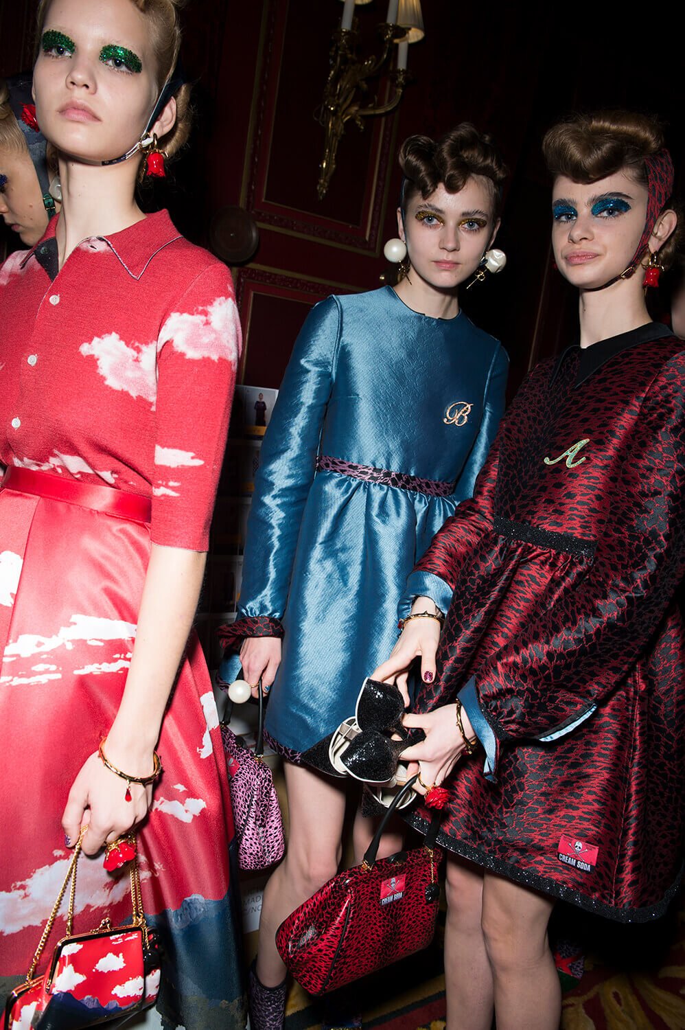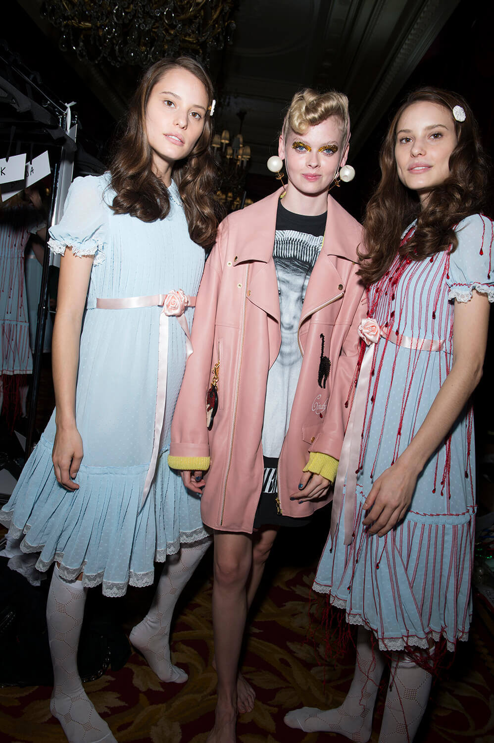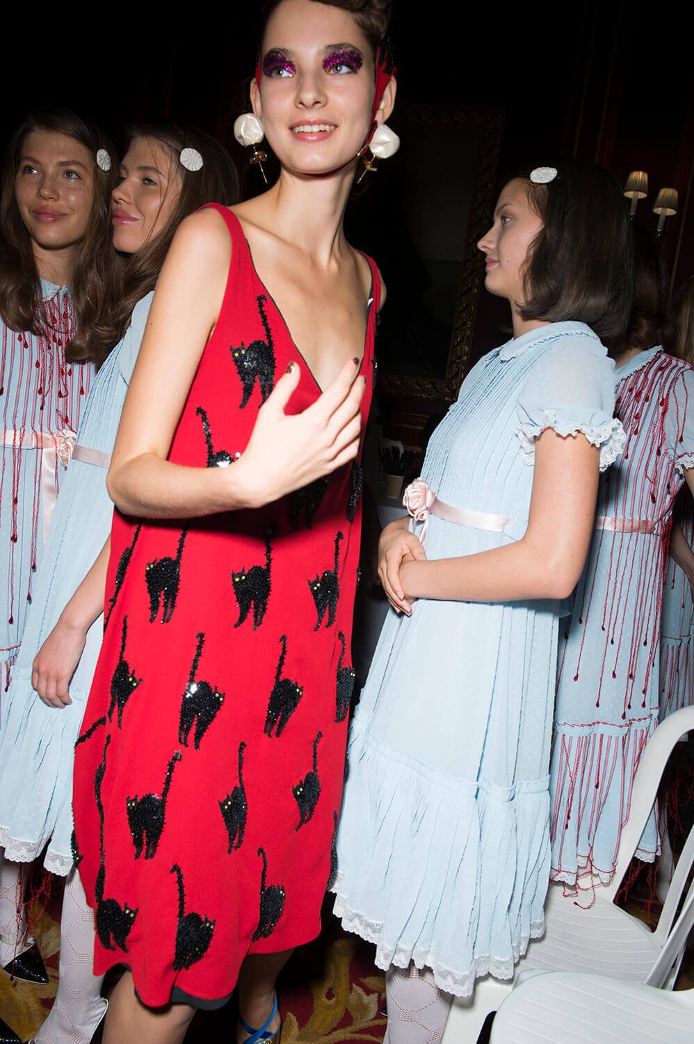 The clothes spliced decades together with a big emphasis on the 1950s: nip-and-kick satin printed gowns for a big band be-bop, to pretty day-frocks for shopping. It was twee and innocent and had an unnerving edge.