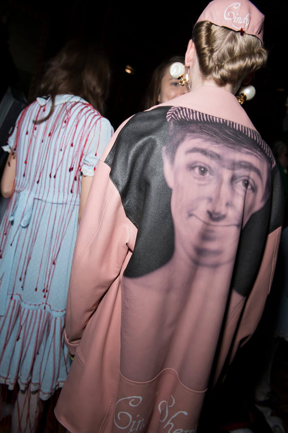 Takahashi played with sporty shapes too, a t-shirt dress worn with long socks and wooden block wedges – very Shibuya. Throughout the show, too, were images of Cindy Sherman the American (and highly collectible) photographic artist, who stars in her own pictures, made up as strange characters using wigs and prosthetics and sometimes clown-like makeup. Sherman’s two sides (the one behind the lens and the one she projects in front of it) were yet another of the designer’s riffs on the power of two.