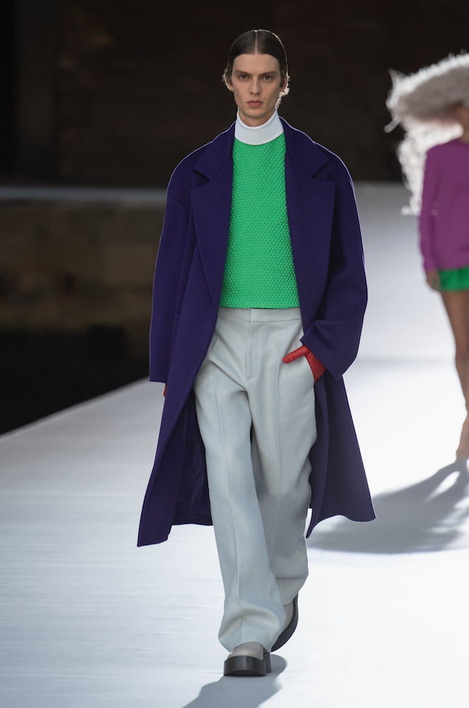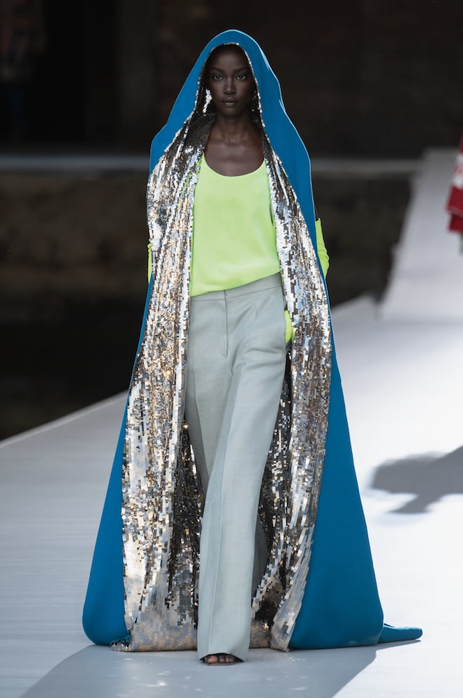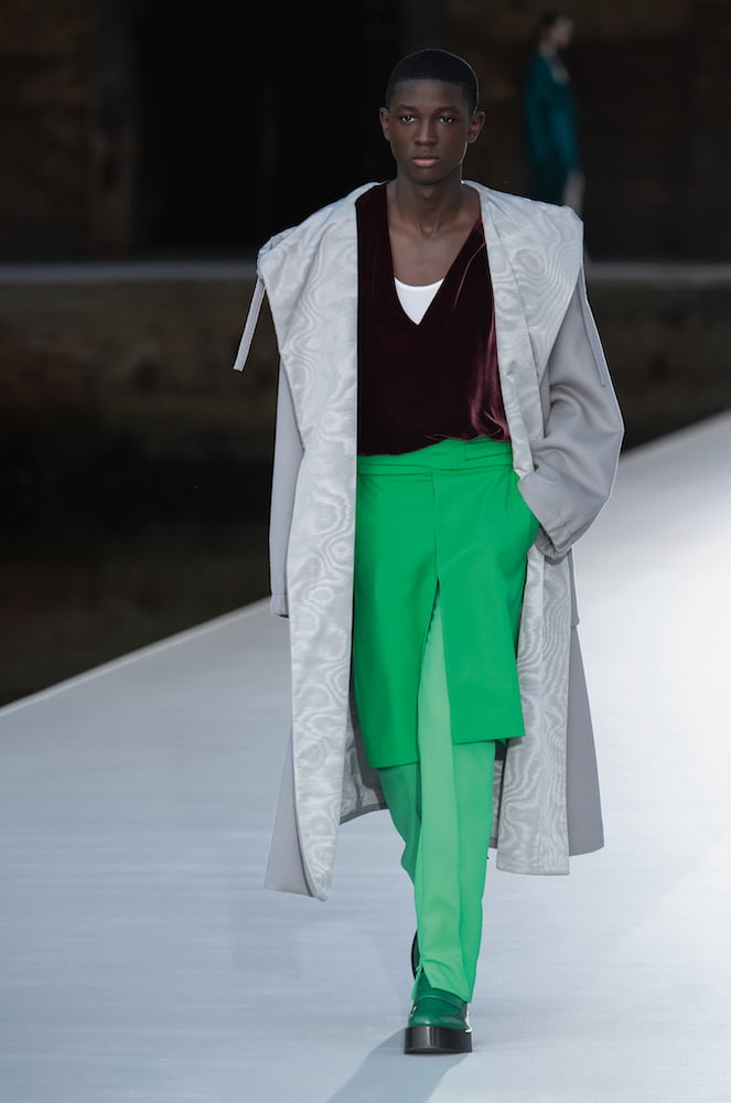 Piccioli firmly believes in couture daywear – for men and women. Skirts were layered over trousers and elegantly draped coats, slouchy trousers, and silk tees were worn by boys and girls alike. These deceptively simple but beautifully finessed pieces had haute couture flourish, including a cerulean blue, floor length cape lined in glittering gold.