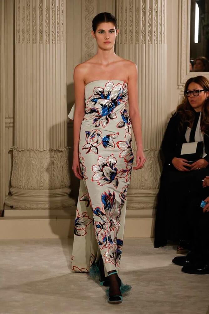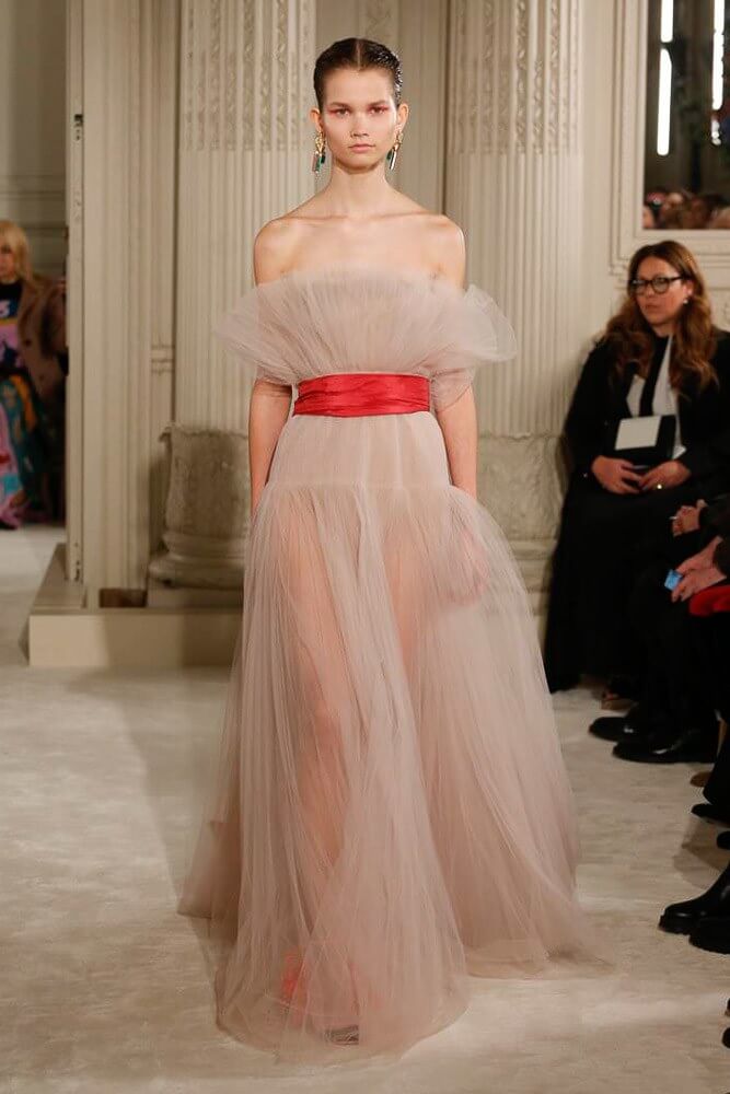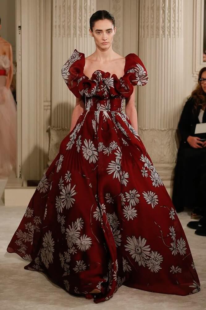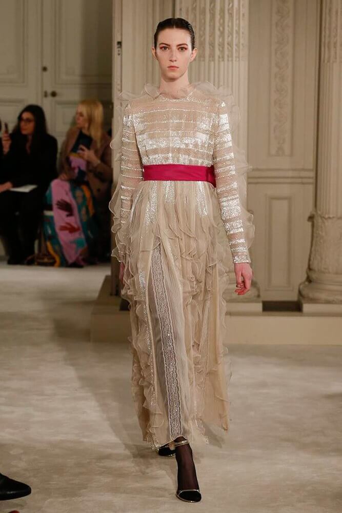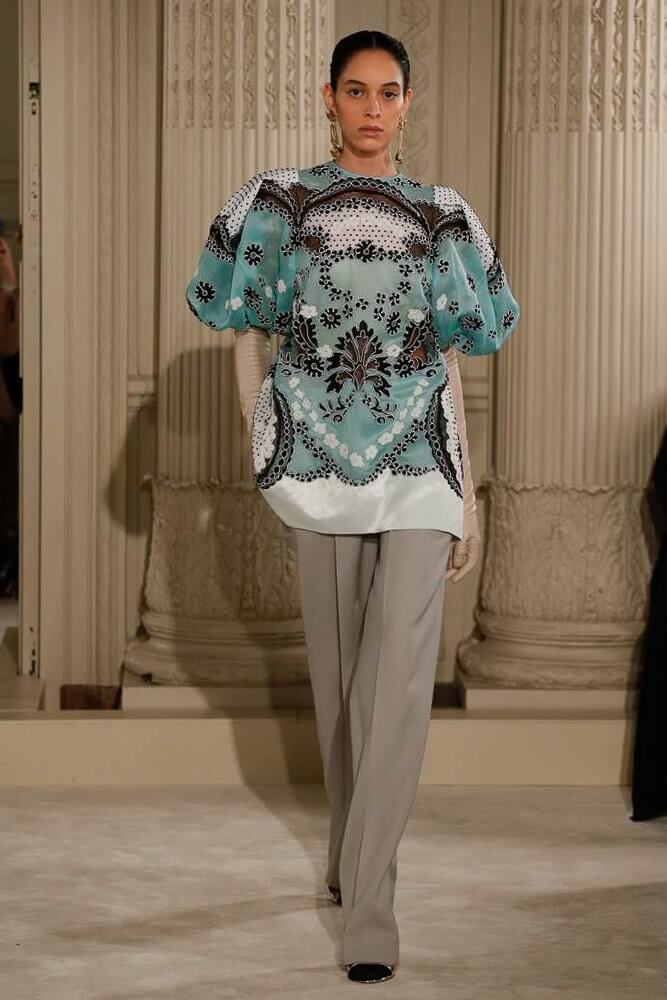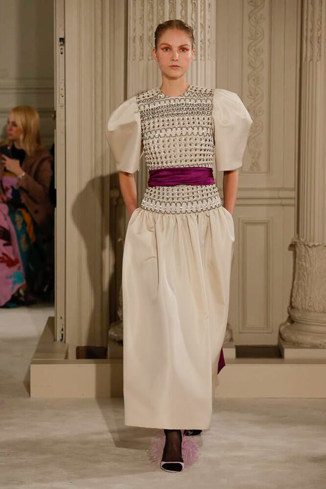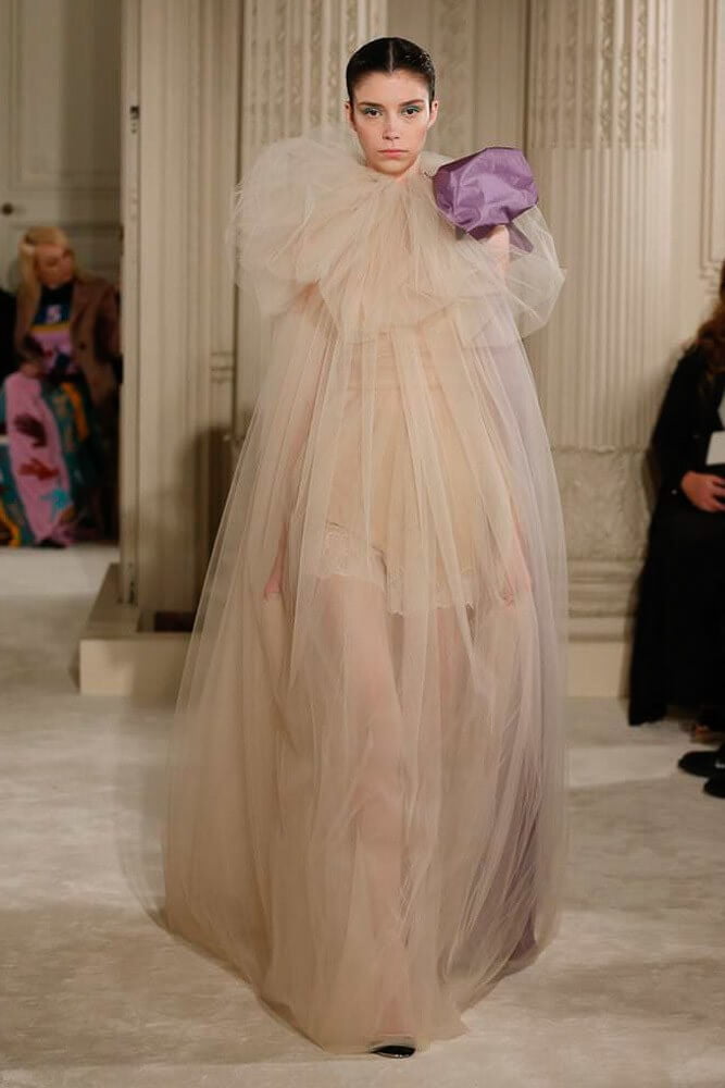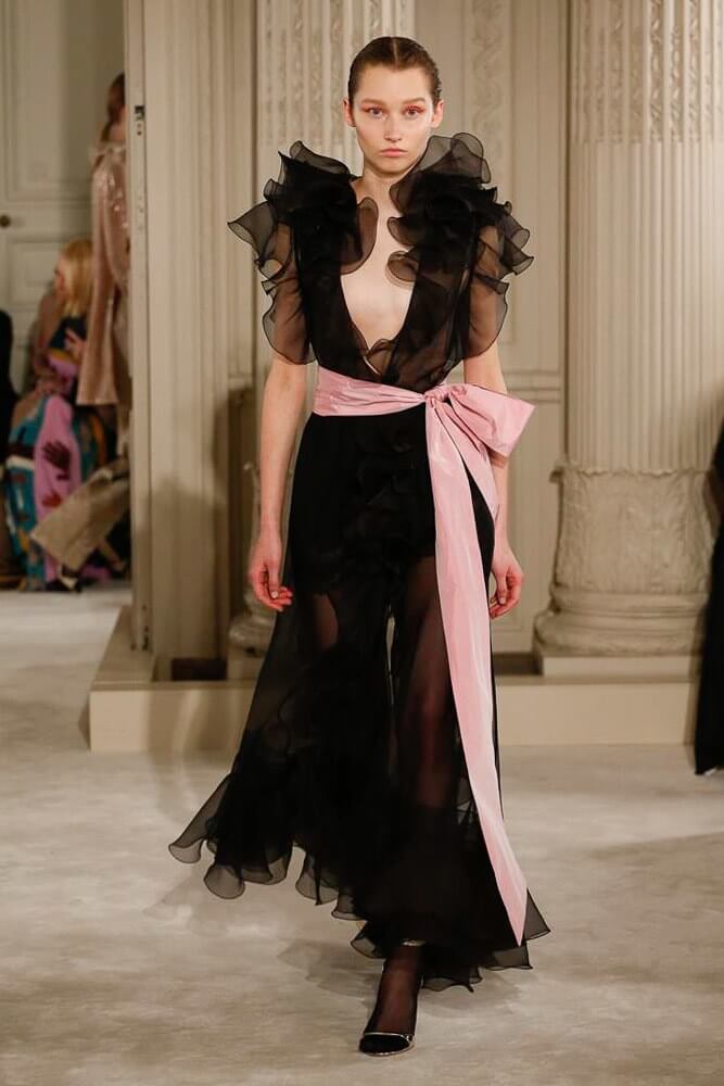 The most incredible colour combinations of couture week. Mint green met a blackcurrant purple and faded to mulberry, always ever so soft. The intensity of shocking raspberry pink, followed by chartreuse, and the Valentino signature- reds so rich and deep. The foil of ancient frescoes, kept it grounded, the whole lot inspired by Andrea Pontormo’s 16th century colour palette. The pieces reverberated through passionate colours. Swaggering details. Bows, like prom dress sashes hung loosely to the side or tied at the back. The hats, larger than life, feathers oscillating with each step designed by Philip Treacy made the drama. Oh, the drama.