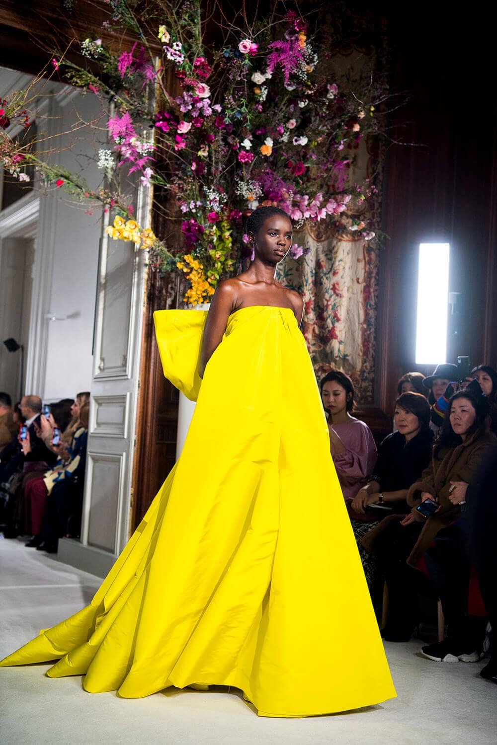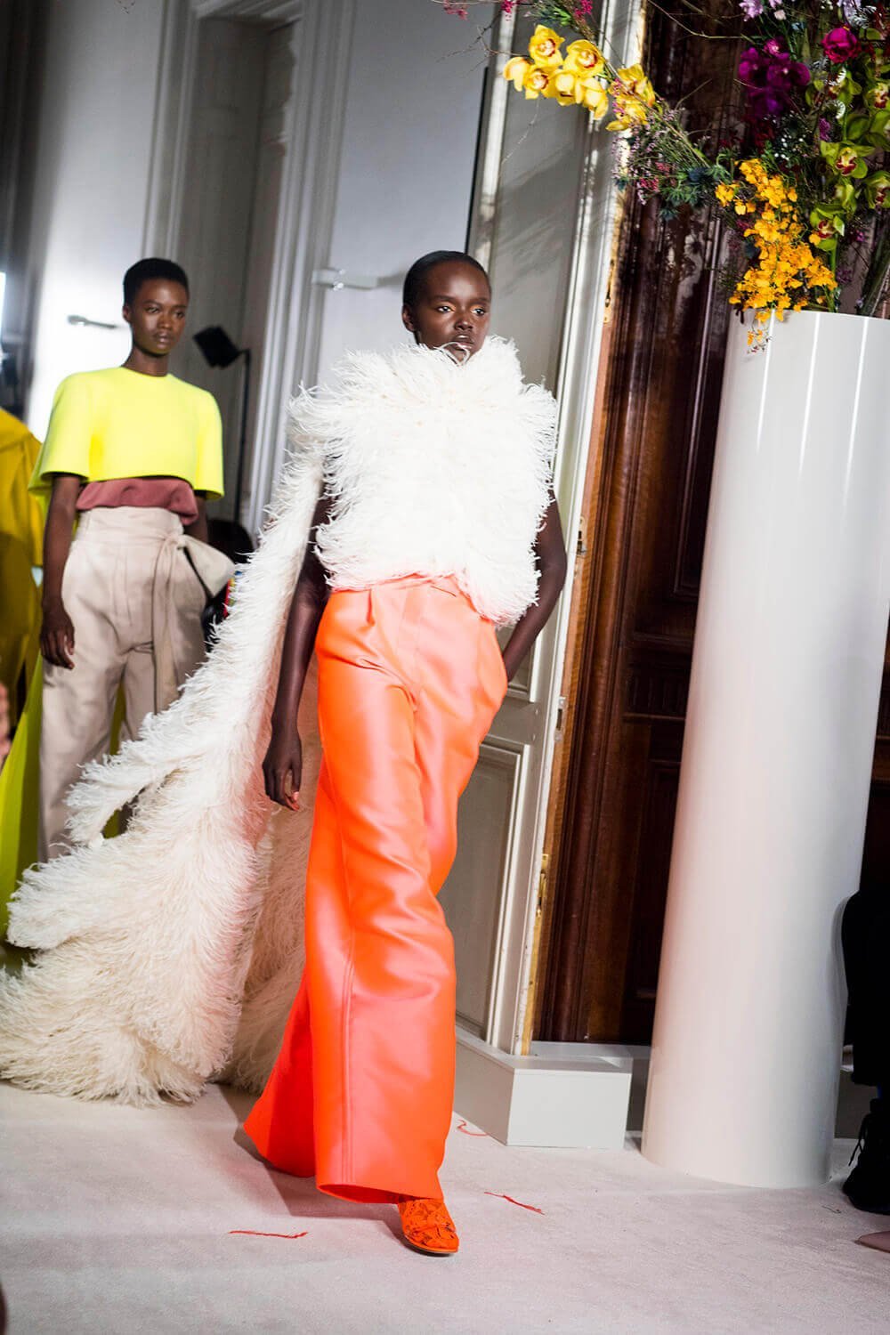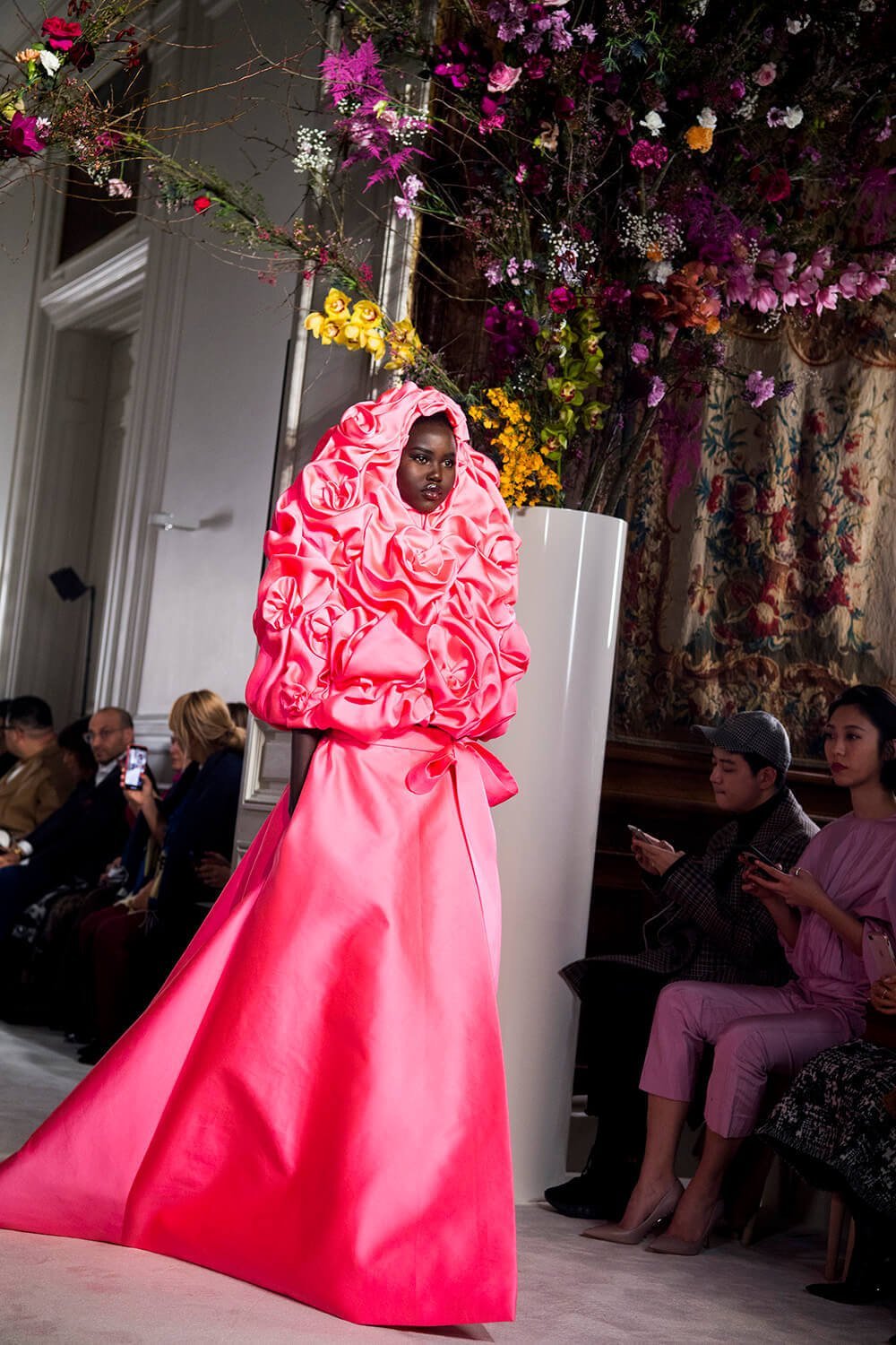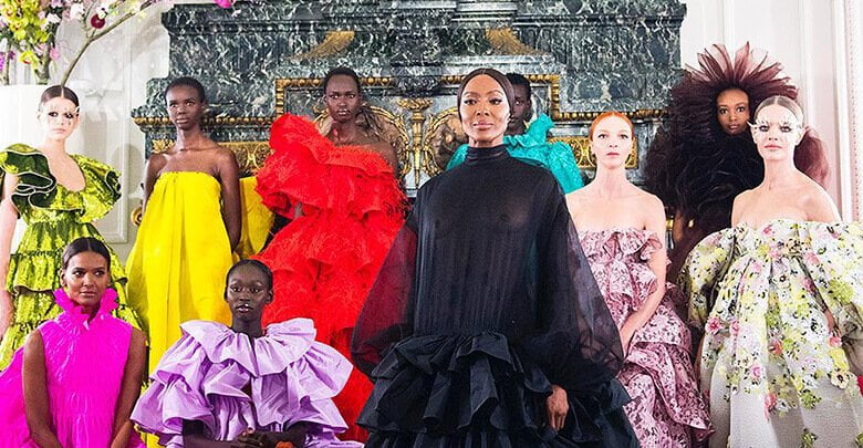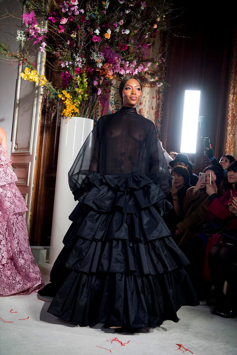 “The vocabulary, not the language, of Couture changes,” said the designer who took its traditional ruffles, frills, fringes and flowers to another level with his extravagant volumes. But it was his approach to colour – of his clothes and the models wearing them – that was particularly effective. Over half the models were women of colour. The designer explained he’d been thinking about the marginalising of black women both in the Renaissance art that inspired him and in the cannon of couture imagery that informs his work. He thought: What if Cecil Beaton’s famous 1948 tableau of a group of couture-clad models was recreated with black women? The results were breathtaking because each look was designed to complement and enhance the individual skin tones of the woman wearing it (this is where couture’s bespoke approach comes into its own). Their beauty was amplified. Naomi leading the way at Maison Valentino by Pierpaolo Piccioli SS19 Haute Couture.