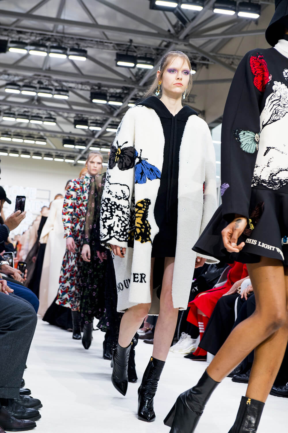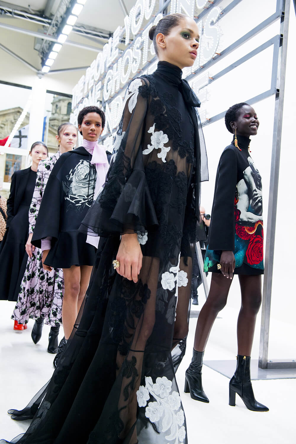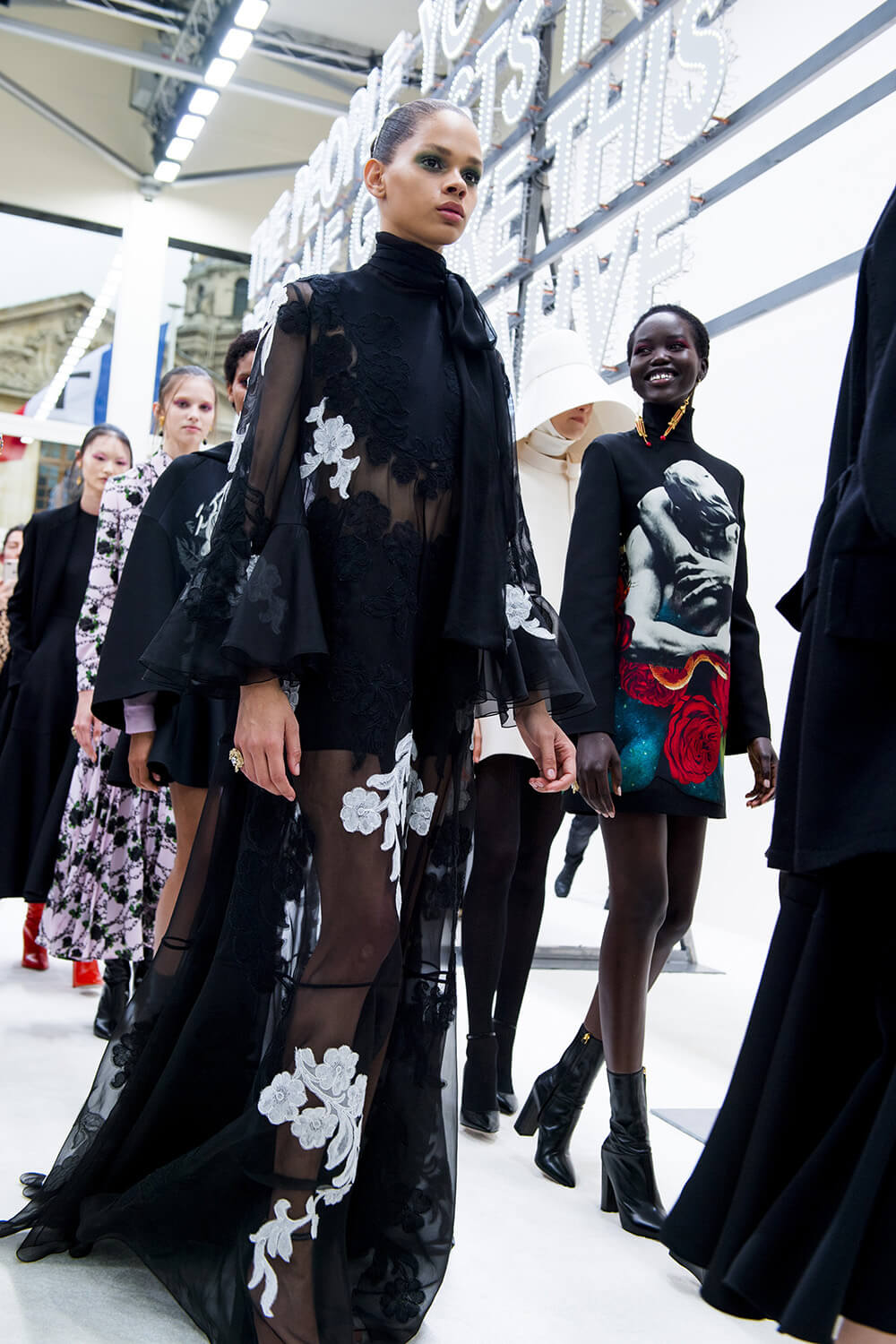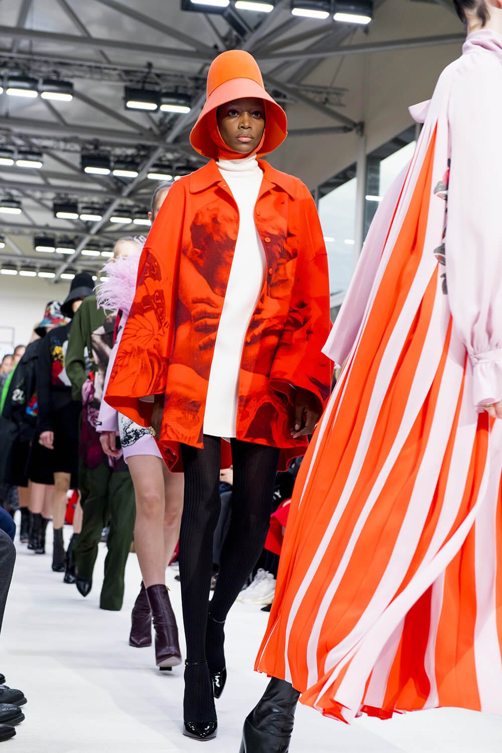 Pierpaolo Piccioli is not afraid of big emotion. His Valentino couture shows overwhelm his audience with their beauty and often bring hard-hearted fashion hacks to tears. He’s not about to let up for ready-to-wear. Love was the theme and expressing it was his aim. To that end, he enlisted Jun Takashi of Undercover to create collages and graphics of embracing couples and roses, which appeared on feathery party dresses, sweeping capes, trench coats and bucket hats (which are definitely a thing this season).