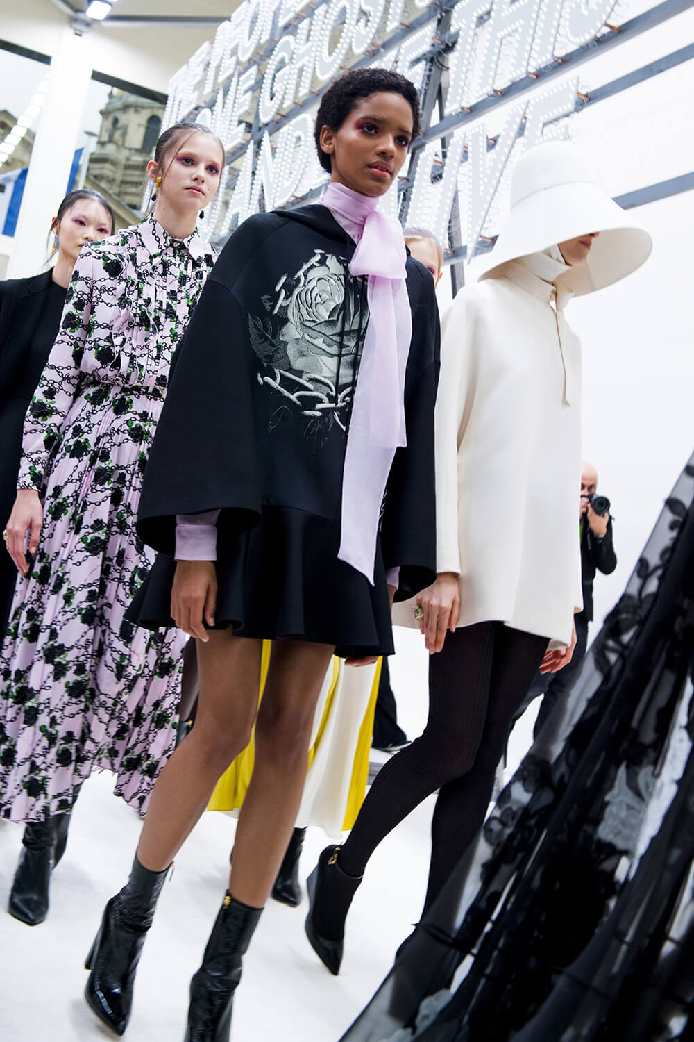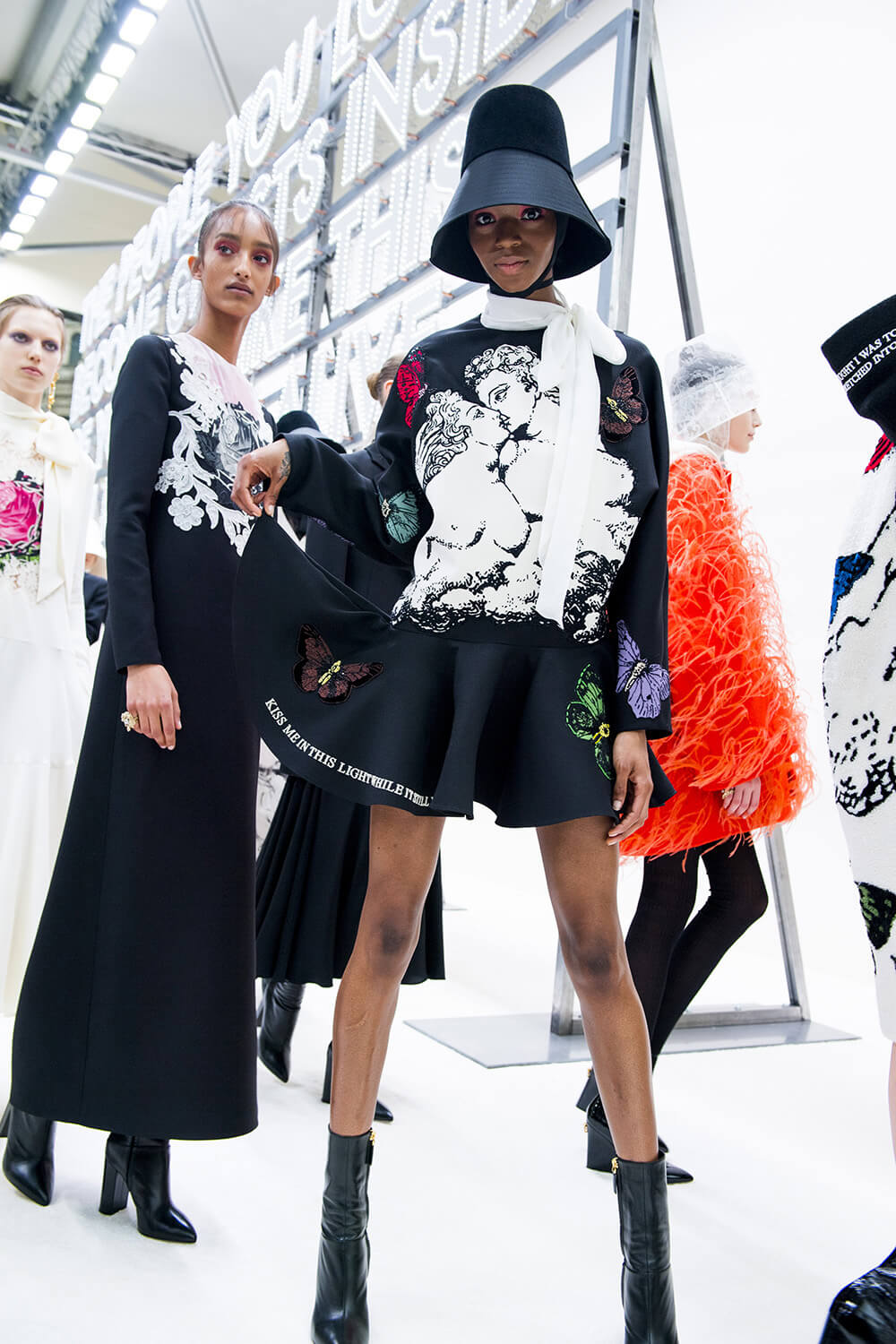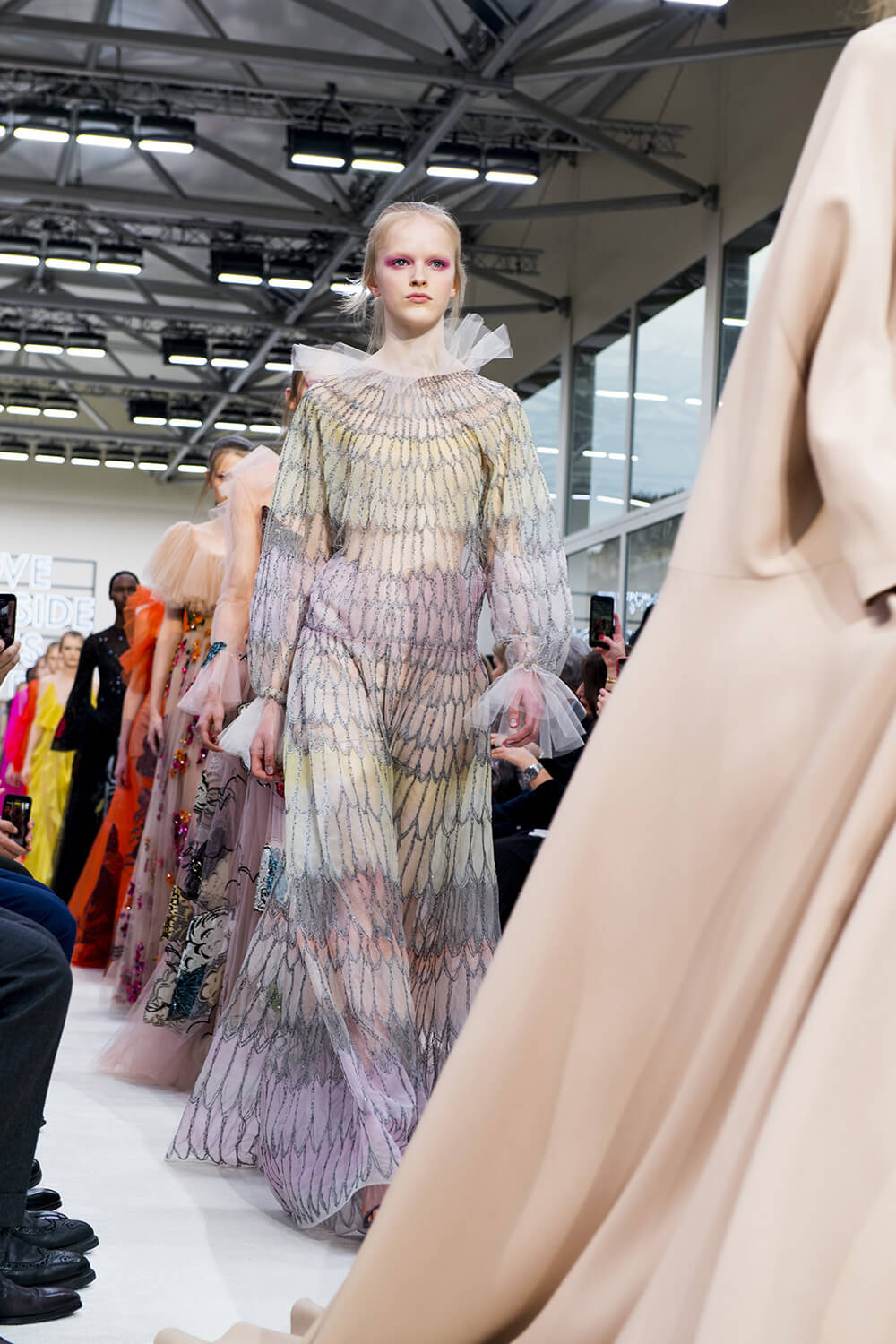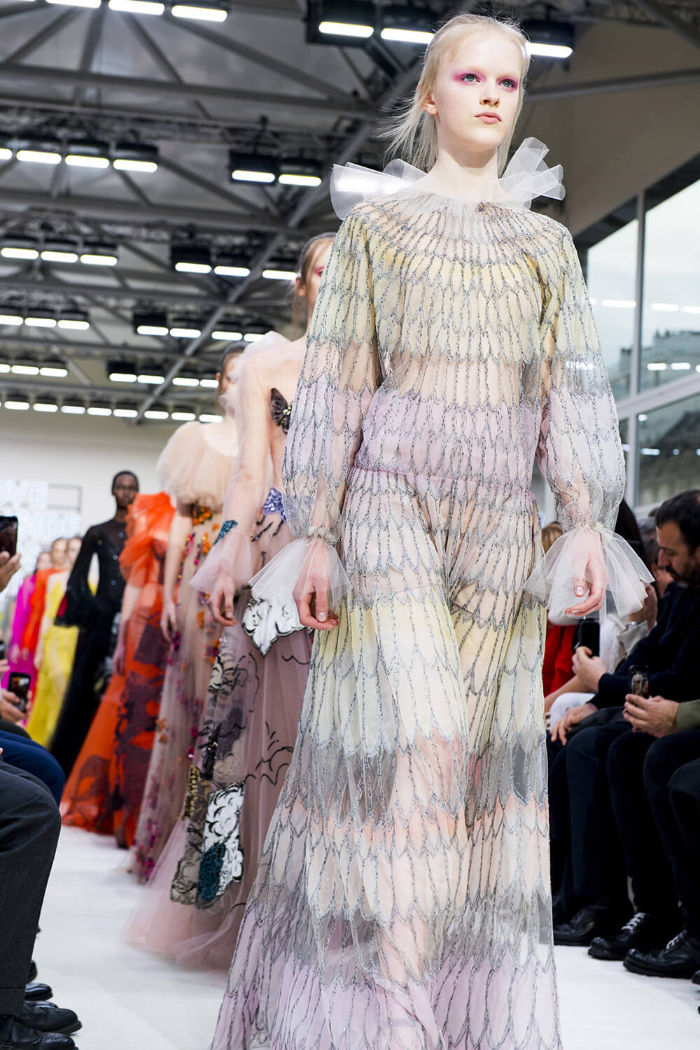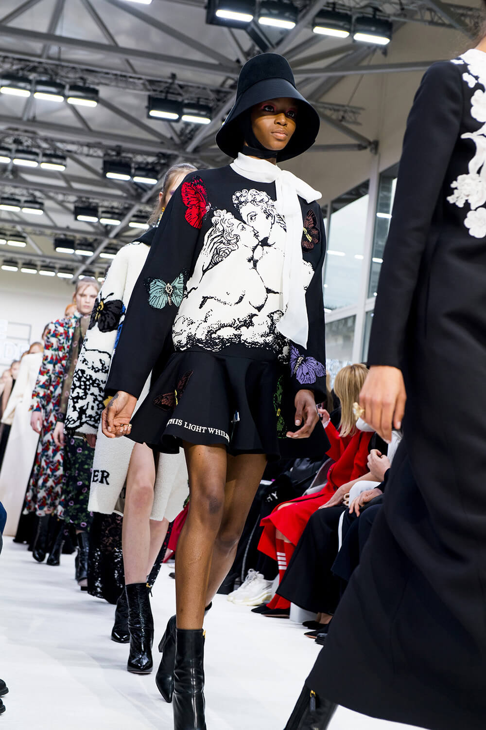 Pierpaolo Piccioli is not afraid of big emotion. His Valentino couture shows overwhelm his audience with their beauty and often bring hard-hearted fashion hacks to tears. He’s not about to let up for ready-to-wear. Love was the theme and expressing it was his aim. To that end, he enlisted Jun Takashi of Undercover to create collages and graphics of embracing couples and roses, which appeared on feathery party dresses, sweeping capes, trench coats and bucket hats (which are definitely a thing this season).