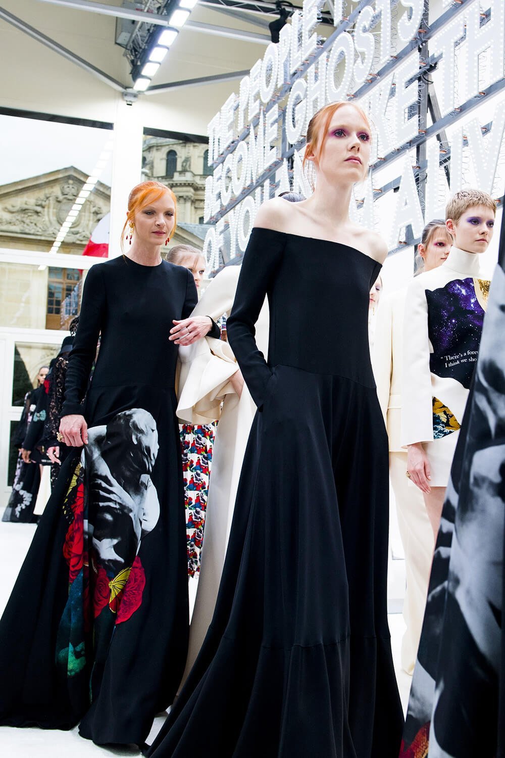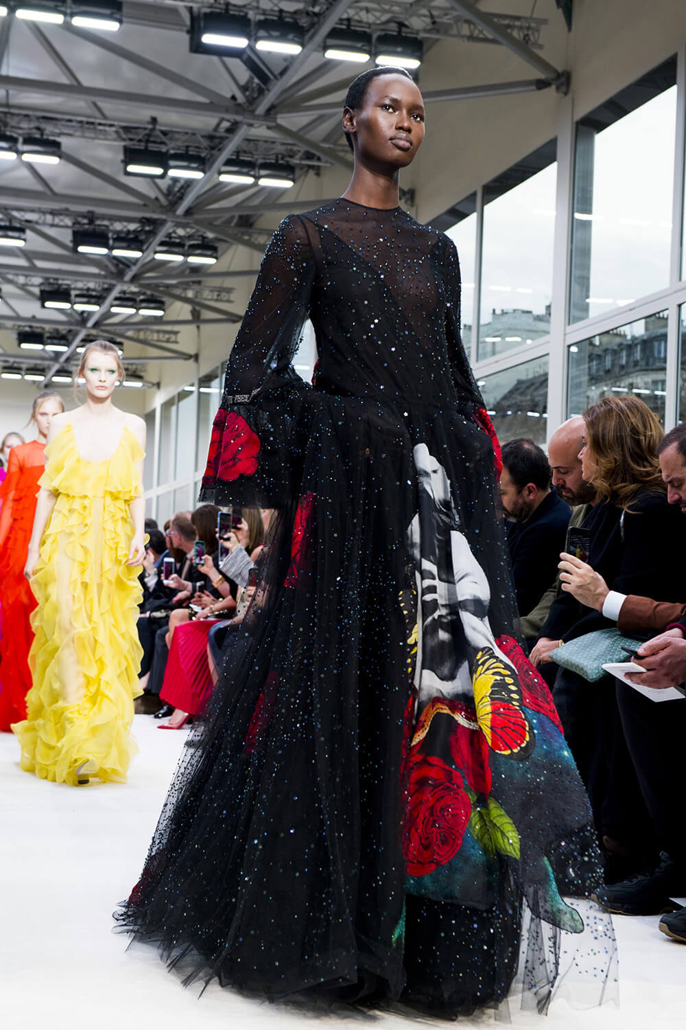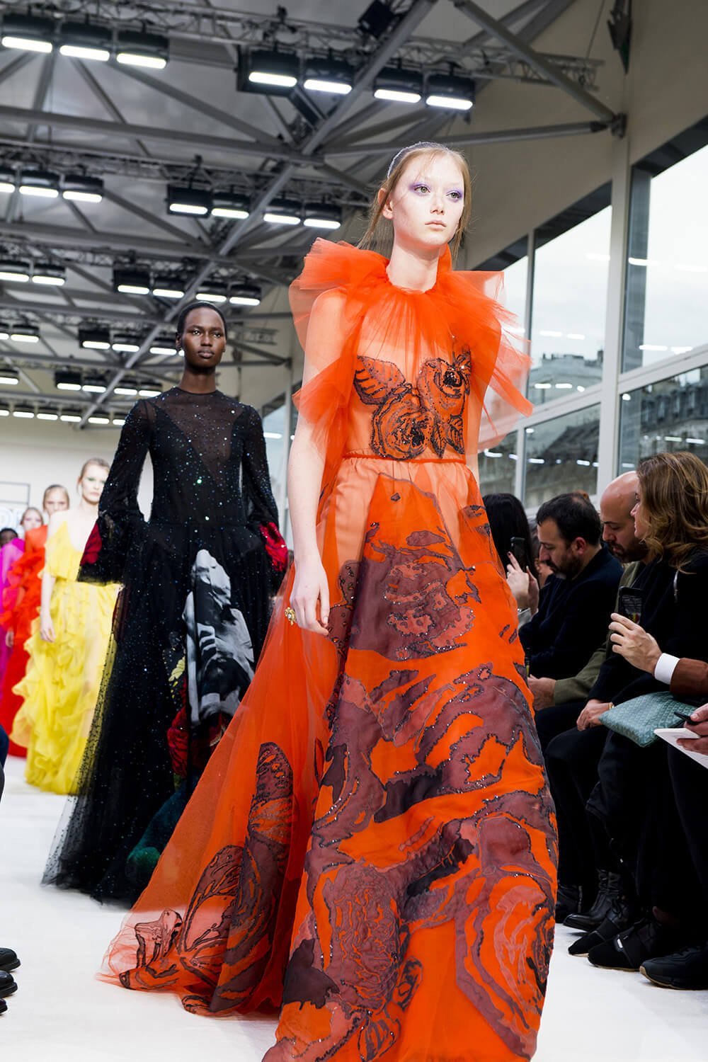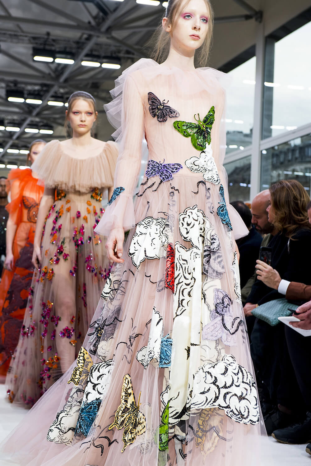 Pierpaolo Piccioli is not afraid of big emotion. His Valentino couture shows overwhelm his audience with their beauty and often bring hard-hearted fashion hacks to tears. He’s not about to let up for ready-to-wear. Love was the theme and expressing it was his aim. To that end, he enlisted Jun Takashi of Undercover to create collages and graphics of embracing couples and roses, which appeared on feathery party dresses, sweeping capes, trench coats and bucket hats (which are definitely a thing this season).