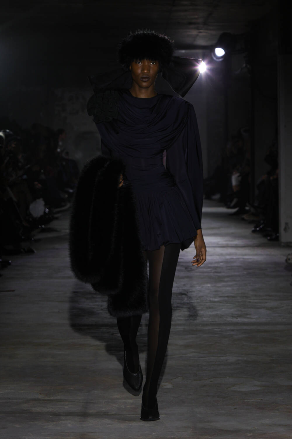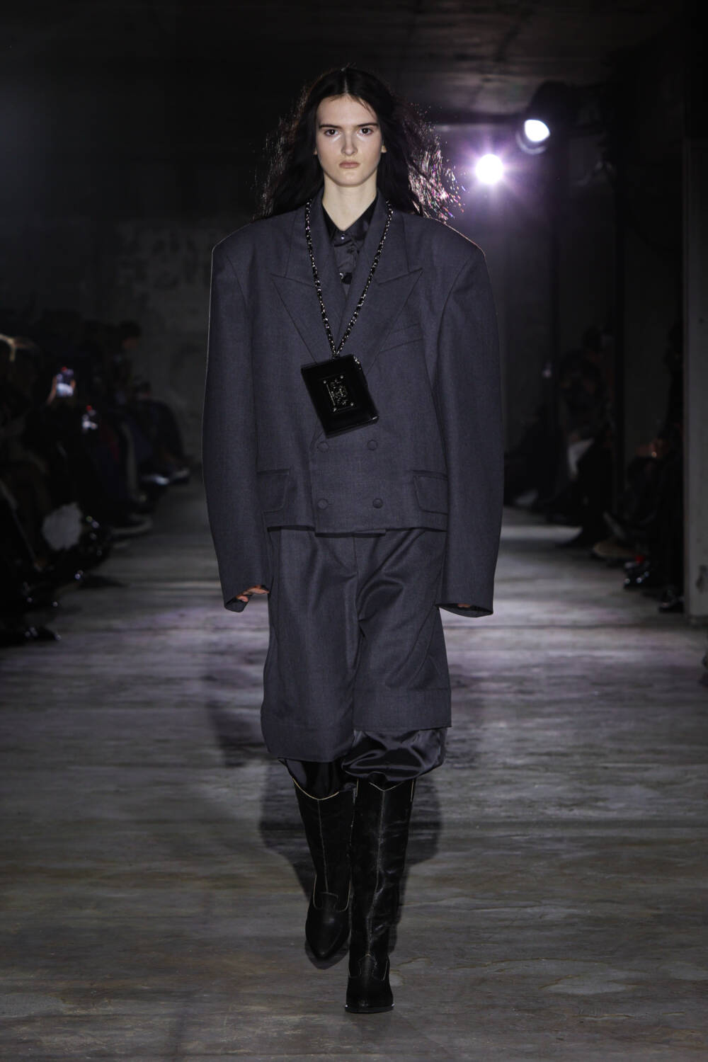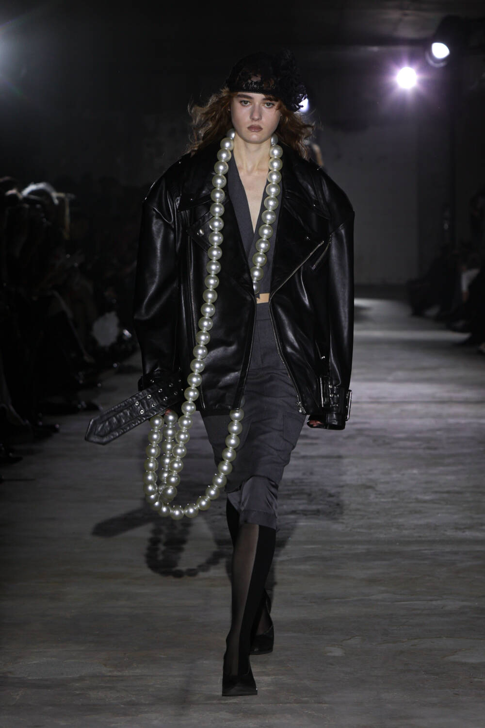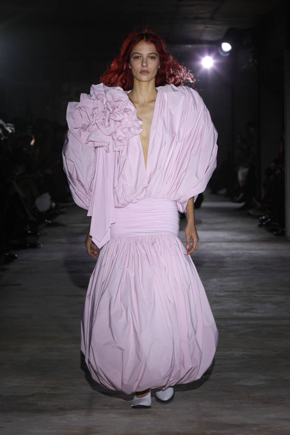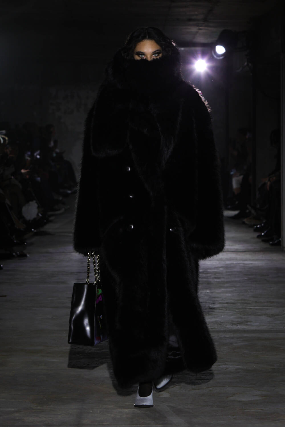 With a focus on wearability, silhouettes – inspired by 1920s and ‘80s Americana – were oversized and exaggerated from lapels and belts to colossal faux fur coats and bulbous taffeta pouf dresses (adding pops of pink and white to the otherwise muted line-up) – almost everything was blown up to cartoonish proportions. Gargantuan pearl necklaces, for example, were slung over entire outfits, commanding attention and adding a touch of antiquated opulence. In that same vein, a mid-century-style brassiere looked as if it’d been constructed for a giant, and was worn with the model’s head through the arm strap and the cups careening off the body like a fluid tunic as opposed to a piece of lingerie.